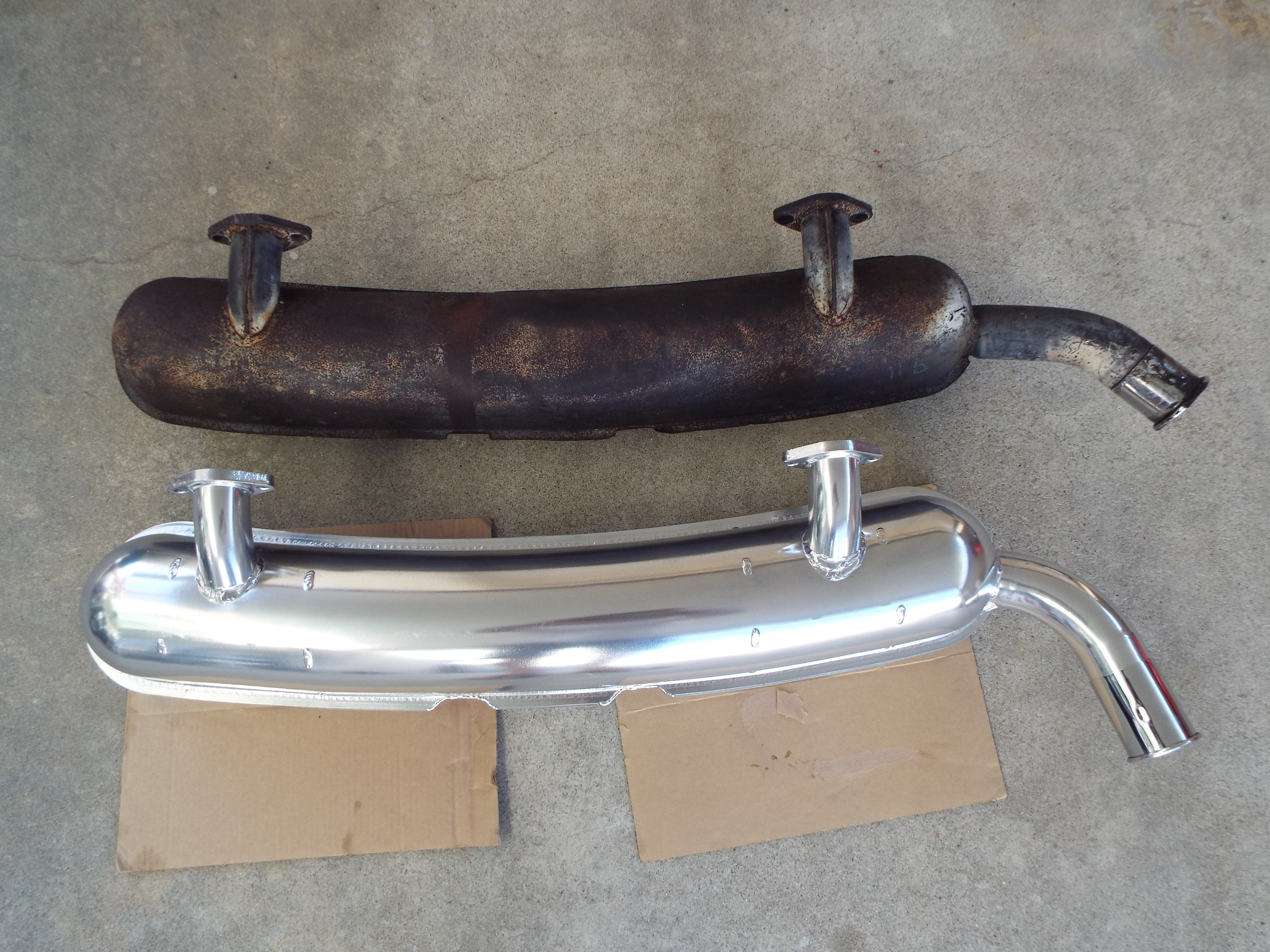 Keep it up, answering a lot of questions I will more than likely have myself. BTW, seeing you grind the chain with an un protected hand, brings back painful memories. Stephen thanks for the encouragement and good point on the grinding! My original muffler plan was to rework this older 911 muffler 2 in 1 out by re-positioning the tail pipe for 914-6. I was also considering hollowing it out as well but never got that far. Decided that since I am in this deep that I would just treat myself to a new Dansk. Got a decent deal on Ebay. Then since I had ceramic coated the one for my SC I did this one too. I know it is not stock looking but neither is the rest of the car and I like the look. Matches the ceramic coated headers but muffler has a better finish. |