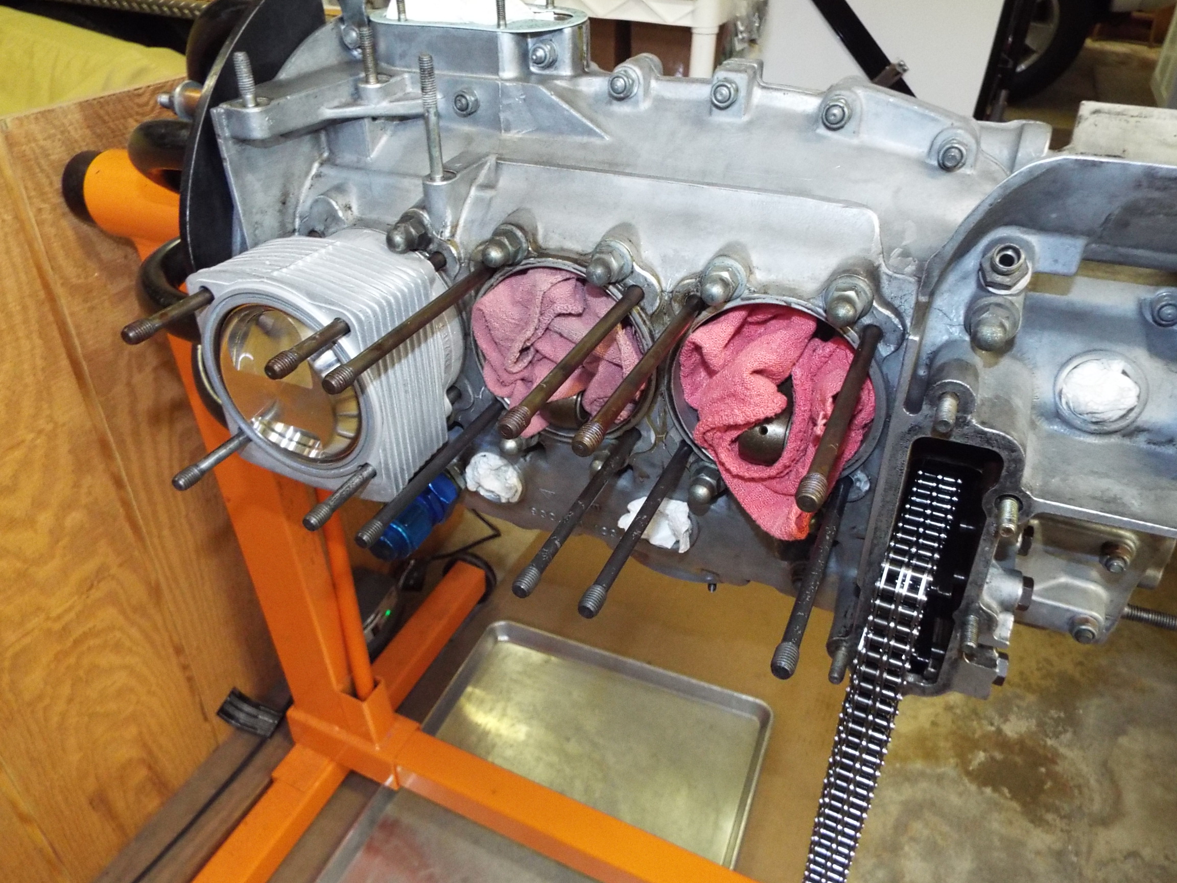 Great to see brain damage similar to mine on the way to a screaming 3.0 Weber driven 914. Do what you have to do and build to the highest bar your budget will allow. Once you crack open the case halves, replace everything and sleep like a baby. (IMG:style_emoticons/default/beerchug.gif) Yes forrestkhaag misery loves company and there may well be brain damage involved! Thanks for the post and I like the looks of your engine. To reinterate the point here I started the engine late April and did not start posting again to my thread till about Aug 15th so most of the work on engine build is done now, case splittting ship has sailed. I had not posted during the April to Aug time frame cuz progress just seemed so darn slow with so many set backs and I didn't really have the time or inclinaton to post so I am trying, with still limited time, to bring the thead up to date. In some ways it is a better perspective with before and after pics. And I happen to be waiting on parts again! I based my decision not to split the case on the health of the cam bearings and rod bearings and group think that the bottom ends are pretty stout and good for several thousand miles. Glad you did tho and hope like hell I made the right decision. Might not be sleeping like a baby. ____________________________________________________________ After an enormous amount of research, cleaning and prep, and parts gathering, the reassembly finally begins July 5. But there was one final delay to get to this point of actually putting the cylinders on. I opened up the Victor Reinz gasket kit and found the cylinder base gaskets were black! I decided to go with some expert advice and order the copper cylinder base gaskets, as opposed to the black. Once more thought I was ready to go only to have to wait for more new parts to arrive. Ugh! Long time Porsche engine builder friend says he does not like the black ones and relies only on the copper. I am not going to argue! First piston and cylinder here we go…. Pistons and cylinders on and secure. This is a good point to mention the cooling shrouds being installed correctly. They say if installed upside down it can lead to over heating and the that design change that was made to remove material about 1977 supposedly lowers engine temp 15 degrees. And, it is easy to put them in upside down! Oh and you really can’t get them off to fix it later as the drain tubes are in the way. Word to the wise. |
