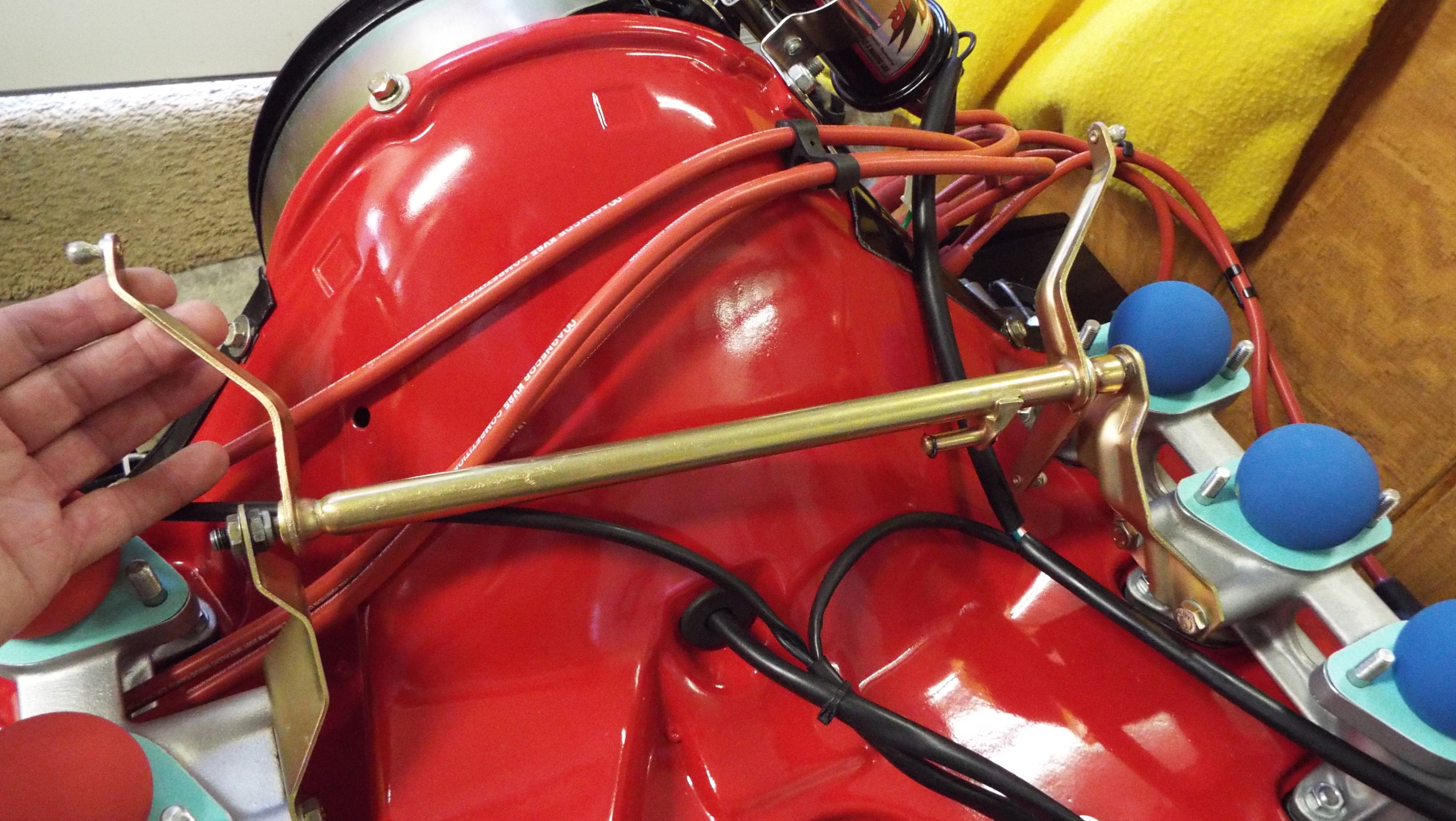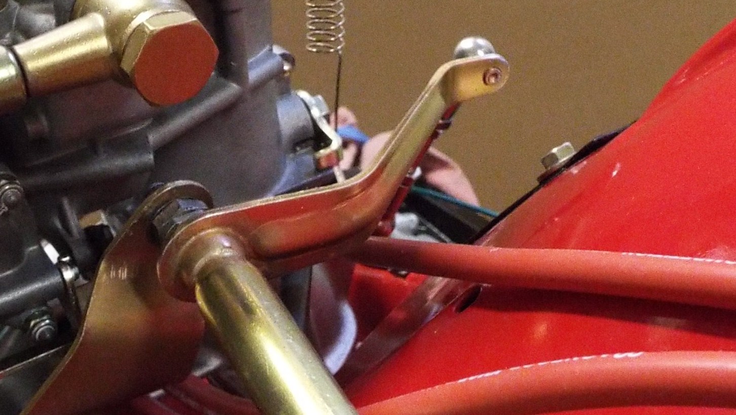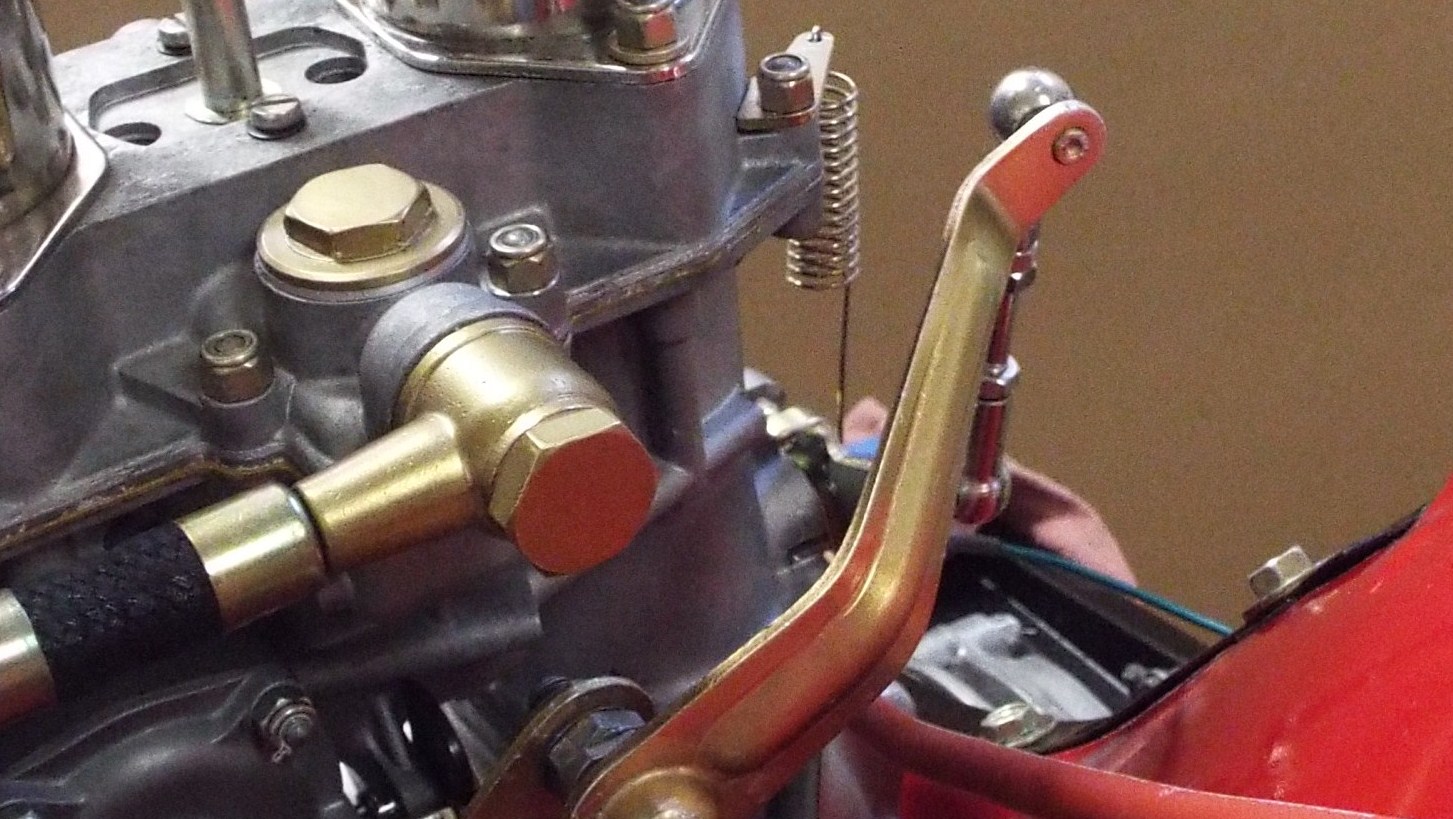 I found this to be about the right position as shown. Note inboard arm just a little past 12 o’clock and outboard arm a little past 3 o’clock. It is important that the outer arm not be much higher than shown as the arm should be beginning the downward movement. Your arm may be different. While at the same time the top triangular reverse lever almost horizontal across the top. So, you have a hand on the trans end and the other hand on the upper pivot and you can feel when the linkage if is over extended and there actually is kind of a sweet spot and of course checking for binding. Adjust the long link as necessary to achieve. Now remove the long accelerator linkage going to the trans and install the piece of linkage running from the cross bar to the reverse lever and check that for free movement. Note the linkage is set to have the triangle reverse lever flat across the top and the attachment arm on the cross bar is vertical. This link is critical to the set up. You may have to play with this linkage arm, because it is a very fine line between too long and too short, as it really affects the arms that go to the carbs from the cross bar. I actually think this arm on mine could be longer because I only had about 6 tread engagement at both ends. A little longer makes for longer arms at the carbs and my carb arms ended up very short. |