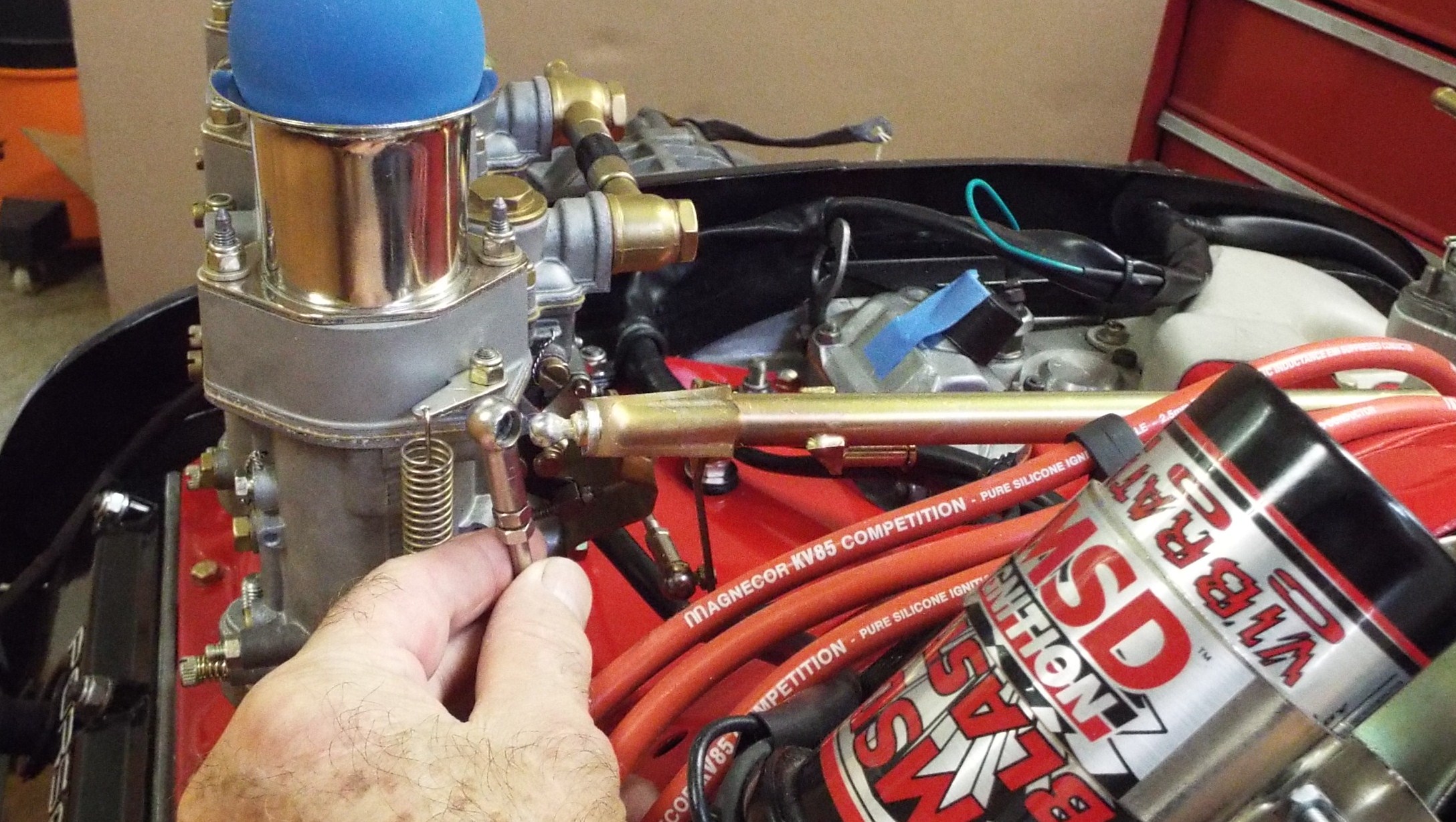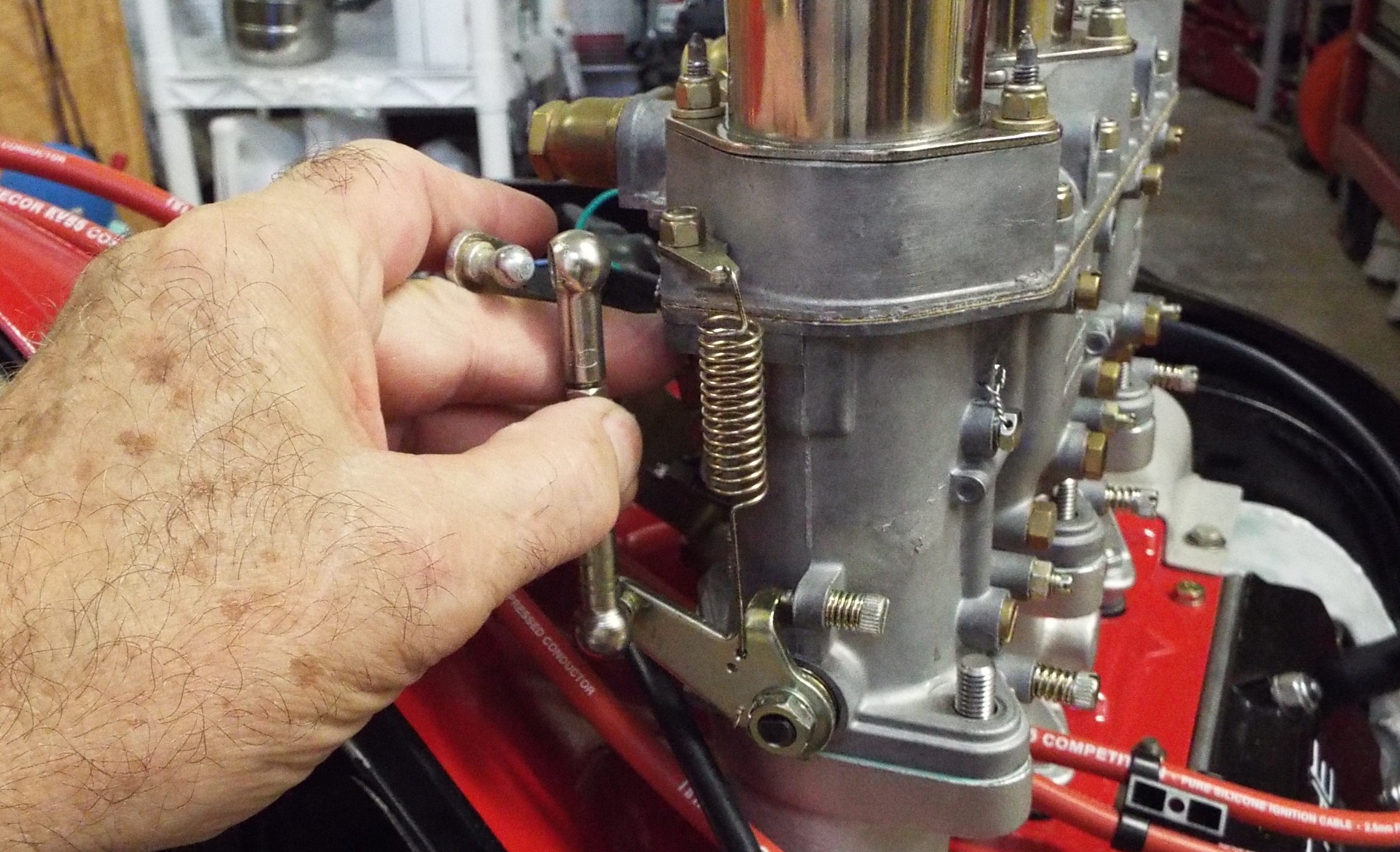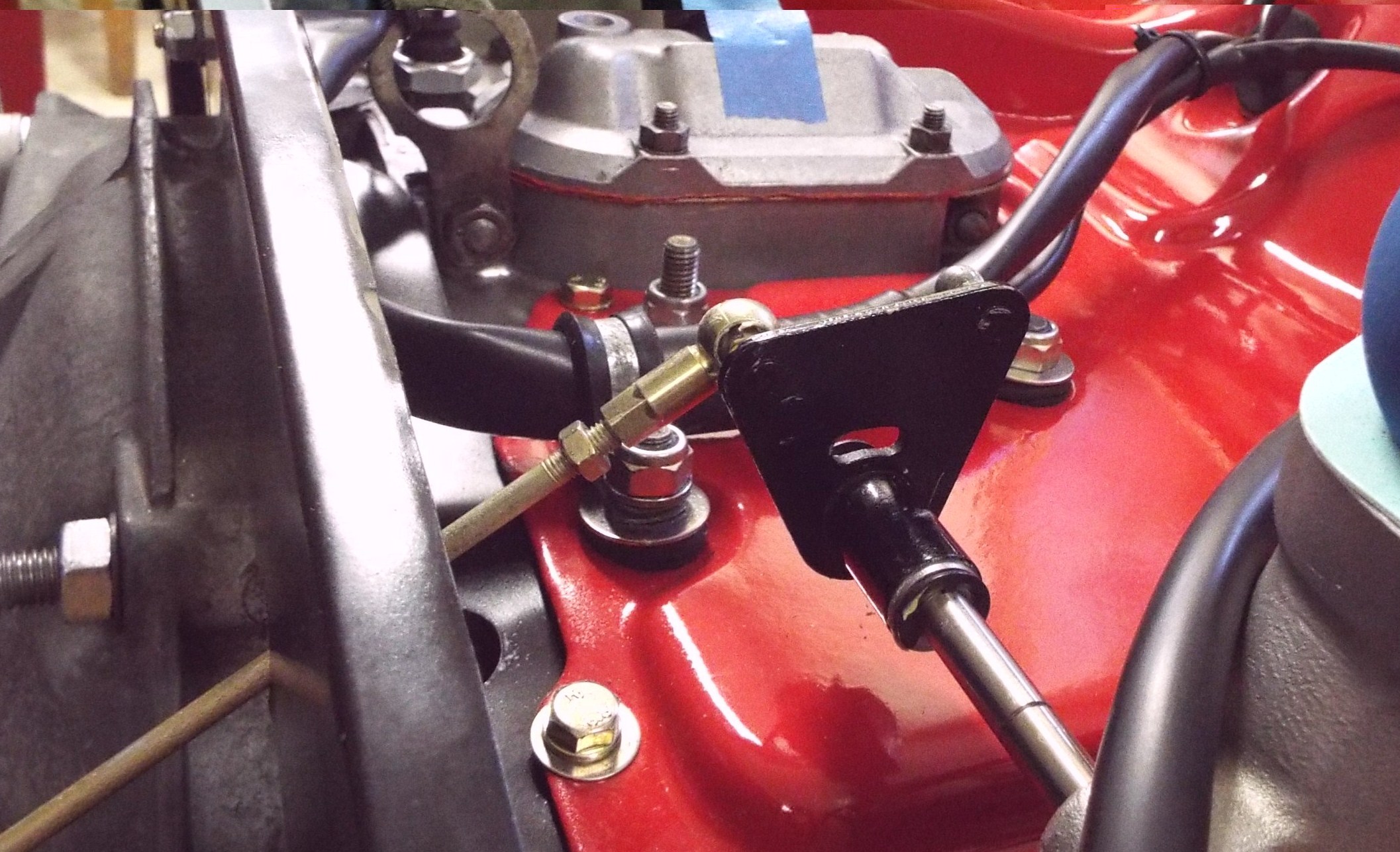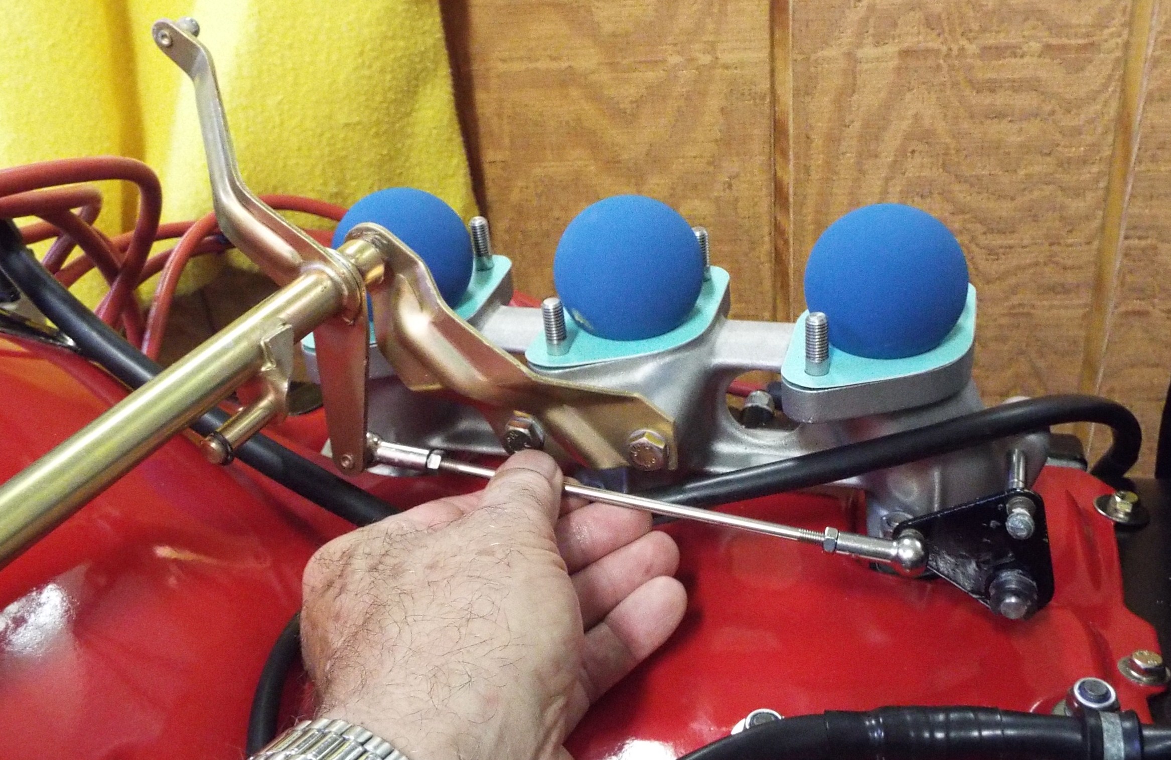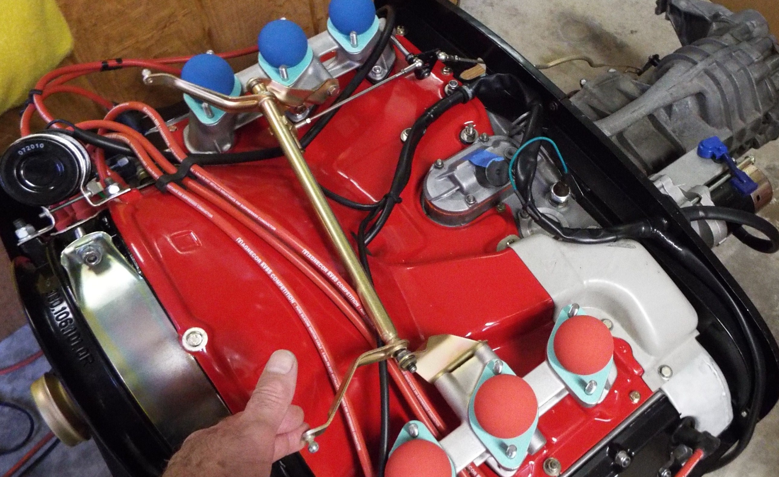 Disclaimer on the following posts “my linkage may be different than your linkage”. Thought it might be a good idea to check out my carb linkage while the engine still easily accessible. Turned out to be one of the best decisions I could possibly make! As I got into it I thought I would document my Weber carb linkage set up. Maybe someone has posted it on the site already but I couldn’t find it. I am a lousy searcher. I learned so much in the process and if I had waited to do this after the engine was installed I would have been up and down and a half million times and needed a second person to help and it would have been a real pain in the ass! I can see that now. To Start: Tried to put my linkage on. Didn’t get far. Unfortunately my linkage has been sitting for several years now and that sitting had taken its toll. The linkage arm ends that go on the pivot balls were dried out inside, and they were corroded plus that little cir-clip inside the linkage arm end that captures the ball was non functional. Stuck in its groove. OK so stop right there and clean up every linkage end and polish up the little pivot balls. Unfortunately, I neglected to take pics of all that ugliness. Key is cleaning all linkage attachment points and applying a good grease to every moving part. While you are at it, make sure the rod ends work freely in the threaded part of the linkage arm end as well. Mine did not, some only screwed in half way. Make sure they actually screw in all the way because you just may just need that last bit of thread as I later discovered. WD40 is your friend here. I needed to turn a difficult/ stuck rod ends and a 10 mm open end wrench works great for that. Protect that rod in a vise. Next step, install the brackets for the cross bar to the intake manifolds followed by the cross bar. As you know these are new intake manifolds in my case so who knows how this will go? I mean this was all together once but with different manifolds. Should still work though, right? Now with the uprights loosely installed and grease in the sockets and also on the cross bar ball ends, tighten the bolts to the manifolds. Nope, not even close to rotating freely. Bit of tweaking on the uprights to release the inward pressure on the bar to free it up but still just enough tension to keep it well contained. |