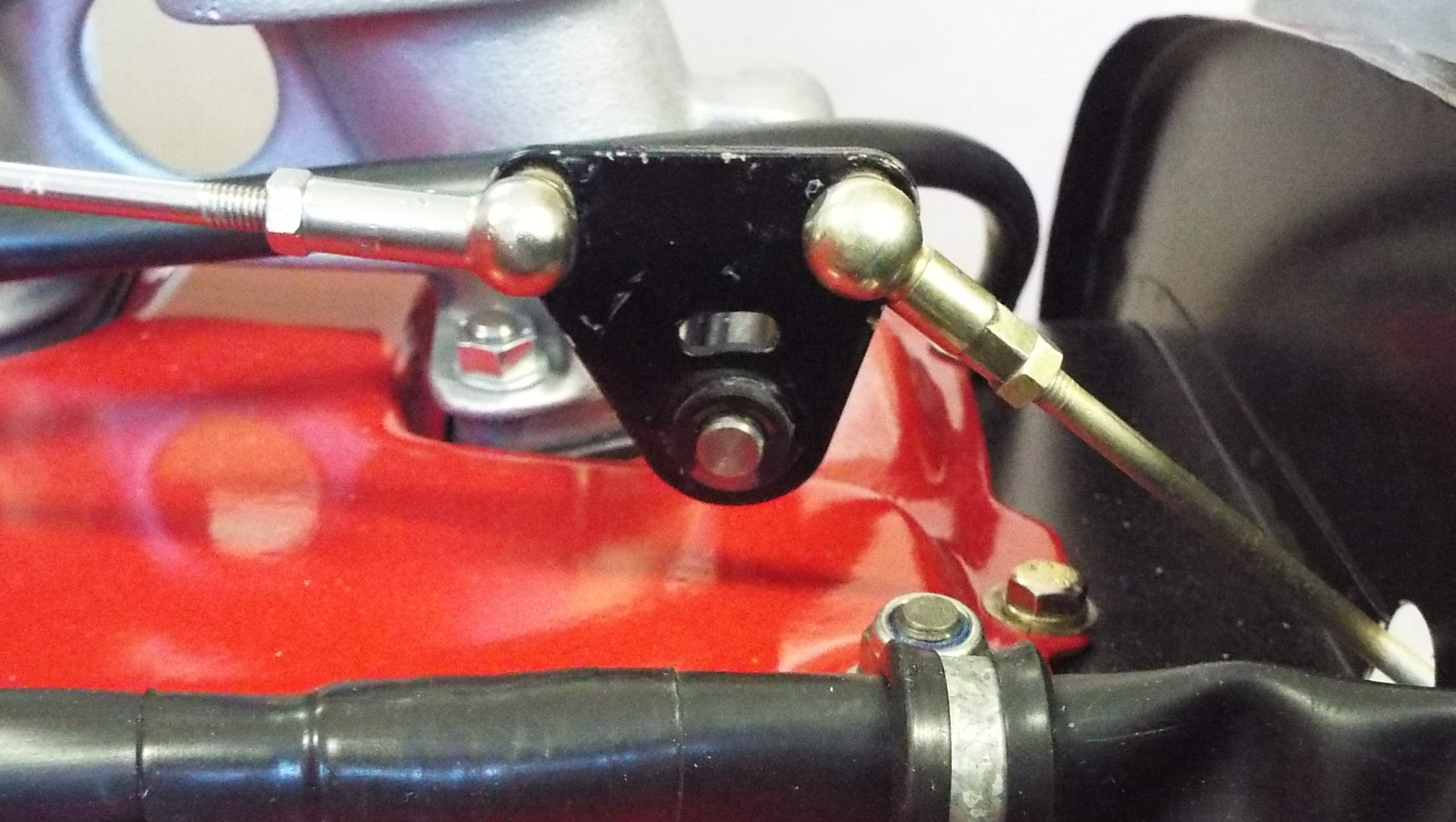 All linkage has now been checked for free movement and is together. Now try to hook up ONE carb link to ONE carb and I started with the right carb. I chose this carb as it is the furthest away from the linkage on the other side of the engine/ trans actuator. Adjust the carb lever arm to maintain the locations of triangle reverse lever and trans pivot noted earlier. Note how the top of the triangle reverse lever is level across the top making sure it ended up where I wanted it when all assembled. While making adjustments, disconnect the carb arm when doing so, and re-set the carb link length when done. My 2 cents. |