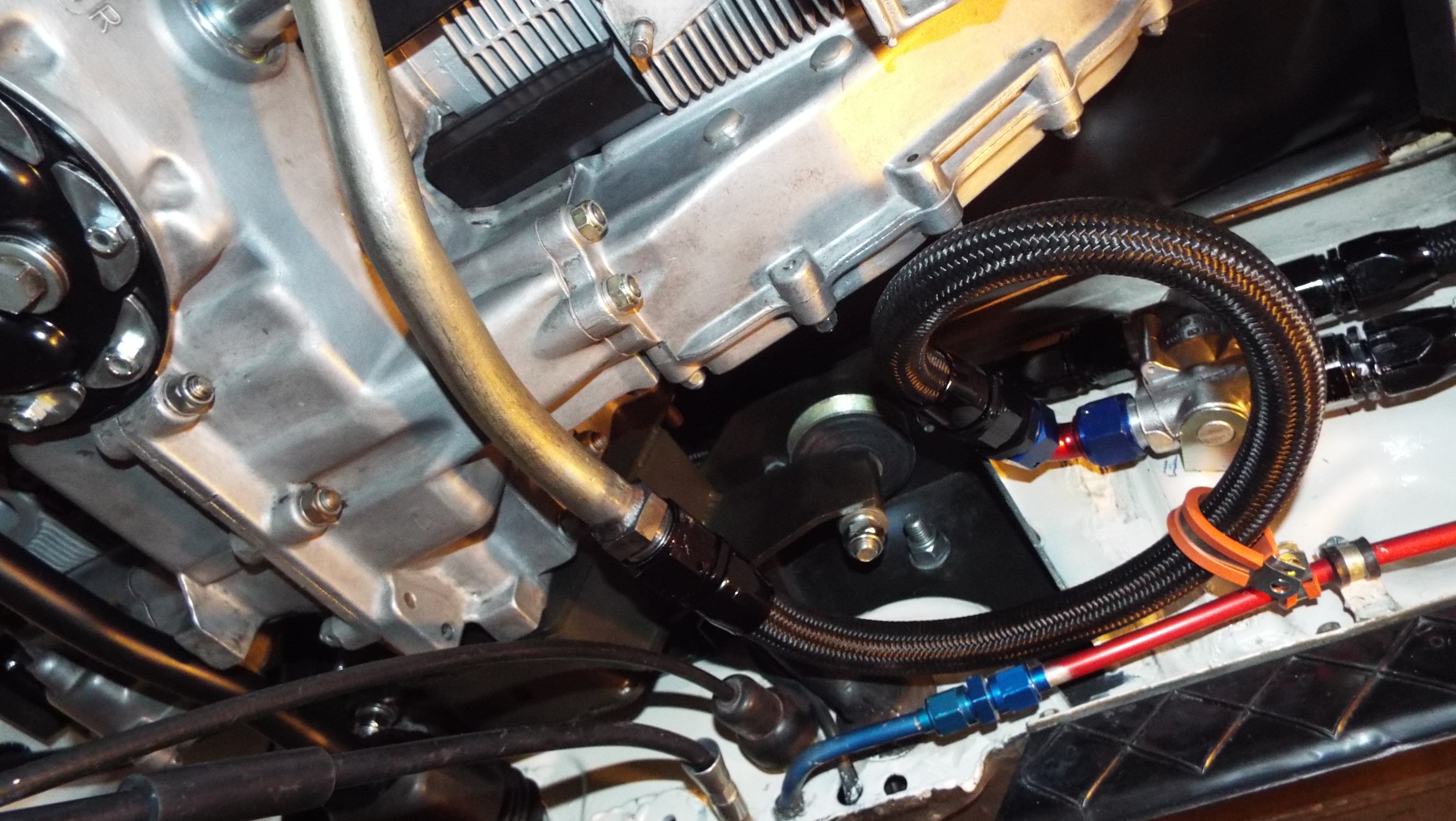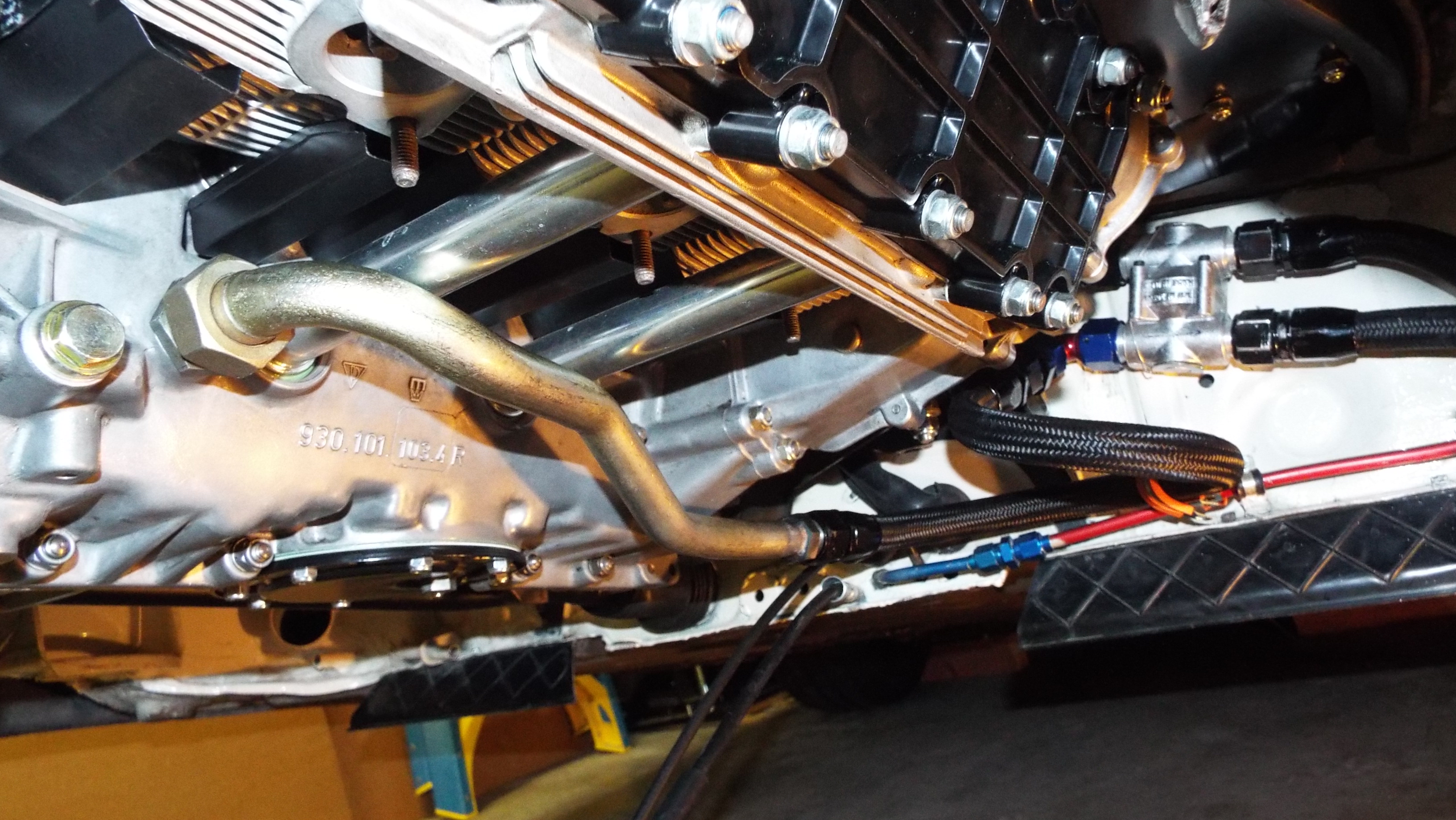 A couple years ago when I ran the AN12 front oil cooler lines through the heater tubes to the engine bay it all made sense and I liked it. Having an elbow coming out of the thermostat right next to engine mount seemed tight but ok. Now, with the engine in place that hose is a bit of a challenge, and like Learmo63 says, the fewer the elbows the better. I always liked an original 911 hard line concept; tight bend out of the block, close to the engine and drain tubes plus away from headers. So I shortened a 911 hard line, bent, and had a fitting tig welded to the end. This hard line is similar to the PMS line they sell for $160 and I did it for $42. I had the line cut 2 years ago just waiting for the engine install. Have to say the first hose approach was a bunch of close proximity elbows and it was nuts. The big spiral approach is going to be it! Just a bit of clamping and I’m done with oil system. Seems like baby steps but progress none the same. And many thanks to my hose"guy" I’m not there to see this in 3D but I wonder if a 45 degree fitting on each end of a short piece of line would connect without the loop. Or keeping the 90 on the thermostat and adding a 45 on the oil pipe. Yeah it looks like it would work with 45 deg from the pic I know what you mean. The end coming out of the 90 at the thermostat and the end of the hard line were only 7 inches from each other and with 90's on them they were in the same plane. Not a lot of real estate to work with. I really don't think there was room for 45's and then more 90's just didn't make sense and even that wouldn't really work either. Thanks for looking in. Edit to add picture to show how tight it is against the engine mount right now I have a piece of rubber in there for cushion. if anything the elbow coming out of the thermostat could bave been like 75 degrees. The mount is coming down at an angle. Hope this helps. |