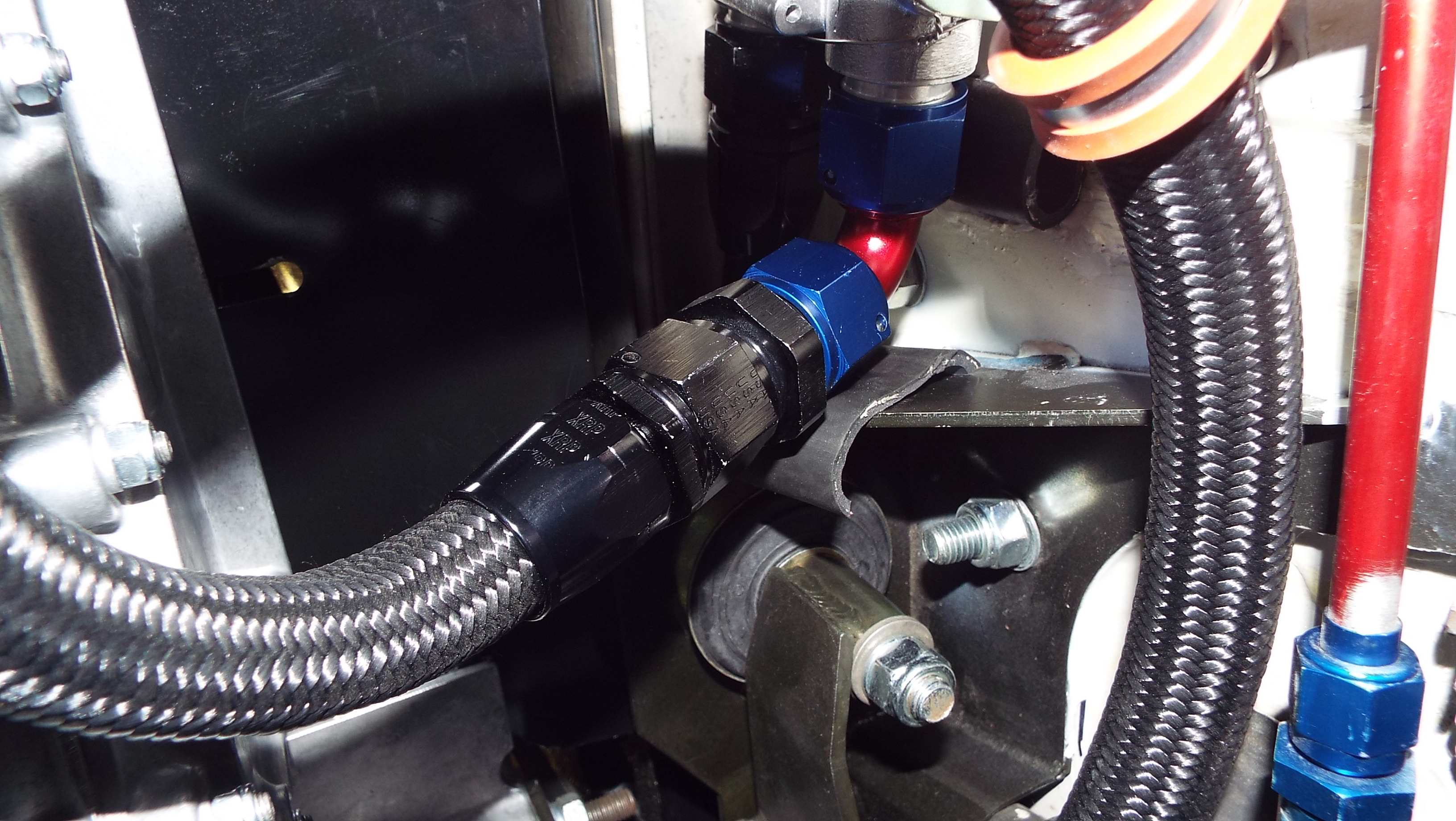 You should be okay with that hose there, just mock it up and have your guy make it. The less unions in the hose, the better. Looks good!! Thanks! Last couple of days have been dedicated mostly to oil lines, the last 2 braided oil lines that is. Mocked up and then made by my “guy”, well actually it's a she and she has made several really accurate AN hoses for this car in the past. Next post has the details. and yes less unions is the goal! |