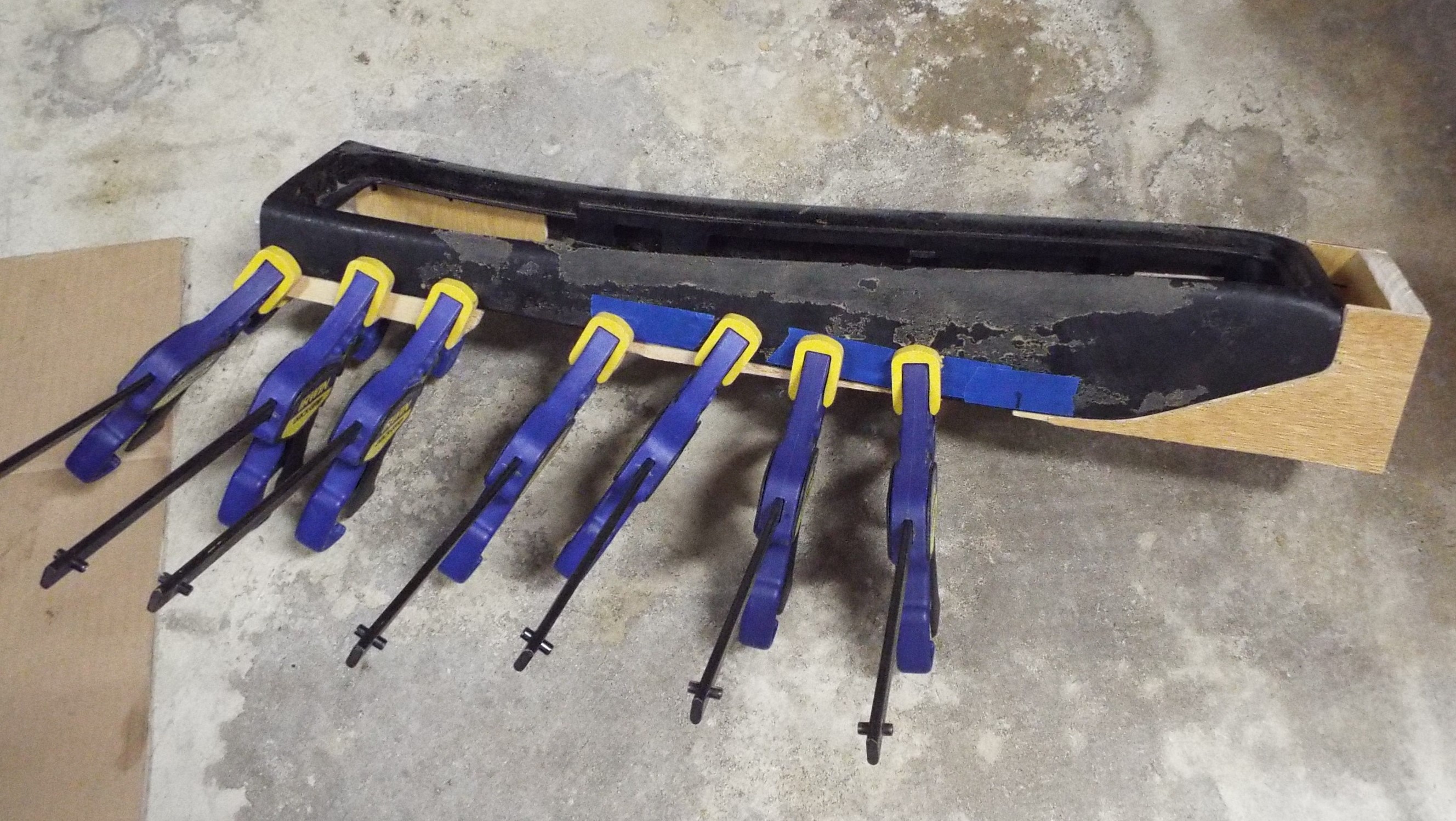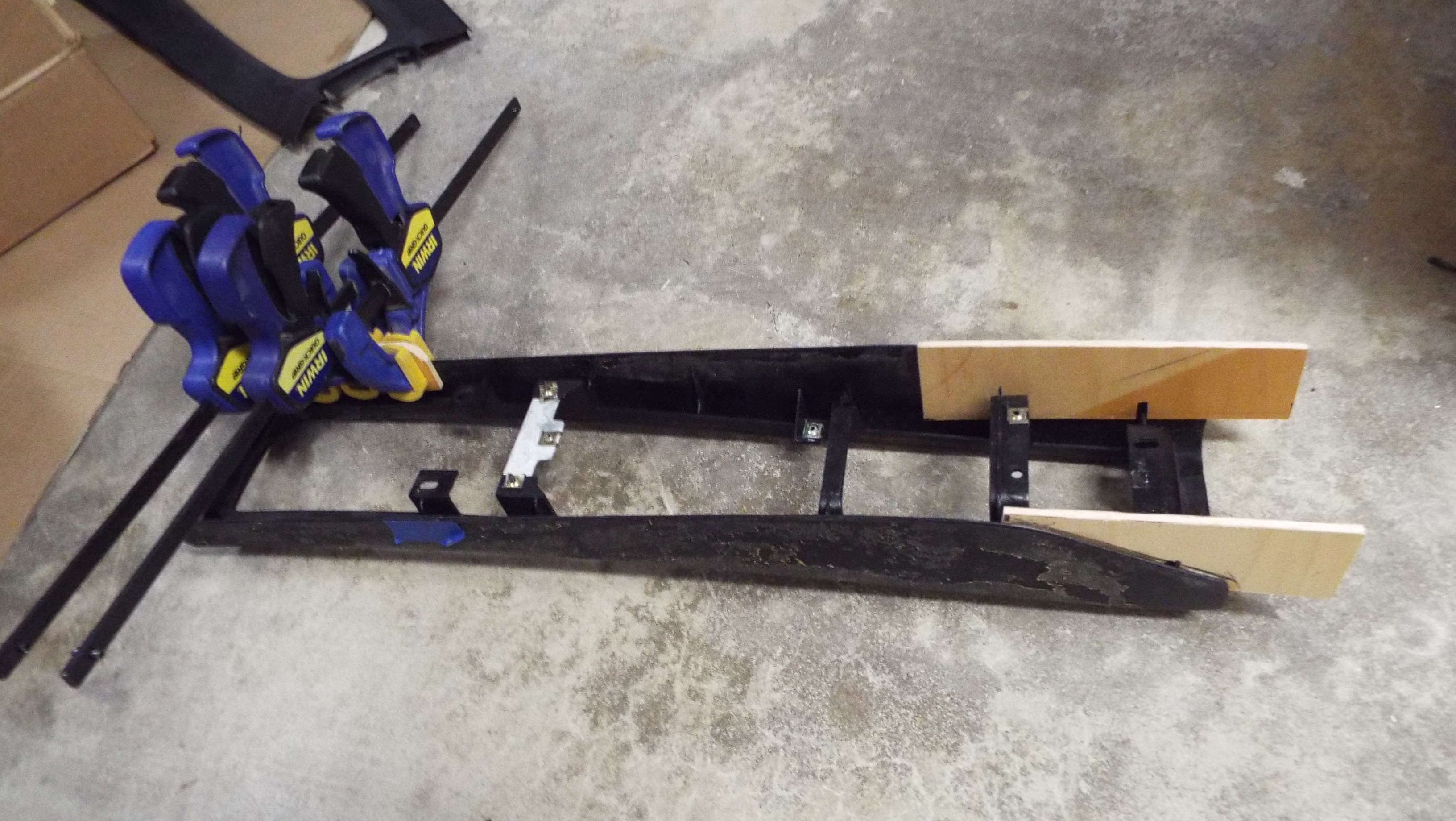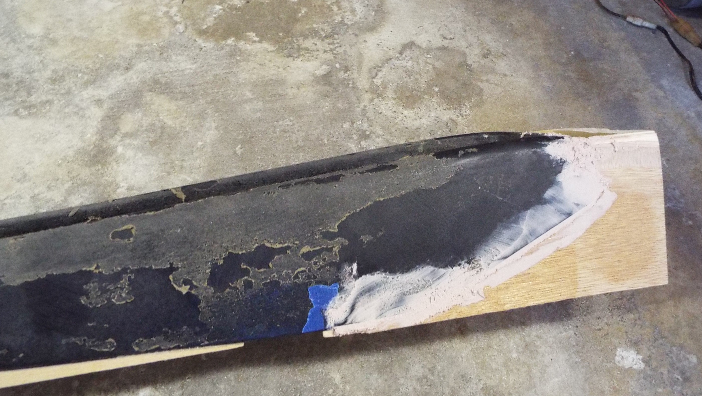 Went way better than I hoped it would. (IMG:style_emoticons/default/piratenanner.gif) Lots of clamping to achieve the thickness needed to match the outsides after gluing structural pieces inside. The bondo stage, one of several applications. (IMG:style_emoticons/default/white914.jpg) |