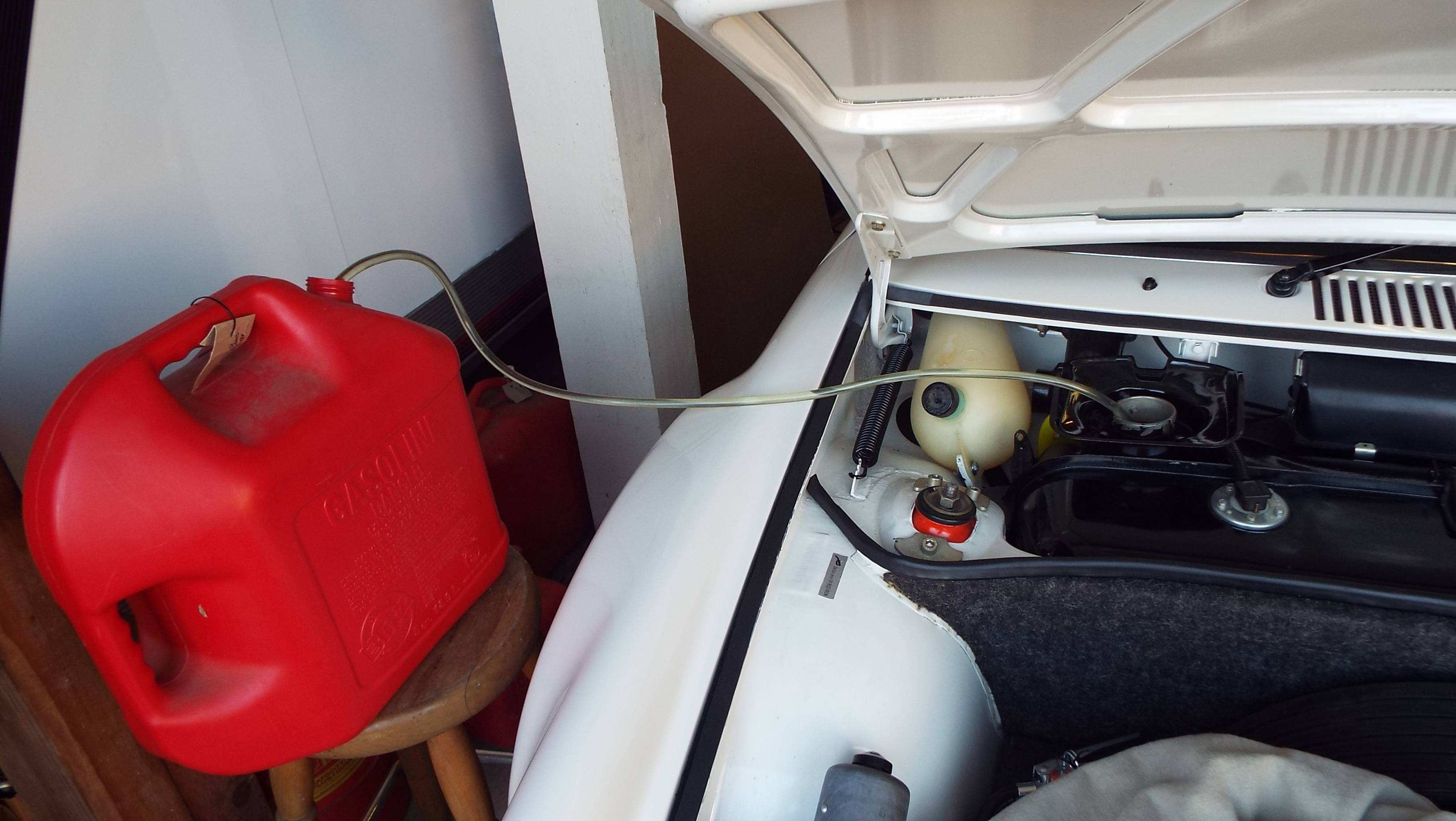 Next on the plan was to rig up some long hoses from the fuel block to a bucket then power up the fuel pump in order to flush the lines from the gas tank all the way back to the fuel block. Easy peasy! Right? Never made it to this step. (IMG:style_emoticons/default/mad.gif) Yup after putting 10 gallons of gas in, there was a pretty good puddle under the fuel tank that had grown to about 2ft by 2ft which I did not notice right away. (IMG:style_emoticons/default/mad.gif) Looking up the access hole under the tank, with fuel dripping all over the place, I see some coupling fittings on the fuel line that is right up next to the tank with no possible way to tighten them. (IMG:style_emoticons/default/hitfan[1].gif) Gas has to come back out and you know how that goes, you can’t siphon it all out, so more mess was coming. Boy howdy mess! By now it is getting dark and damp out. Stinks to high heaven too. (IMG:style_emoticons/default/mad.gif) Remember a minute ago I was talking about how tough it was to get down, yep just as hard to get it back up on stands. Think I will consider parking on 2 X 10’s just to get it up a tad. (IMG:style_emoticons/default/idea.gif) Tank comes out tomorrow! (IMG:style_emoticons/default/headbang.gif) Still trying to figure out why I didn't put the gas in up on stands. (IMG:style_emoticons/default/huh.gif) Still airing out the garage There we are all up to date. (IMG:style_emoticons/default/smile.gif) (IMG:style_emoticons/default/white914.jpg) |