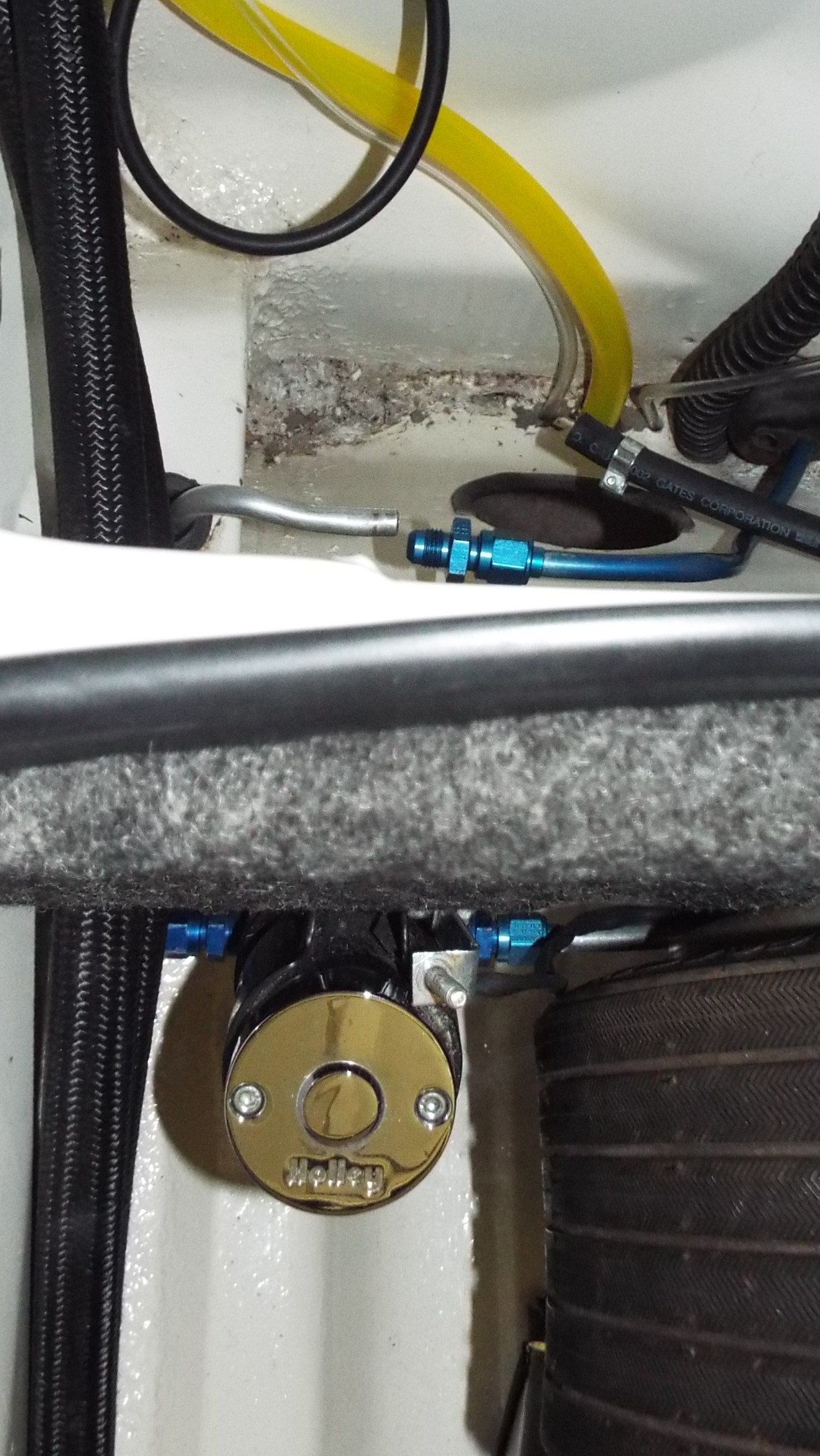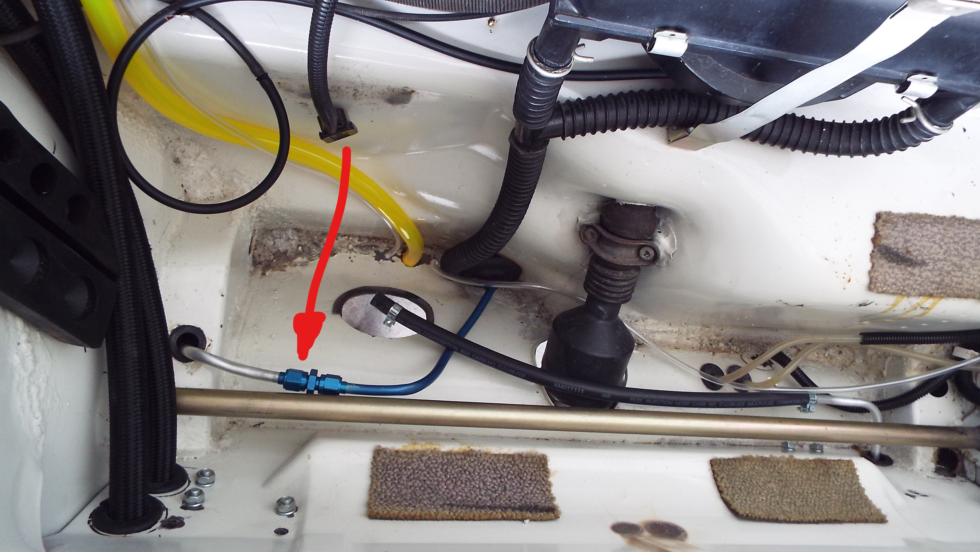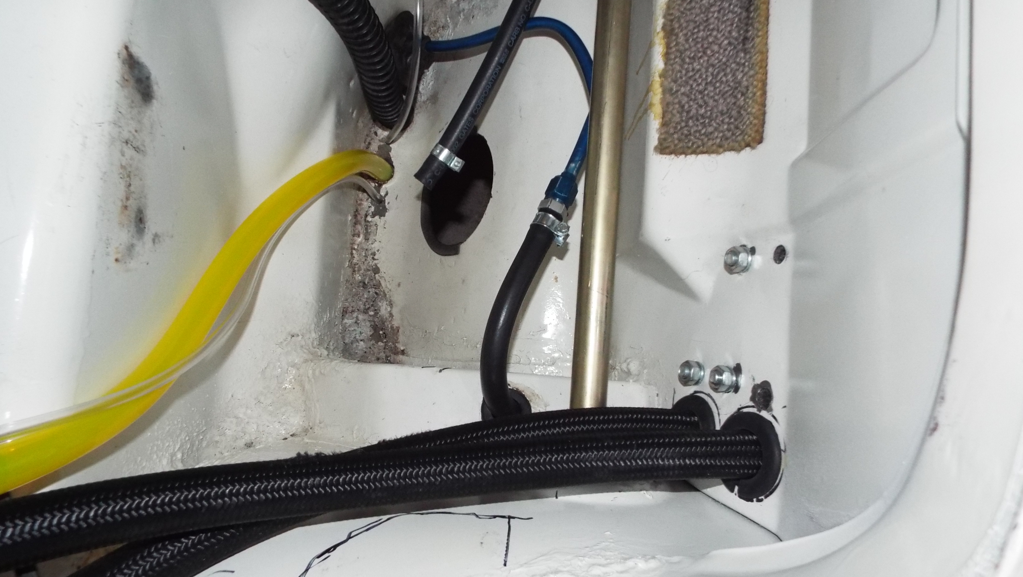 Yes that is one picture. (IMG:style_emoticons/default/smile.gif) Back from the tube shop with a solution! Convert that 10 inch section to 250 PSI rubber hose. I get having a hard line from the fuel pump to almost the engine, but I simply could not see making that line again with any better results. And we couldn’t come up with a good hard line solution. (IMG:style_emoticons/default/blink.gif) Now it was time to remove the old line. It was then I saw there was a pretty tight bend in the line. So good call to replace. It wasn’t exactly a picnic to run the rubber line either. Tight, Tight, Tight. About 4 hours just that part and I still got to put the tank back! A glass of wine is in order. Took the whole day. The finished project. (IMG:style_emoticons/default/white914.jpg) |