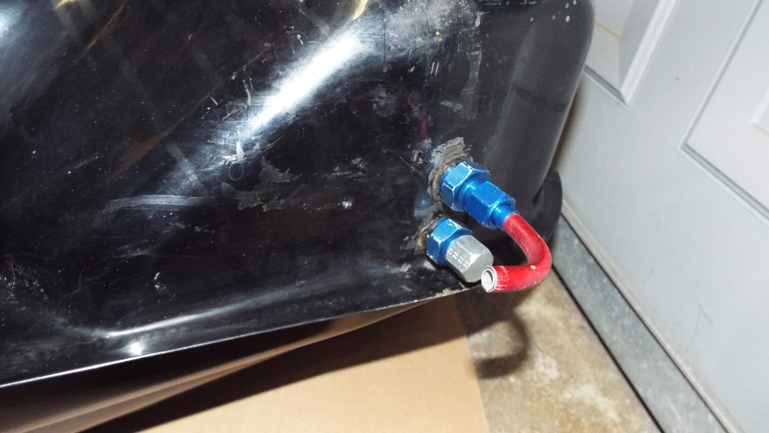 To be on the safe side, you only need to put a gallon or so of gas in, just enough to start it...... (IMG:style_emoticons/default/beer3.gif) (IMG:style_emoticons/default/idea.gif) Gave this some thought today and had I only put in a gallon, the level in the tank would not have been high enough to find this leak. It would not be until the fuel pump fired up and then the leaking fitting would have sprayed everywhere. The fitting was leaking like a sieve with only gravity! I can't say if 5 gal would have found the leak with gravity or not. Tank in now back in and I created a longer drain tube rather than just having the cap that was way up there (see pic) so it now has easy access and could be drained quickly and cleanly. In the situation I was in I pulled the fuel line hose off the red tube, which may not have been the best choice, but with the amount of gas present and coming down on me, it's what I did. (IMG:style_emoticons/default/sad.gif) As I was almost finished writing this I decided to check the PET and realized there is suppose to be a strainer. None was there, none installed. Guess what I will be looking for next. (IMG:style_emoticons/default/headbang.gif) (IMG:style_emoticons/default/white914.jpg) This is how the drain was with a cap, Red tube is the fuel line. And now (I wanted to flip this pic but couldn't, it's upside down) |