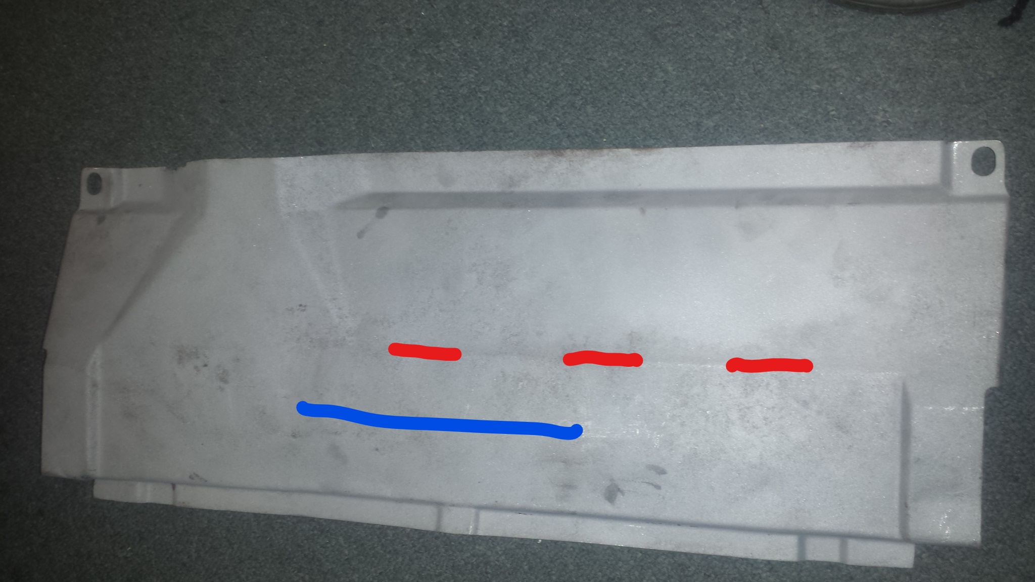 It needed a bit of straightening with hammer (IMG:style_emoticons/default/smash.gif) and dolly, then Por15 on the up side with prime / paint the bottom side that will be visible. These cars are so low and I know you can't really see this part when installed but I was on a mission to see what I could do with it. (IMG:style_emoticons/default/biggrin.gif) (IMG:style_emoticons/default/white914.jpg) Before Pic - Unfortunately what you really can't see is the crease marked in red running the length of it was wavy and bowed. The flat area marked in blue was actually curved in the center but not the ends. |
