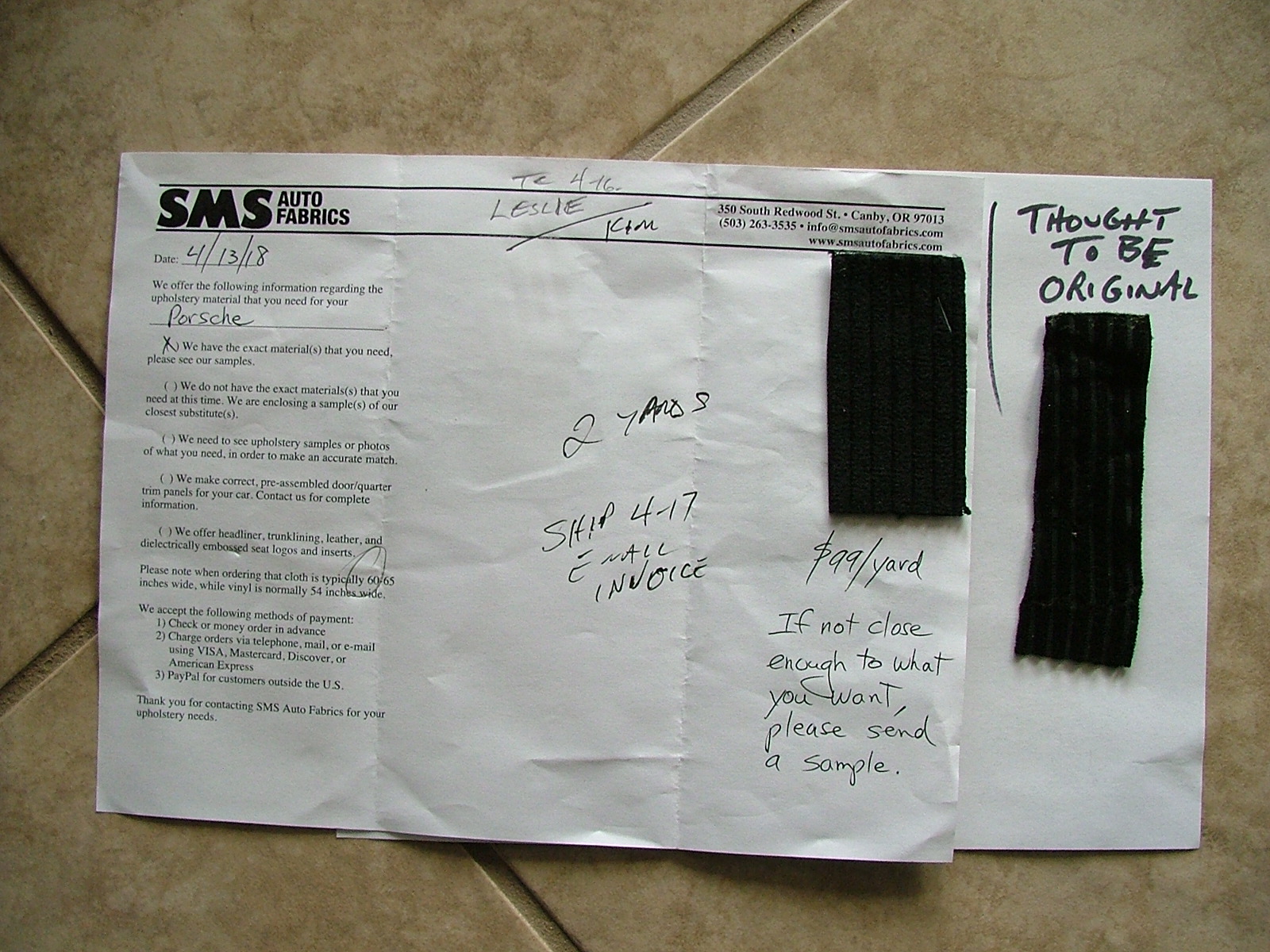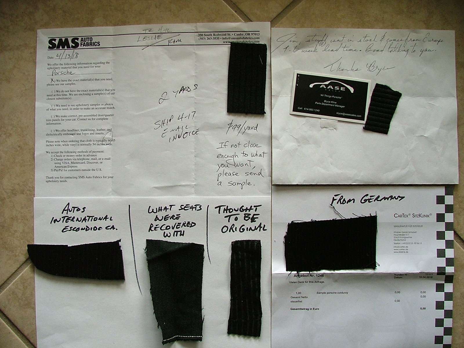 Bummer about the seats Jim, (IMG:style_emoticons/default/agree.gif) they could have been made years apart hence the difference,can you still get the needle corduroy for the inners ? . Re: the oil level I had a similar issue but in reverse..PMS filler and stock tank,appears they don't match,I calculated I would need around 12 litres to reach halfway on the dipstick which is too much for my engine (no front cooler) so adjusted the filler neck to bring it closer to the tank ,did an oil change and added 9.5 litres and marked the dipstick ,finally I know where I am. Car looks great and seems to be getting attention (IMG:style_emoticons/default/biggrin.gif) . I got as close as I could find on the corduroy after a month and a half of searching. I pursued many avenues trying to find “correct” corduroy which at one point was starting to look unobtainable. (IMG:style_emoticons/default/headbang.gif) Called, searched, (IMG:style_emoticons/default/type.gif) , drove, and after numerous phone calls and samples gathered from around the country, even communicating with a place in Germany. I received the material I chose from these shown here. (IMG:style_emoticons/default/white914.jpg) This is what I thought was closest from SMS to what was believed to be "original". It is a nice heavier weight fabric. I did not like the foam backed one from Autos International and it was THE most expensive. My upholstery guy could have gotten that one too but he knows it is not as correct as what I found. The AASE one was close too with the ribbing as well, but you can see it also came from Germany and was lighter weight but out of stock. SMS has terrible yelp ratings but I did well with them even shipping sooner than they promised. I would recommend them. (IMG:style_emoticons/default/beerchug.gif) |