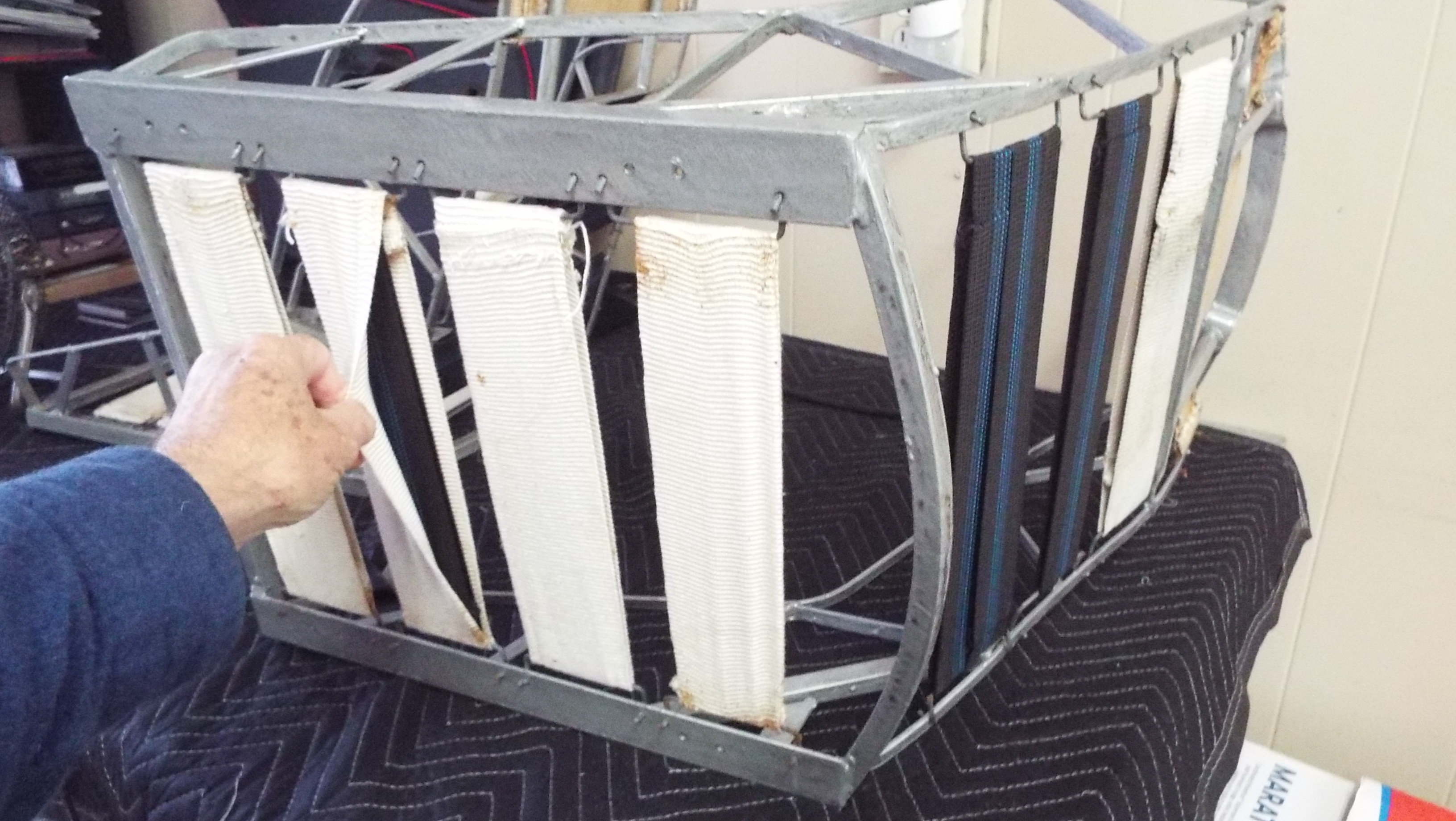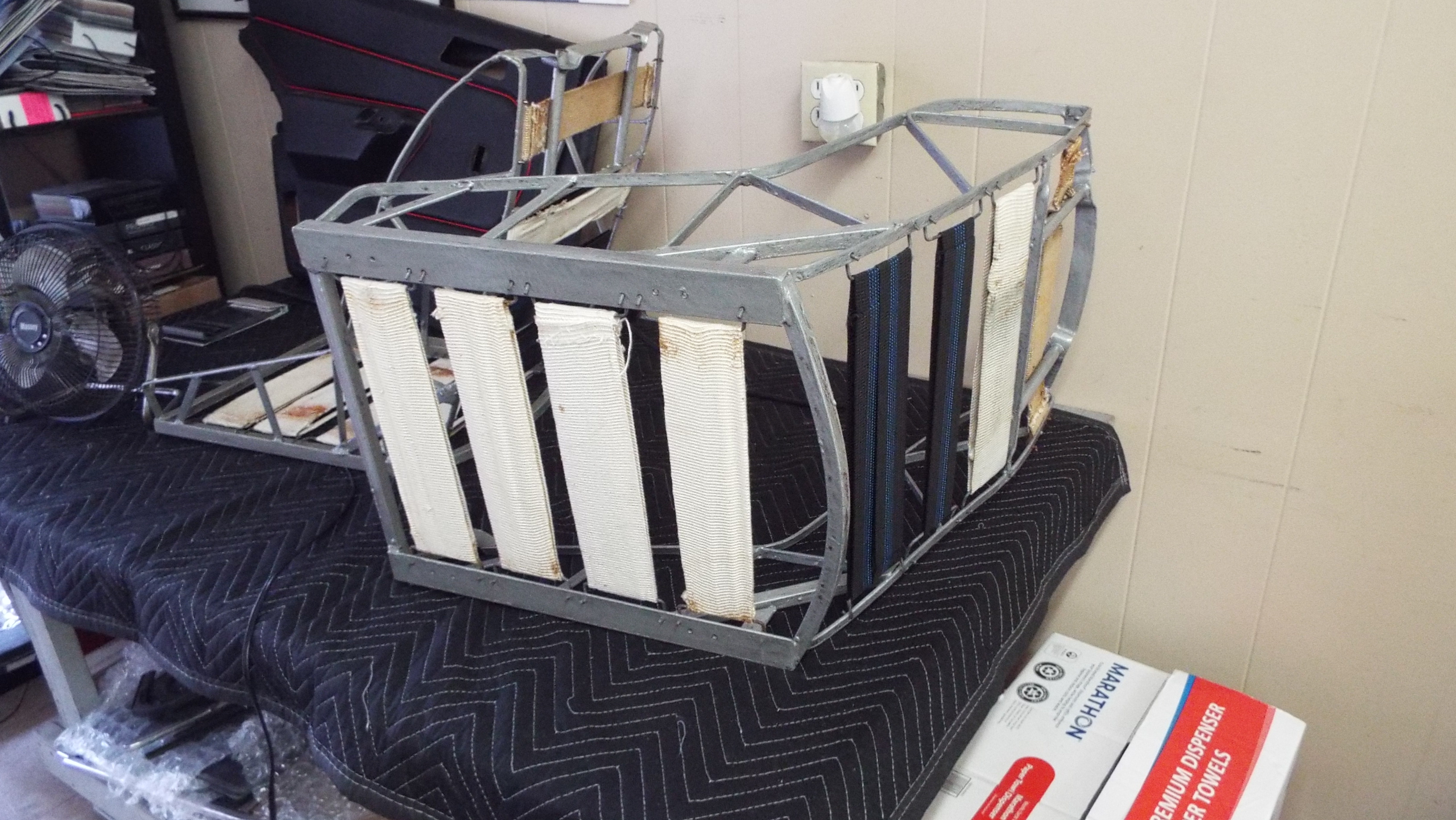 Hey Lucky, you should do yourself a favor and have your upholsterer order up some "Pirelli Webbing" before you go any further. It's a little more expensive but is worth it. It's the stuff they used to used on vintage car seats. My Volvo 1800E needed webbing replaced and instead of buying the original Pirelli material, I bought the cheaper Dunlop (looks like what you are using)... it hasn't help up well at all. I'm going to have to re-do it. The Pirelli is more of an off-white/cream colored rubber looking material, rather than the stretchy Dunlop. I can sort of relate to what you are doing... I bought E30 BMW sport seats off craigslist (because of their high side bolsters) and combined them with the relatively flat original recaros that were in my 1800E. So I had to weld frame pieces together and manipulate foam, add webbing, custom upholster. But now I have original looking seats (with original side brackets/hinges) but with nice firm side bolsters. It was a 'B' to do but worth the effort. Just trying to save you some frustration up the road with the webbing. Great job on everything, btw !!