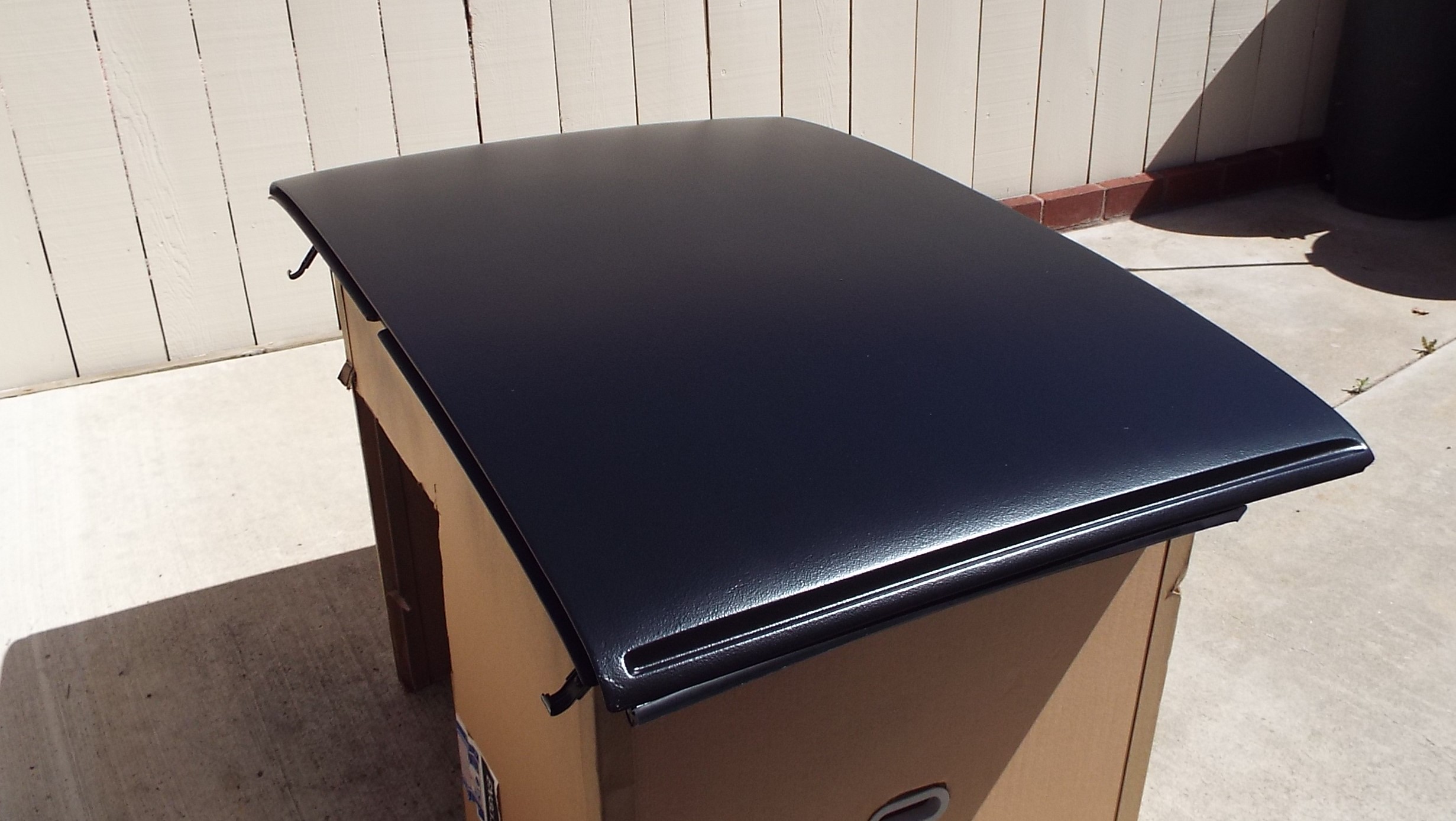 After 3 attempts I still was not satisfied. It was a combination of things the gave the poor results. Number one with that small fan you really have to keep the “wet line” going or you end up with zebra stripes and I have been painting for years. Maybe shoot a little slower and heavier coat helps. Number two there must be no wind and that is maybe the most critical with the small fan too. Number three the SEM product is good mind you, but I don’t think it really likes spraying that big of a flat surface all at once (with the can horizontal for a prolonged period of time) because early coats sometimes the nozzle skipped or sometimes spattered and it usually happened 5 inches before you could get to the other edge. (IMG:style_emoticons/default/barf.gif) Today was a total success, no wind, good coverage, cooperative can. Nice sheen, not shiny, and a good finish. (IMG:style_emoticons/default/smile.gif) (IMG:style_emoticons/default/driving.gif) (IMG:style_emoticons/default/white914.jpg) |