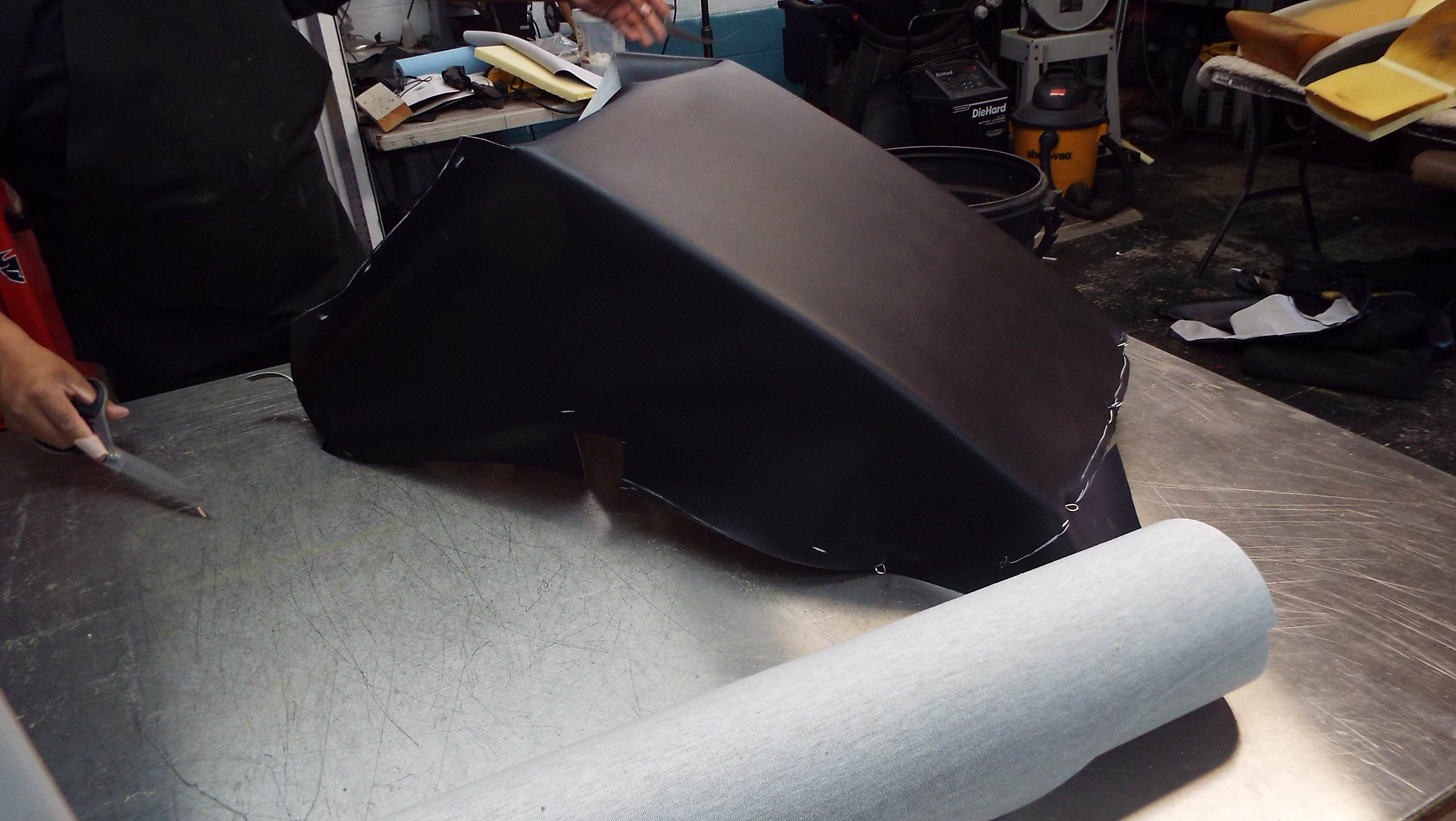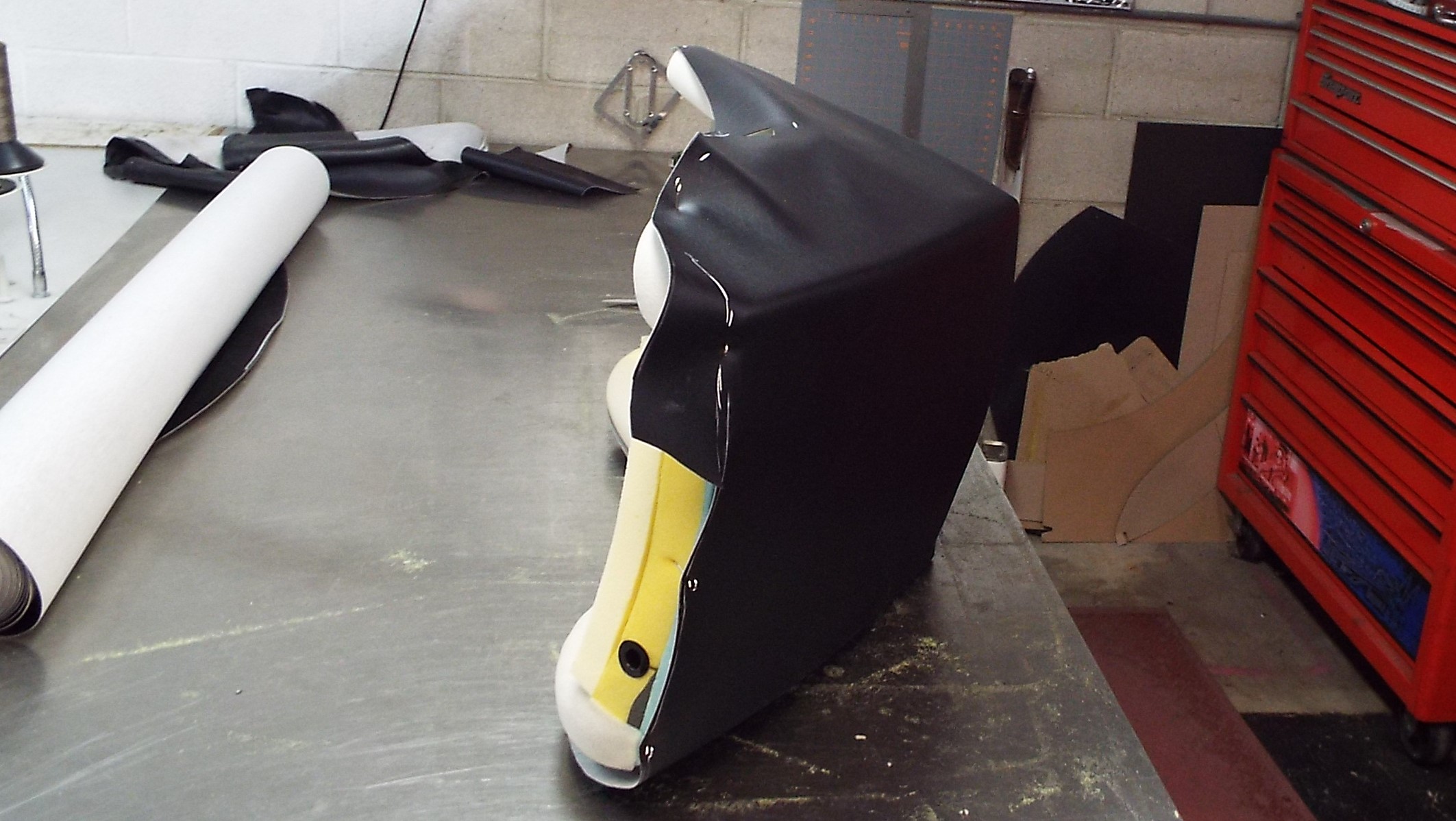 He was cutting and fitting the vinyl this afternoon when I stopped by again. Check out that back! Clearly, like anything done well, it is all the work you never see that is the most important to yield a good result.