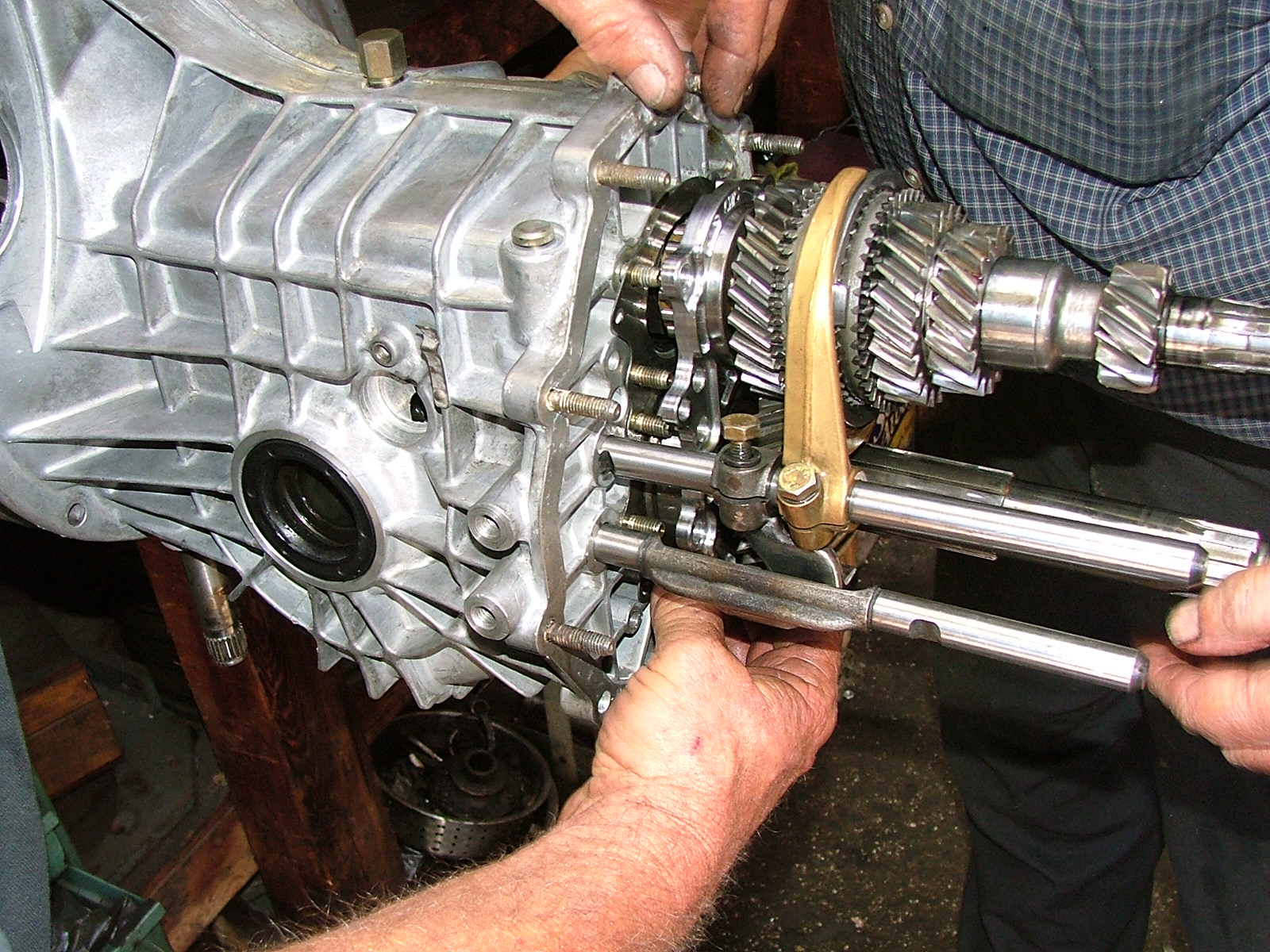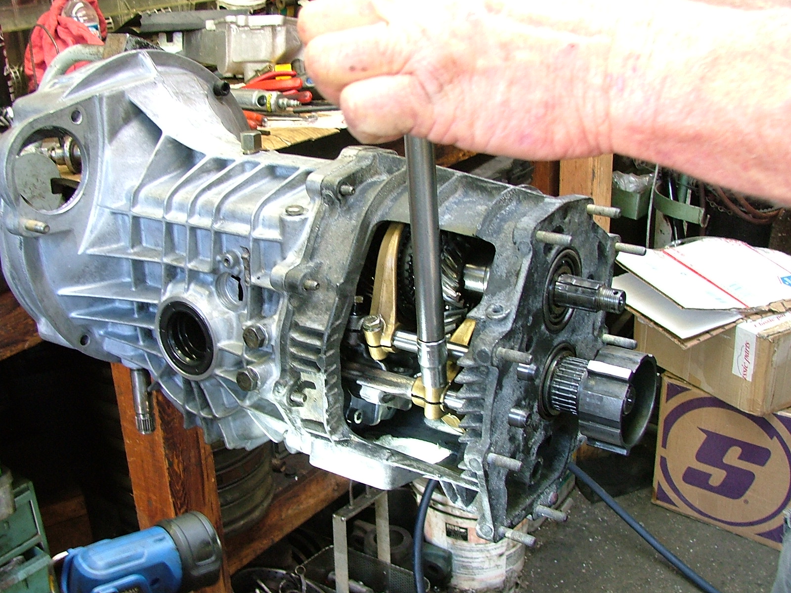 Switching the shifter fork from the old rod on left to the new on right. By the way this is the rod you have to make a deposit on to a guy in New Jersey for Martin until you return the old rod something I did not know until purchase time. Now with the block installed a trial fit of the side shifter housing to the inner support block with shift rods. Next was a fit of the ring gear assembly which yielded those score marks on the housing, right where the speed pick up used to be. |