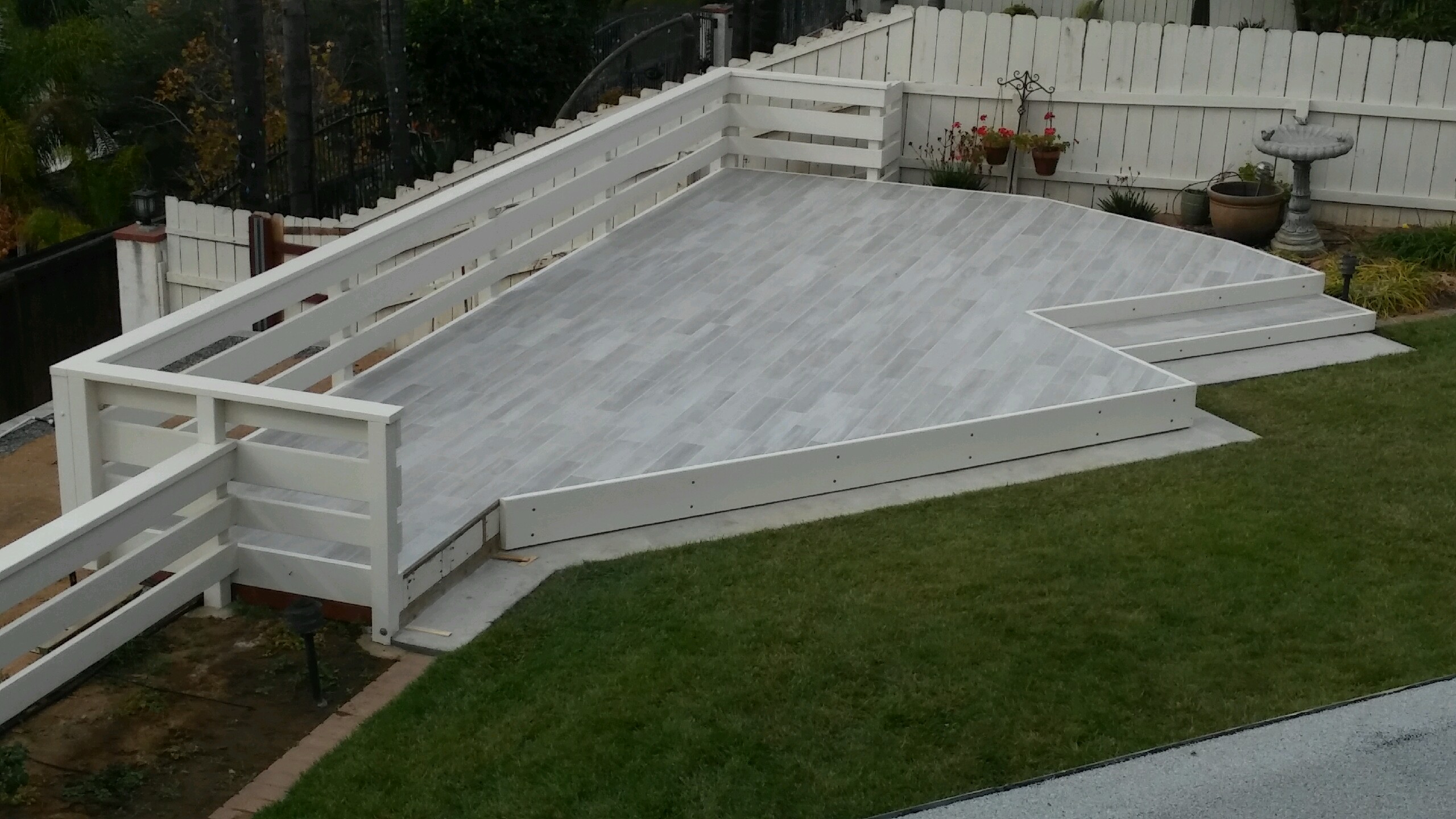 It is 28 ft long. We started in April 2020 and it took 6 months to finish working pretty steady. What you can't see is under that deck is all cement to the tune of about 160 90# bags of Redicrete which we used a mixer to mix and wheel barrow in. I doubled the 2 X 6 and some 4 X6 stringers spaced to every 12 inches and redid all the footings to support 3/4' Exterior Plywood with thin set Hardiboard laid in herringbone pattern and then thin set 6" X 24" tile. Lost count of how many decking screws I put in. Should be there long after I'm gone! I won't bore you with all the in process but suffice it to say it is now designed so no varmints can get under it. I see now that I posted it the last facer board was not installed yet. (IMG:style_emoticons/default/driving.gif) (IMG:style_emoticons/default/white914.jpg) |