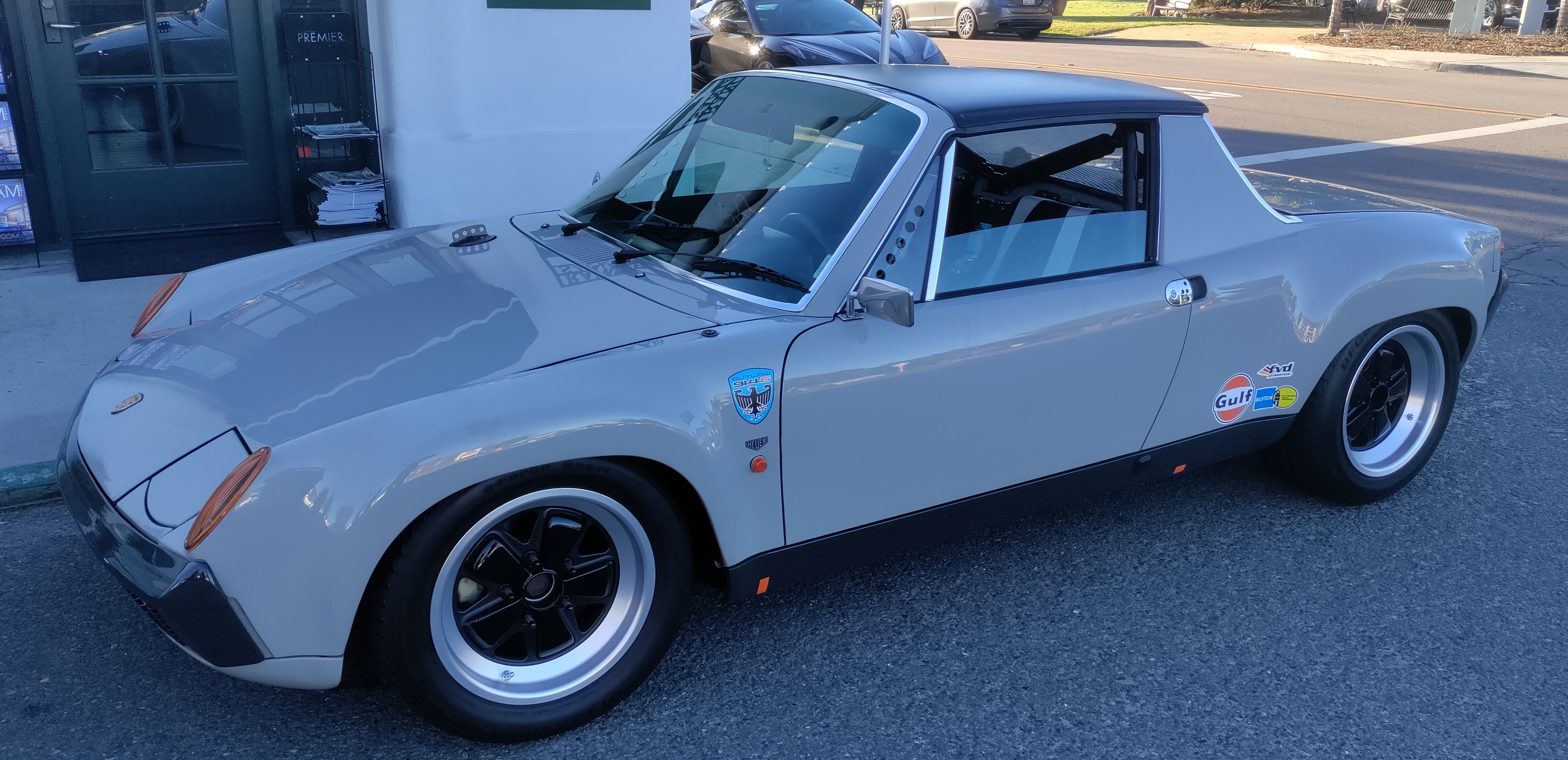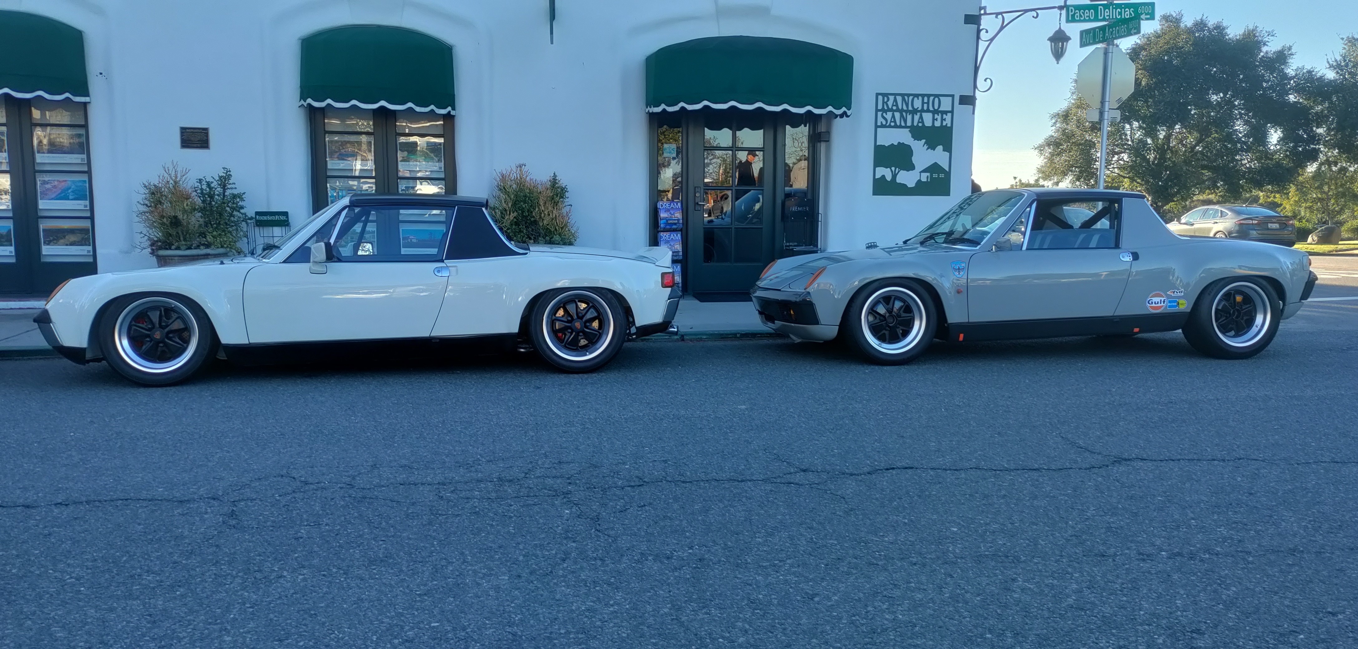 Had a good surprise this past Saturday of a friend coming down to San Diego from Venice Beach with his just finished 3 year project '73 914-6 Tribute Chalk Gray over black interior. He is not a World member. Built 3.2 L with ITB's. 915 Trans Fun time! His first visit to RSF (IMG:style_emoticons/default/driving.gif) (IMG:style_emoticons/default/white914.jpg) (IMG:style_emoticons/default/silver914.jpg) Both cars look sweet! I'm really diggin the partial GT look on that Grey car. Any more pics somewhere? That 3.2L with ITB's if you set it up properly it can be a 300hp screamer... so fun. |