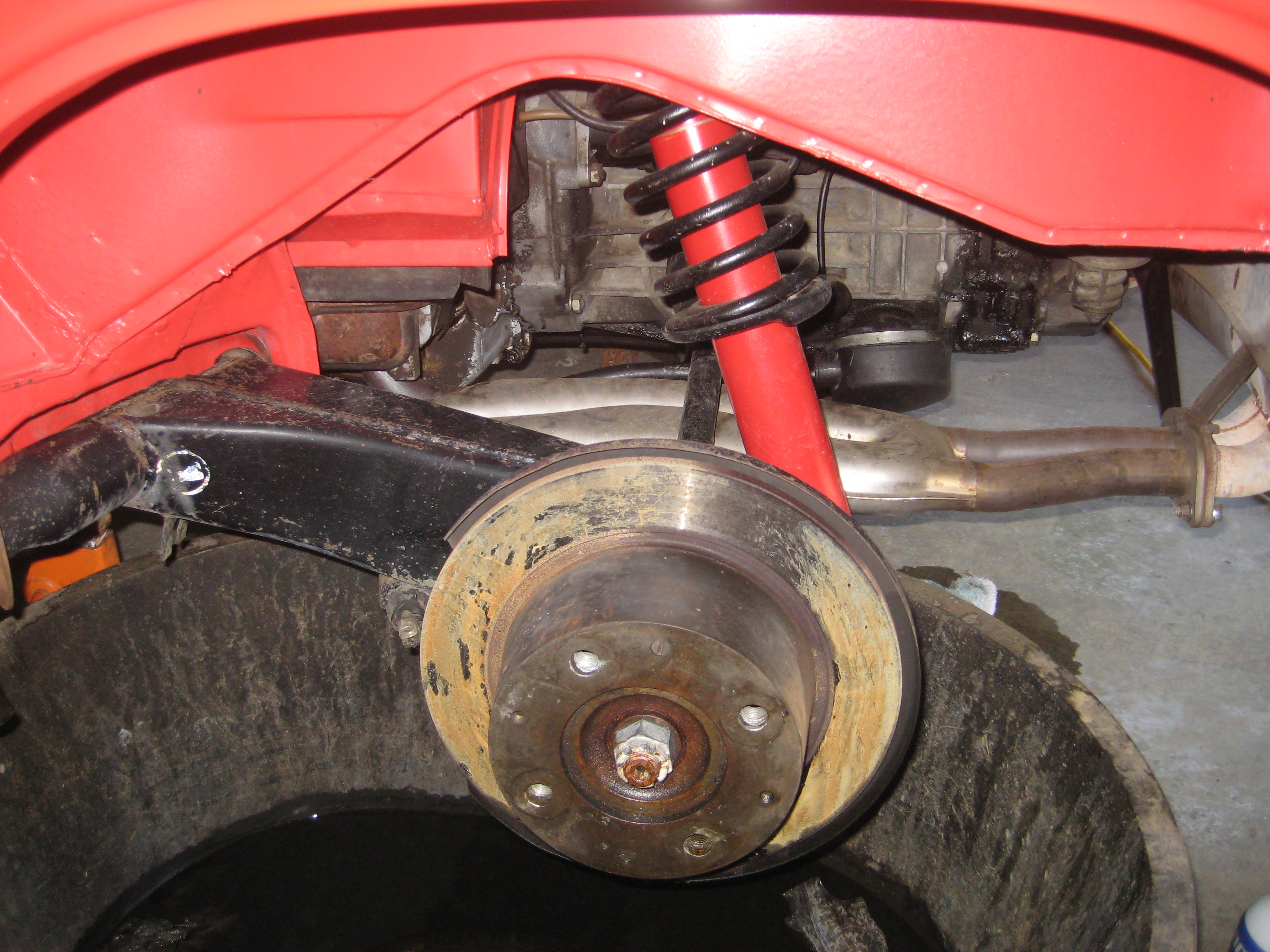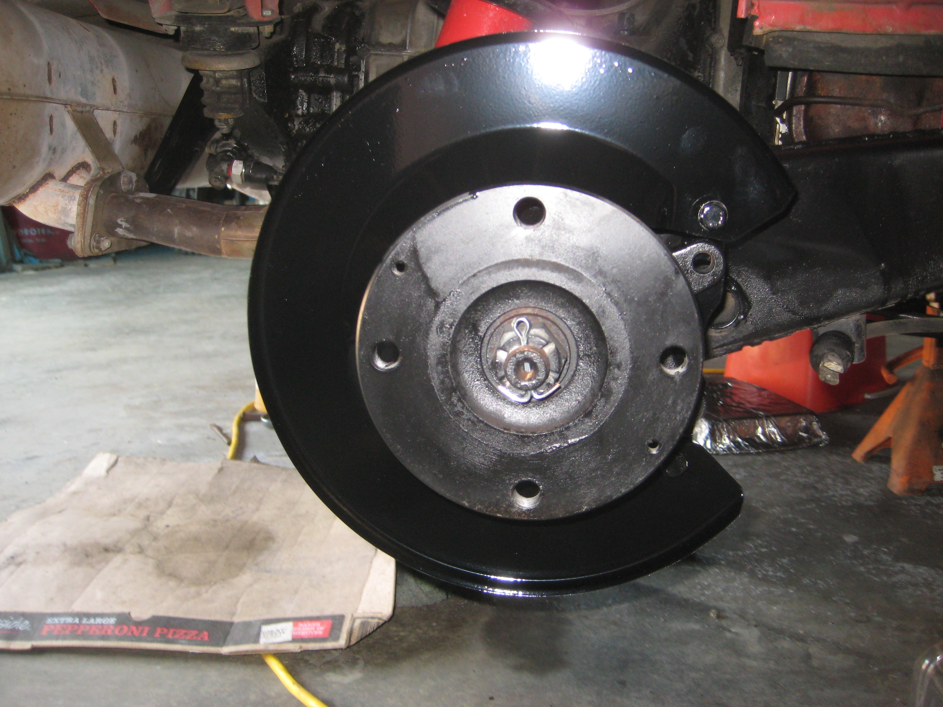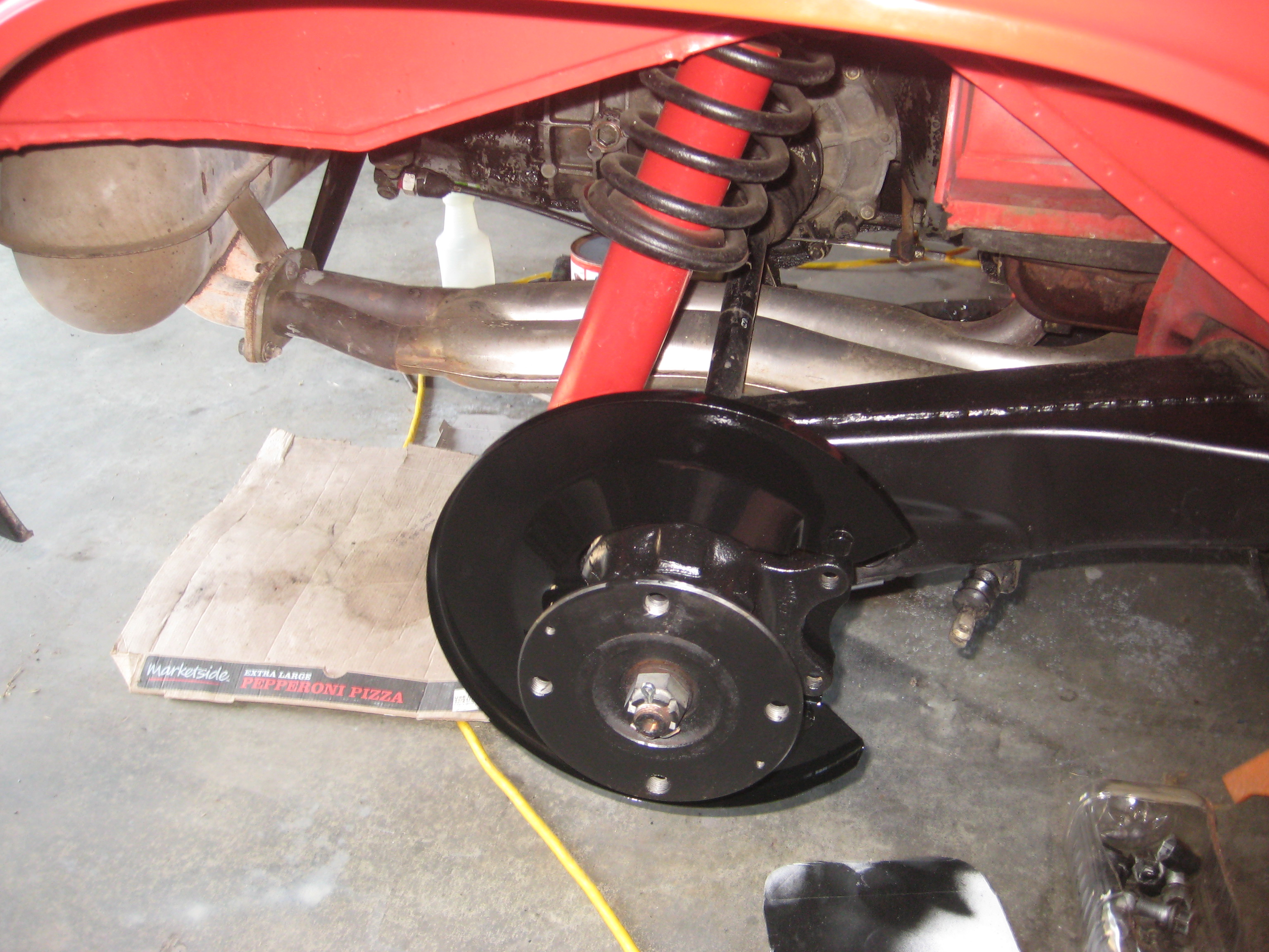 The other side. I used some of Eastwood's Chassis Black paint to touch up the trailing arms. I stripped the paint off the rotor guards using paint stripper followed by a 3M paint removing disc in my drill, and finally a brass wire wheel on the drill. New rotors really set it off. Just wait until the new brake lines and Eric's calipers are added! Attached thumbnail(s) |