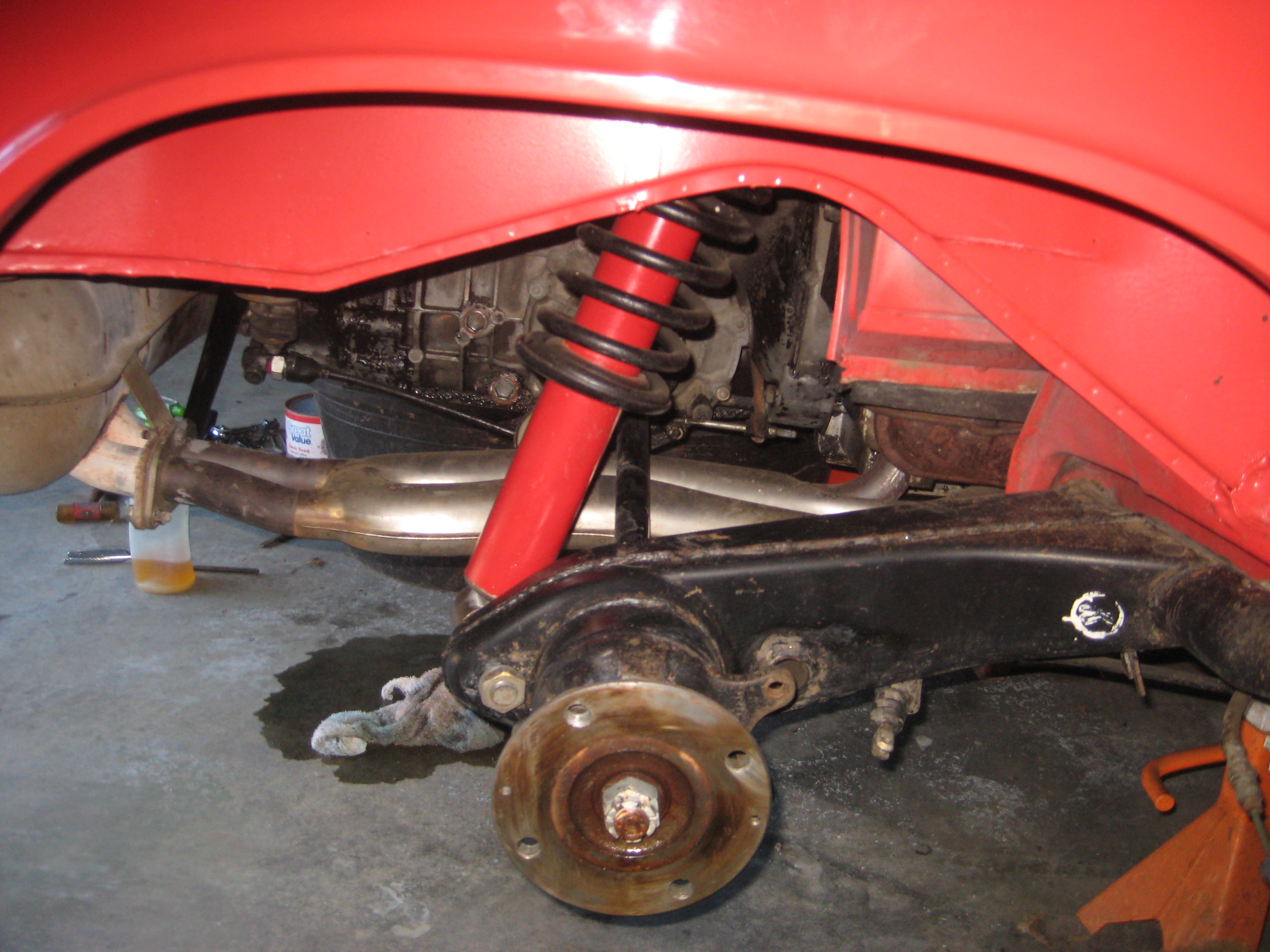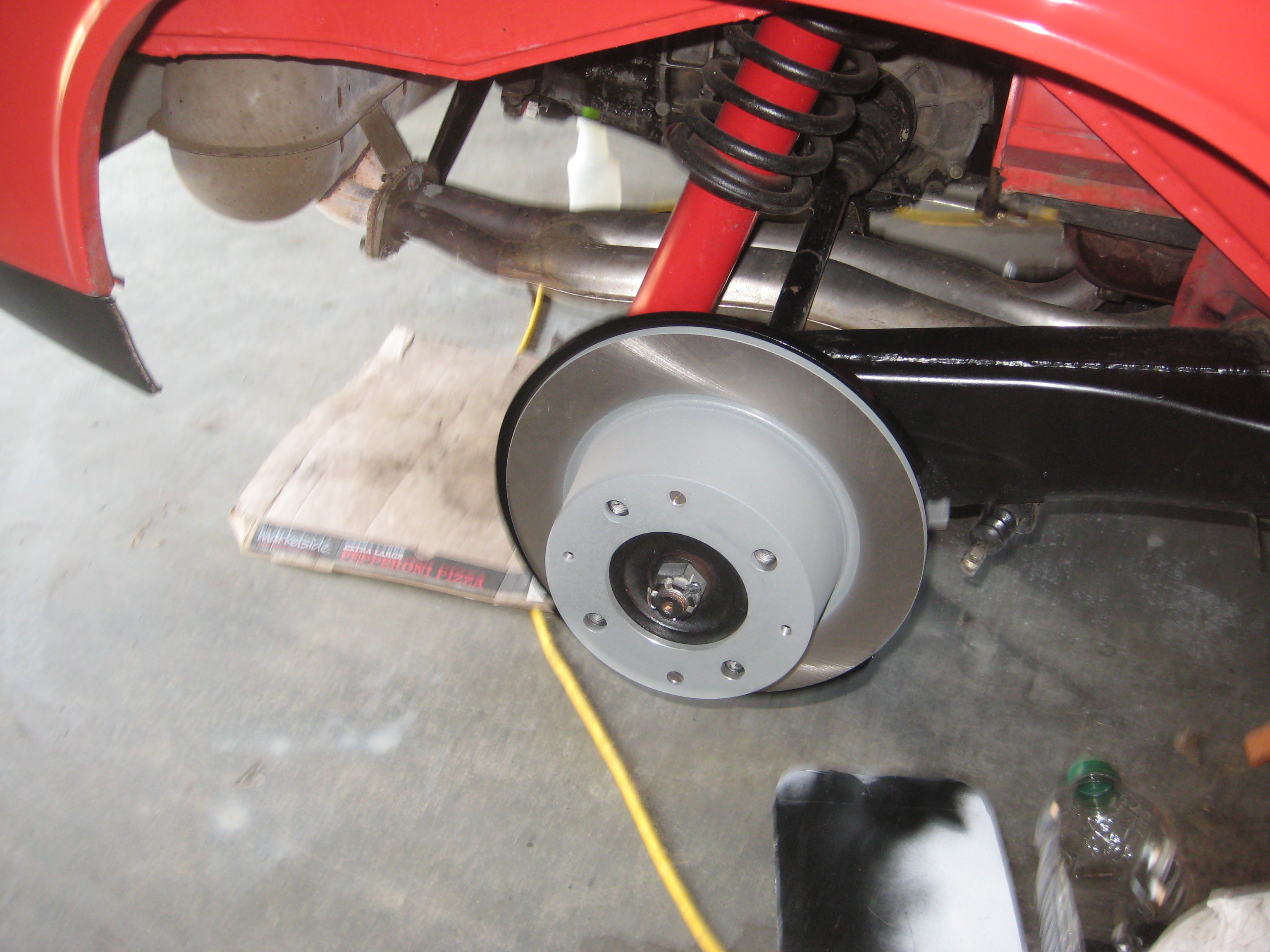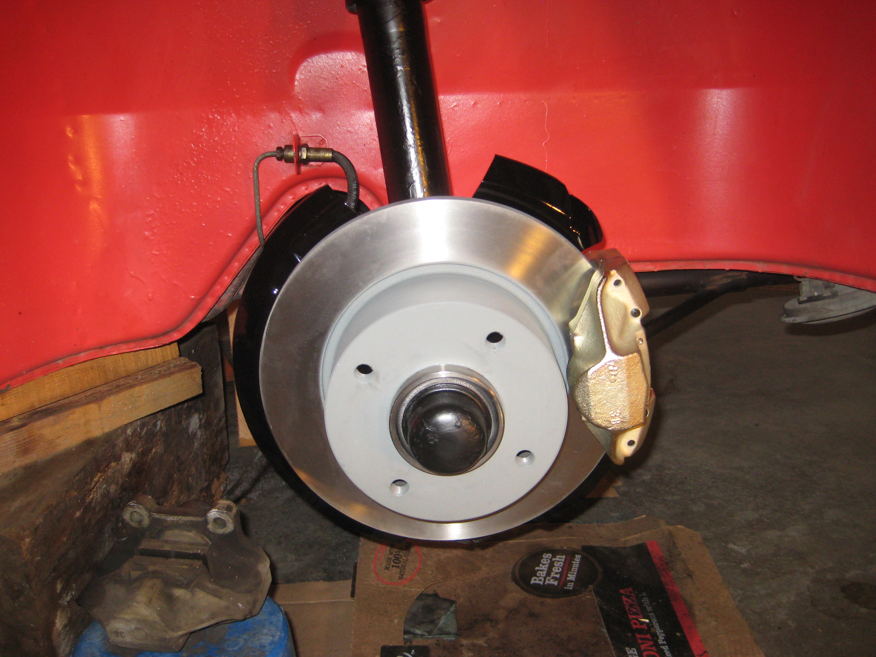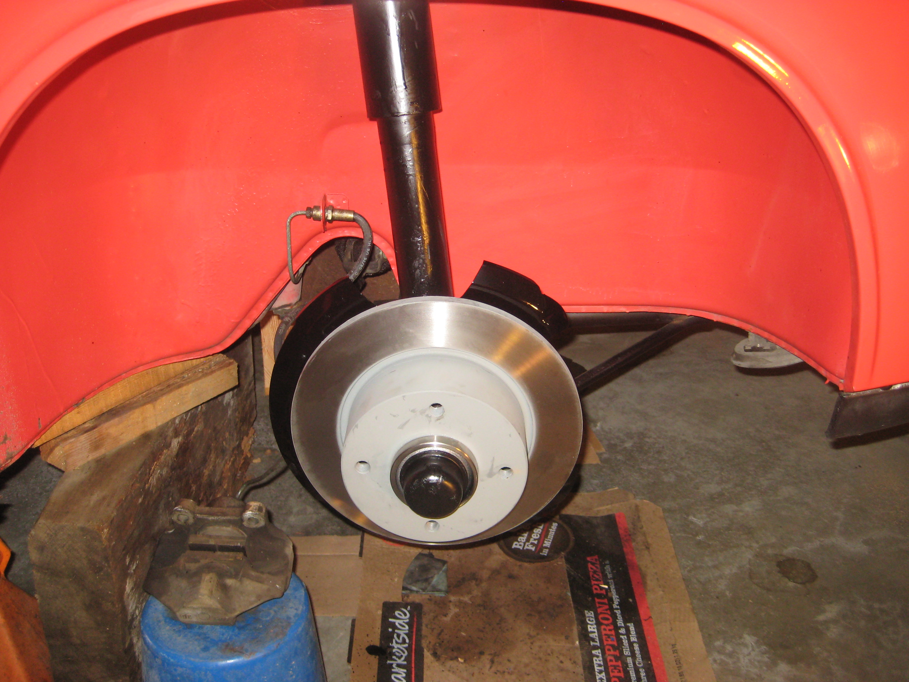 The other side. I used some of Eastwood's Chassis Black paint to touch up the trailing arms. I stripped the paint off the rotor guards using paint stripper followed by a 3M paint removing disc in my drill, and finally a brass wire wheel on the drill. New rotors really set it off. Just wait until the new brake lines and Eric's calipers are added! Attached thumbnail(s) |