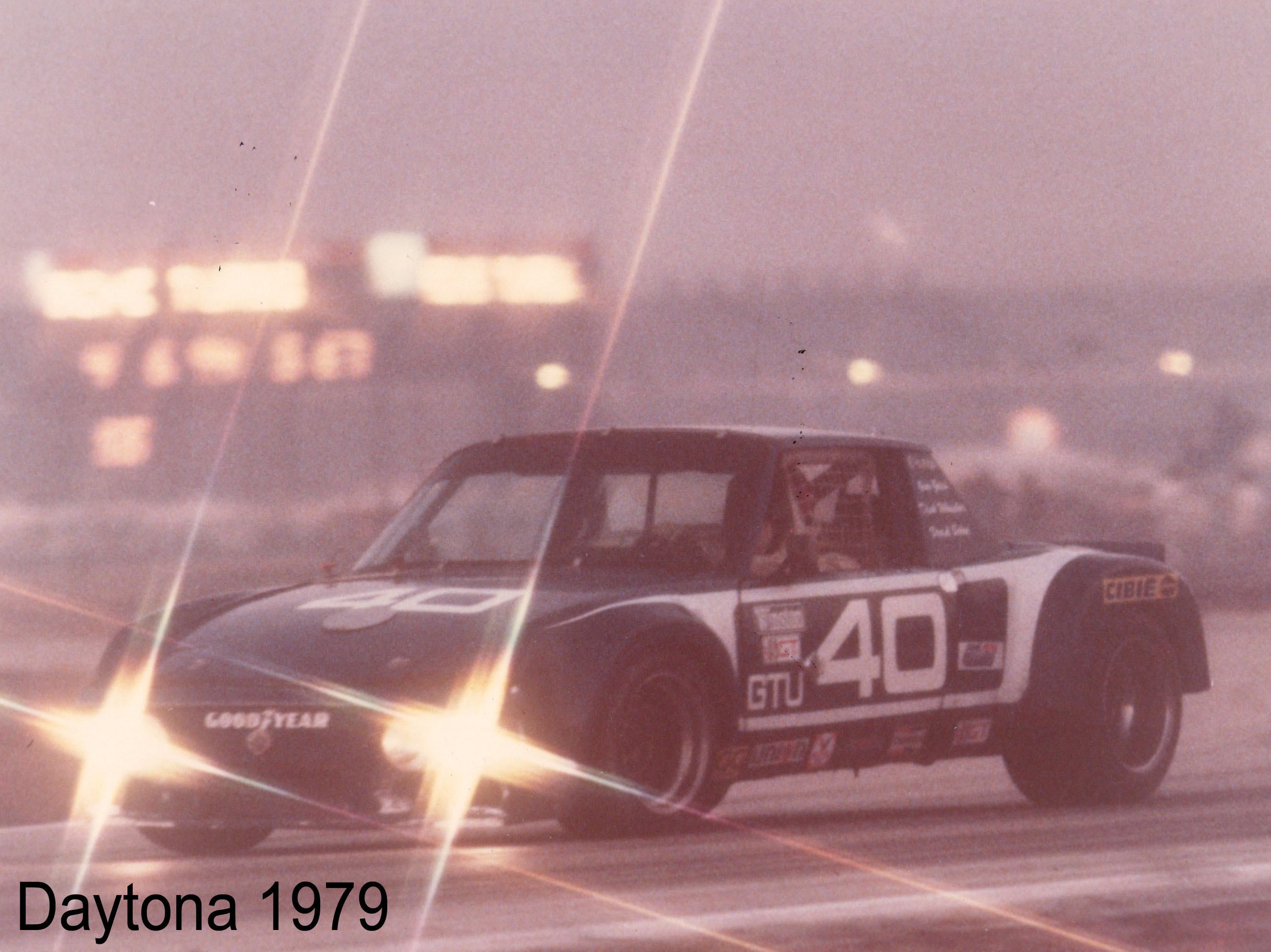 Then the bodywork was slightly changed for the 1976 Daytona 24. ![]() Then IMSA allowed 15" wide rear wheels on the cars. The car shown in the previous post (Thunderbird Swap Shop) was a rushed together set of fender flairs that probably added 100 lbs or more to the weight. I then built a new set of flair molds and made the new flairs. One race later they were no longer legal as the rules changed to 12" wheels. We also changed the number with IMSA to 40 from 54 So I modified the molds and now had flairs that just covered the 12" wheels. Daytona 24 in 1979 If you notice the lights were also changed from using the pop up's to mounted in the spoiler. When the headlights were put up for night driving we lost a bunch of RPM and speed on the back straight. On the average of 8-10 MPH if memory serves me. Also back then there was no bus stop or chicane in the back straight. What a rush going from a level track to 32 degrees banking in a couple of seconds at speed. |