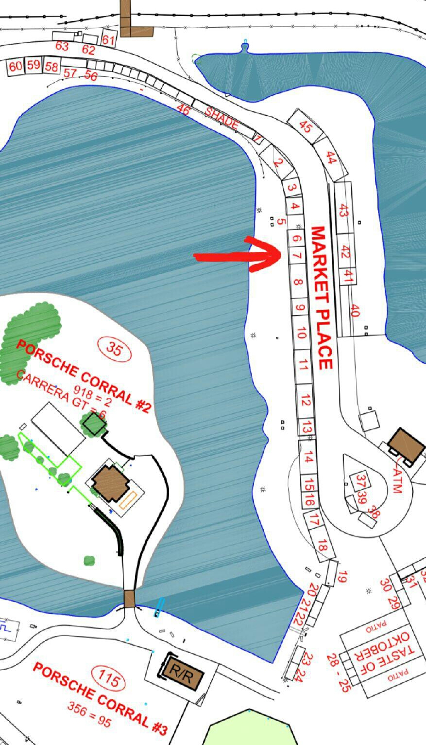 Is that map available on-line somewhere? AFAIK the entire map is available right now to vendors and included in our paperwork. I did notice the 914 corral (corral #1) near the merchant vendor area, has 32 914s . Boxsters beat us with over 100 in their corral, but someone at Laguna Seca spelled it Boxter Corral ?? |
