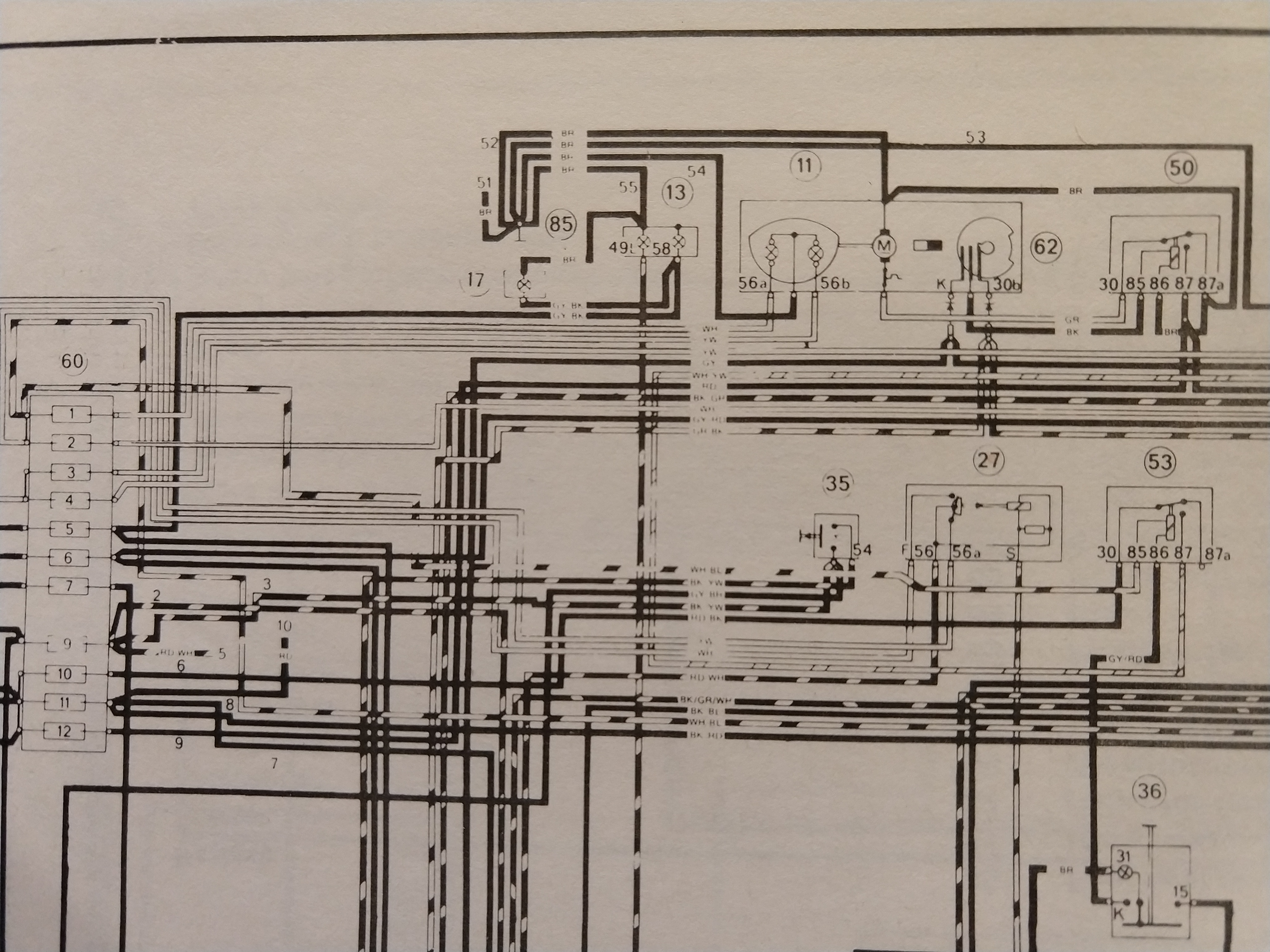 2) "1972, 1973, USA and except-USA" White/Blue wire connected to Fuse 1. Foglight relay is #53; Headlight switch is #27. Note wire on pin 85 on #53 foglight relay connecting to Fuse 1.