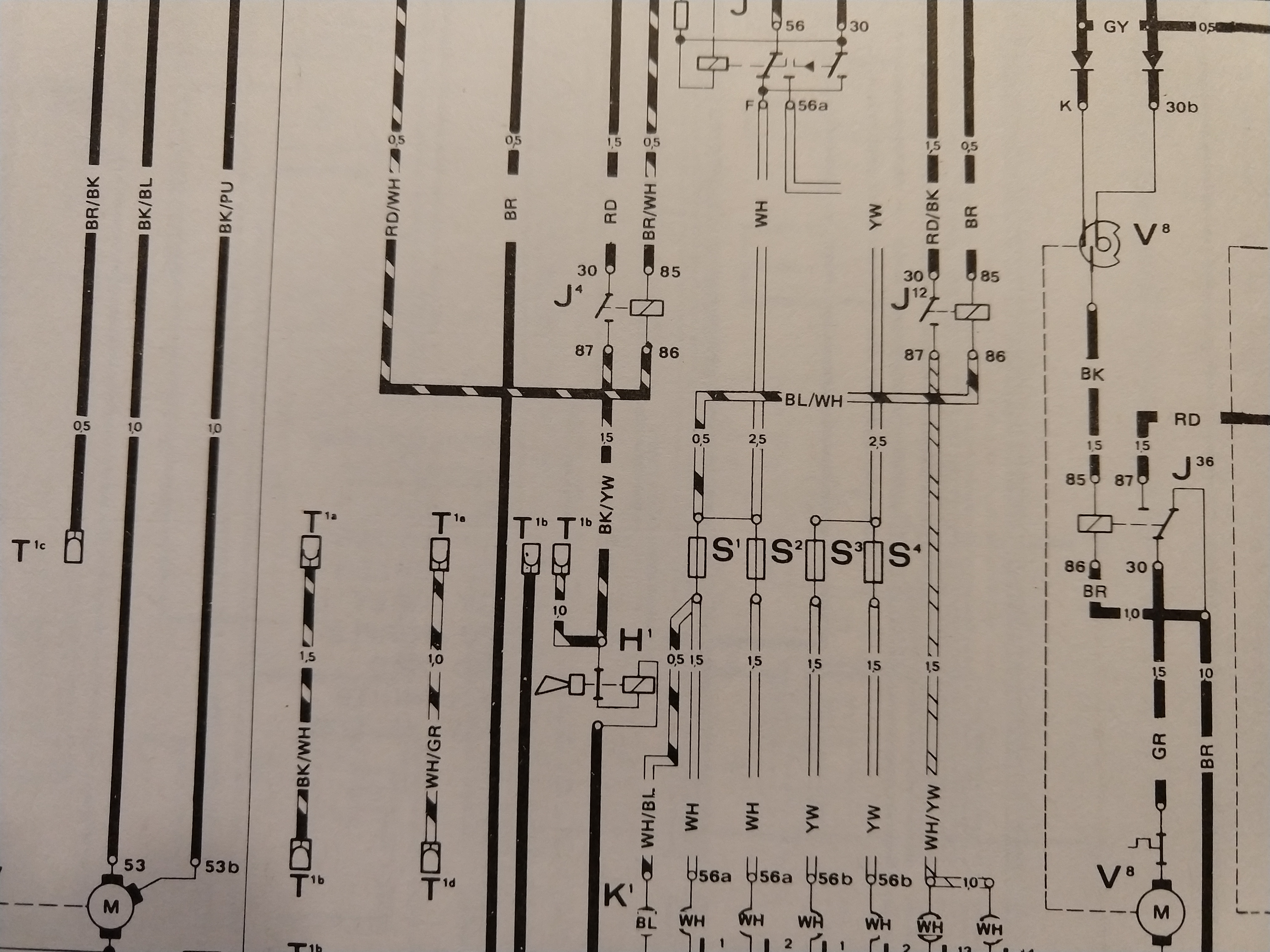 3) "1974, 1975, USA and except-USA" White/Blue wire connected to Fuse 1. Foglight relay is J12. Note wire on pin 86 on J12 foglight relay connecting to Fuse 1.
