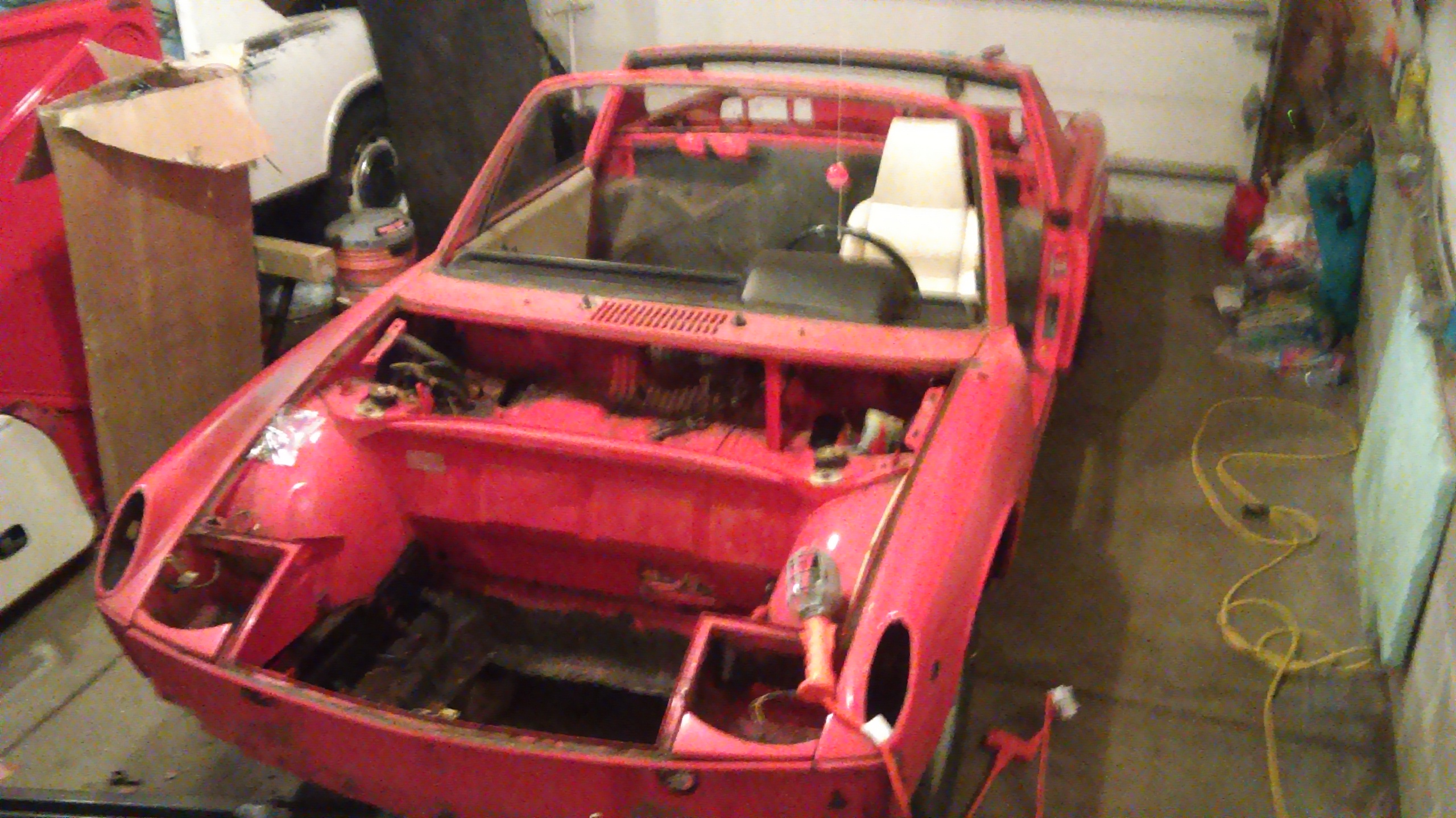 Ok guys I am posting picks of building my car. I have about three days maybe 12 hours total on this Build of actual of the car. I am in a build off.... So here are pics of the car and what I have been doing. I am really just currently deconstructing. The build will have a corvette c6 front and C5 rear suspension and a tube chassis, and c5 z06 rims that are 17/18. The powertrain I have is a 5.3 out of an 04 silverado. the trans is a boxster S unit. I also have a 70mm turbo for the engine. I have purchased but am still waiting on the adapter. Will probably be extending the rear of the car at least 5-8 inches as I would like to use the stock accesorys. or I would like to keep the power streering pump at least and the alternator. I am a bigger guy and really cannot sacrifice any room inside. Plus I would like a nice stereo in there(and a hot woman). And that is about it. I am just a one man operation building this car out of his garage. I do not own a shop. I will be doing all of the work myself or as much as possible. I realize I am in a build off but really this is cheap entertainment for me. So please lets keep it entertaining. Currently in Omaha NE and no one knows what this car is. but they do think its cute and want one...lol. I have not seen one of these on the road in years. I have 2. This red one I bought with the intentions of flipping and making some quick money. After about 6 weeks of trying to sort out the engine my patience and money I had allocated for this car was done. So it became the focus of the build only becuase it was titled in Ne and would not have go through inspection. I realize I am in way over my head here (IMG:style_emoticons/default/wink.gif) thats where i am comfortable. The welding on the car will be conducted by a local professional that works on nuclear reactors until I am comfortable I can do it but its really not that hard and I am getting better. While I am currently on 31 total hours of work time. I have about 6 months of research into the car putting together a broad stroke design and I do not have every aspect of this car figured out in my head. I deal with the details as they arise! this might seam maddning to some of you but please bare with me!