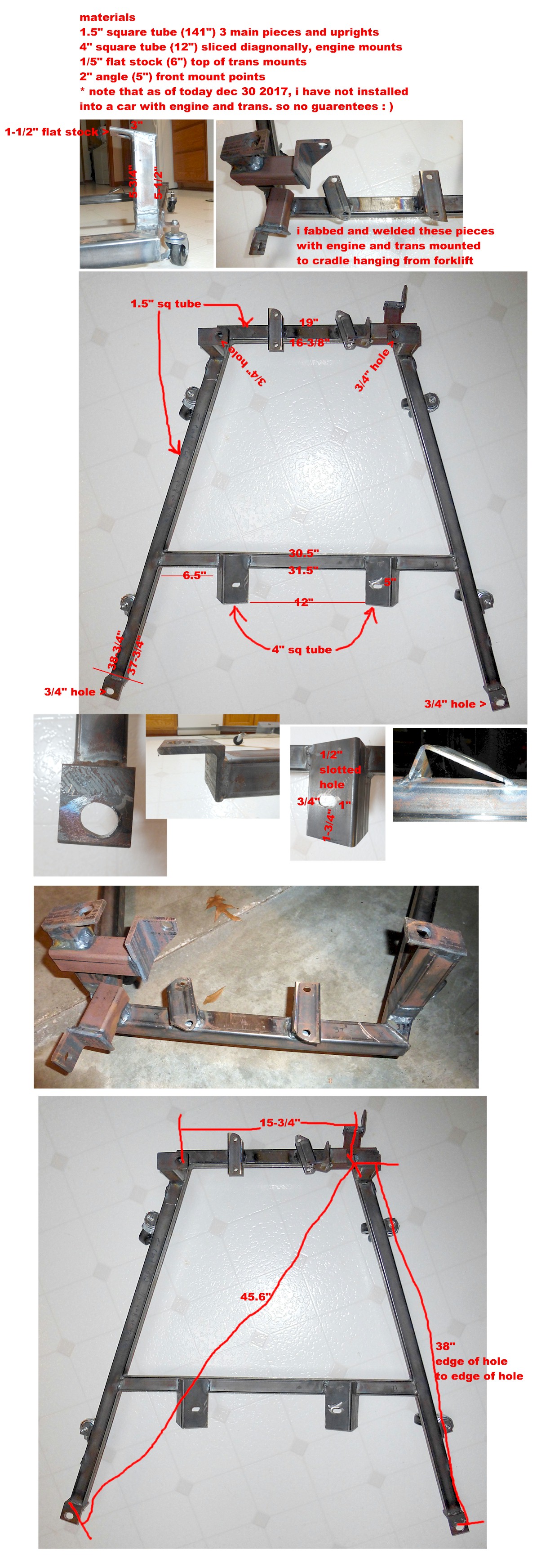 complete lack of energy and funds to proceed but plan to get back on it soon. thought i'd at least share info about the cradle i made based on coldwater's cradle's dimensions. for subaru ej series engine and 5 spd trans. you'll noticed some ovaled holes and such, this is my first draft which i took these measurements from. i have more notes at work that i will compare these to. i would have liked to fine tune this design and sell them but shipping (fully welded) is cost prohibitive.
