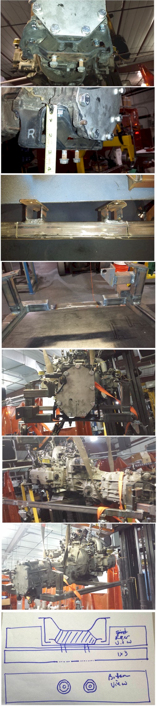 i corrected one engine mount i had in crooked and quickly installed engine mount in order to measure height between mount and body where trans occupies at trans mounts area. 9-3/4" space i have. time to double check if this is enough. then i'll replace half assed trans brackets with a real subaru bolt in trans mount. 14 degrees in delaware today, burr. guess i could cut out section with half assed mounts and weld in a piece of angle iron so i have a flat at the bottom side for 2 bolts bolts for suby trans mount. based on spare subaru 5 spd trans in my garage, about 10" of clearance is needed. so i am almost ON THE MONEY as it stands, using spacers as needed should suffice? Attached image(s)
