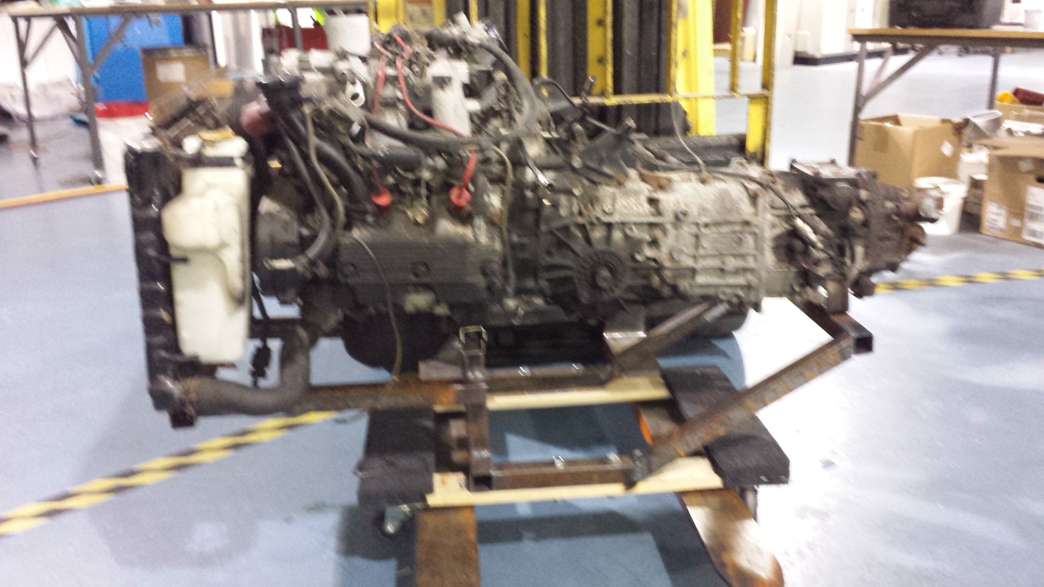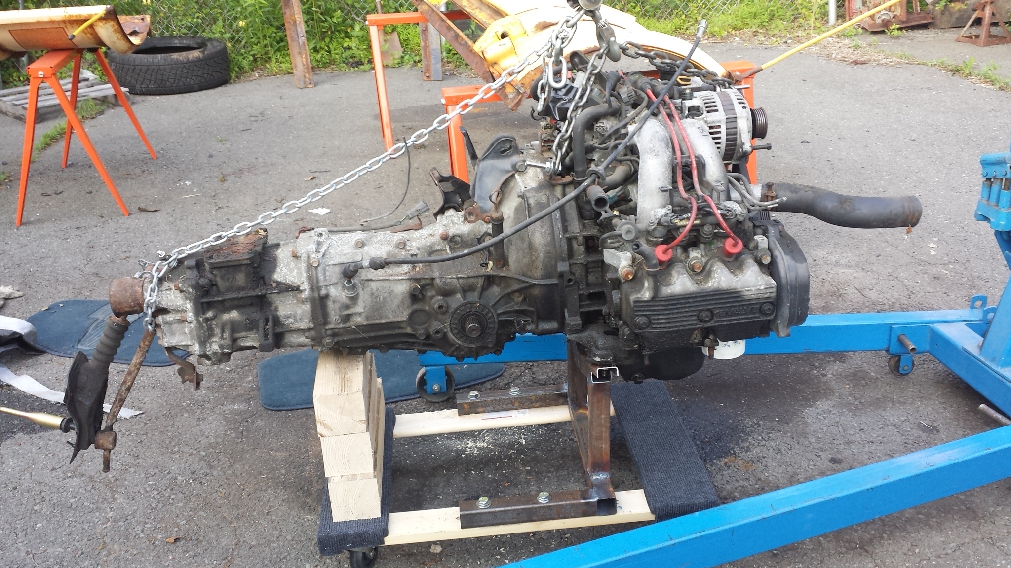 pulled engine and trans last night. made a cradle for running engine out of car today. this engine has one cylinder with very low compression but will be fine for testing STOCK ecu and wiring for FI. i removed hoist and am keeping trans and wood blocks in place with a ratchet strap, for now. 2.5 hrs of fabricating/welding and $10 harbour freight furniture dolly.