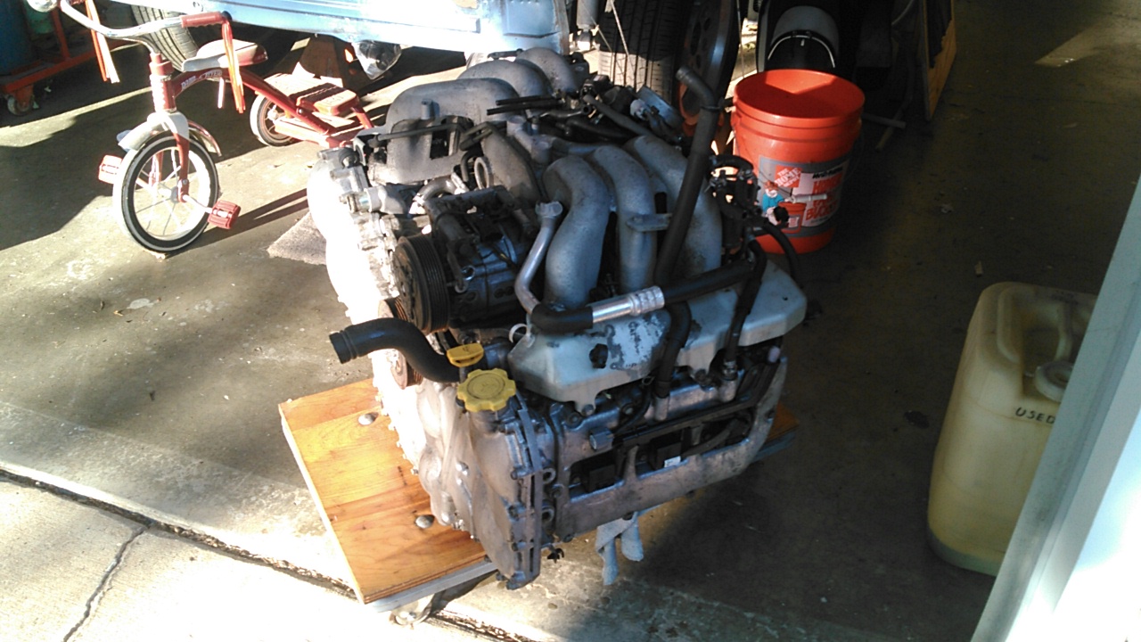 Wow! You stole that drive train. (IMG:style_emoticons/default/piratenanner.gif) Your going to love that 3.0. Smooth as a sewing machine and nice torque curve, 25mpg! Two things; did you get the ECU for that motor (IIRC, 2001-02 are the same; 2003 is different) and did you clean that oil cooler? I couldn't see it in the pics after you cleaned the motor. (IMG:style_emoticons/default/beerchug.gif) Yea I'm pretty much steeling your entire build idea. Its the perfect combo. I am not running AC but I can always retro it in. Both cars were 2002s and I grabed the intake + extra sensors out of the wiring harness/computer car. I pressure washed the motor just so mock up wasn't as greasy. I have to build the cradle, measure for axles, figure the firewall exit for the coolant lines, figure fuel feed, heater hose feed, and wiring/computer. Then the engine comes out and the bay gets cleaned up. I was toying with just replacing the cooler over cleaning but thats on the list after mock up. Steve |