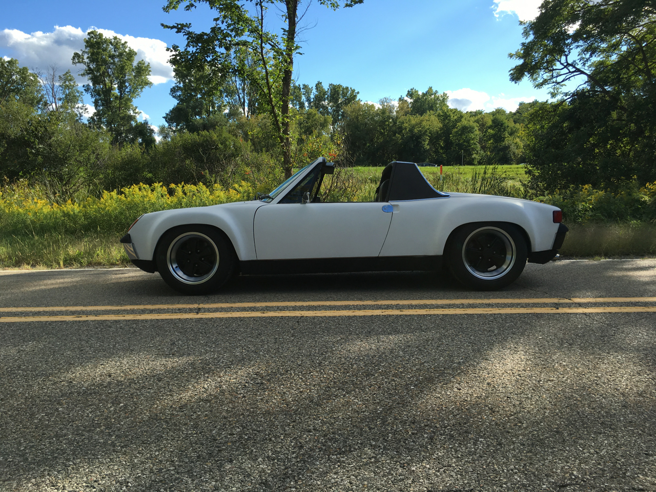 Michigan Build Link Build progress : A lot has happen in this month. I was going to just finish up a few things little things over the last 14 days, and then, I should paint the car!, since I'm going to Okteenerfest. So, I sprayed Plasti-Dip flat white. Came out OK, and I can peel it off! The engine was running some what rough. So I learned a lot about carb adjustment, and balancing. Thanks for the help from our community. That took a while, I'v always run FI. Changed out the targa sail trim back to chrome, from black. Installed wiper arms, lettering on the grill also chrome, from black. Drove it and pictures last Sunday. Im done. Unexpected challenges: Last second, 3 day labor day weekend paint job. Vendors: Local Paint supplier. Progress Pictures: Here are some before and after pictures, and a few others. 5 Major Tasks to complete during the Challenge: 1. Replace back half of rear trunk floor. (Rusted, rear ended, poorly patched) ![]() & Replace entire rear body panel, and Bumper. (Rear ended, poorly repaired) ![]() & Patch in 1/2 left front fender. (Poorly repaired) ![]() 2. Delete headlamp doors, modify hood, and relocate headlamps. ![]() 3. Install 4 steel flares, and modify all valances. 5 lug, and wheel tire package. ![]() 4. Build up, and replace engine. ![]() 1.7 914 Engine balanced 260 x 396 Cam .006 96mm Big Bore kit Mallory Unlite Distributor 14004 Weber 40 DCNF (w/ very short intakes) Air jet 1.80 Main 1.25 2.0 L exhaust Work in progress replacement. 5. Major interior renew. Un-planed: 6. Paint ![]() 7. Misc: ![]() Misc: Turbo tie rod ends, rack spacers, and firmer springs and shocks. Also went with a pair of old front calipers I had from the 70's these are Girling calipers, that were tested for use on some VW's And a few other things. Also a stock steering wheel. I try to use original hardware, and parts, where i can. Previously installed Dr.Evil rear view mirror, 3rd brake lamp, and Triad exhaust. Sound system 5 way amp, w-sub and iPod plug only, no head unit. Without the challenge, and all of the members here, I would have never got this done, much less within a year. Since as an example my other project car is over 10 years a work in process. I have enjoyed working, and sharing the thing I enjoy doing with my free time. I have been an owner since the 70's and still enjoy every view. See some of you at Okteenerfest, my last 914 event was 2005 Mid-West Classic I took this same car there then. Im long over do. Thank you, to all. [size=7]Don't miss the videos! Video #1 Video #2 Video #3 Video #4 Attached image(s)