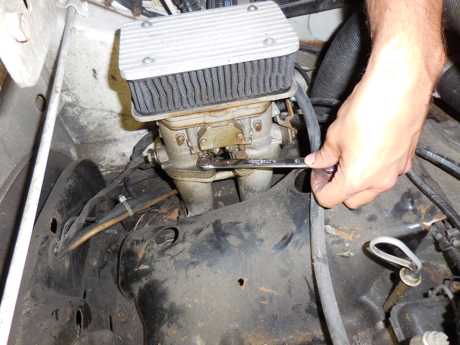 This car was the first car that Brett drove when he was 13 and was given to us in 2014. It had been sitting idle back in Indiana under a family friend's carport for the past 15 years before Brett went back to Indiana and towed it out to Colorado with his father in July 2014. (IMG:style_emoticons/default/piratenanner.gif) When we got it, we didn't have a garage to work on it and it sat idle being stored outside for another year until we could afford a house with a garage. Colorado is pretty expensive so after we got a house with a garage, we then needed to save up more money to work on it. Also I must mention in my ignorance, there were 3 distinct phases of thinking for getting this car fixed which I now find funny and are listed below Phase 1: I will tow this car out to Colorado and get it the engine running for maybe $2,000 and have a working car. Phase 2: Holy shit after researching this is impossible and will have to pay somebody to fix it for $15-20k. Phase 3: I have enough local support and 914world resources and can fix this myself for around $10-15k. Build-Off Challenge So Amy and I are going to be tackling different aspects of this car so the posts will be coming from both of us. I will handling the rust/engine work and Amy will be on Interior and Exterior. Also she may help with some of the posting so we will start each post with name. Brett Step 1 (Complete) was to remove the engine and assess the frame rust situation. Never having removed an engine from a car, this was an extremely daunting task. The steps listed in Pelican Parts tutorial - 914 Engine Removal Made Easy is by far the most difficult thing I have done to a vehicle thus far. Hell I don't even know the difference between a camshaft and a carburetor much less a CV joint or a clutch cable. But after staring at it for about 2 weeks, I decided to just start unhooking shit and labeling. Made a ton of progress and finally got the engine about 95% unhooked. Had a friend come over to help me out and we actually got it out. WOOHOO!!! Step 2 (Complete) is to strip out all the interior. I ordered chassis braces and other misc items from Tangerine racing and am still in the process of identifying all the rust areas that need repair. Attached thumbnail(s) Attached image(s)