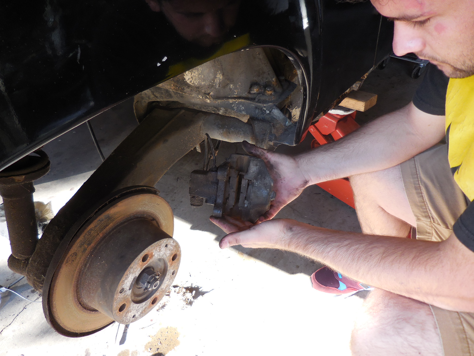 So have kind of been in somewhat of a holding pattern on the rust repair until the chassis braces arrived. While I waited I started working on the brakes and had planned on replacing the pads; however, upon removal, the old pads are about the same size as the new ones and I figured I would just leave em on. Questions: 1.) The rotors appear in decent shape and the car has only 73k miles so I'm wondering do I need to replace the rotors or just get them turned? Right now leaning towards getting them turned but with putting a Subaru engine in it, would it be wise to upgrade the brakes anyhow? 2.) Im planning on painting the calipers but wanted to get any advice beforehand. I am not sure on the color yet but wanted to get em looking good again. Any tips are appreciated. 3.) I'm planning on purchasing a wiring kit from Jeff's 914, but not sure which one to go with since I'm doing a Subaru conversion. Any ideas? Also, Amy's seat heaters arrived last week so any wiring harness I get must accommodate seat heaters for both seats. Next topic of business: I am going to be getting married next weekend to the lady whose working on the interior of the 914. So I/we haven't been posting as much as we'd like and wont be doing anything for next few weeks until we return from our honeymoon on the 9th. After we get back though it will be balls to the wall on the rust and Amy is going to start on the reupholstering and interior. (IMG:style_emoticons/default/party.gif) Thanks Everyone! -Brett Attached thumbnail(s) |