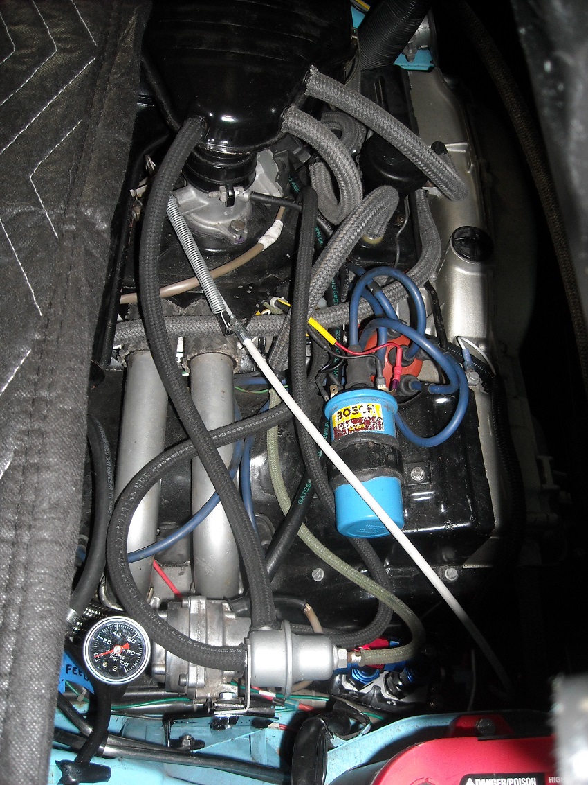 During some of my drives I noticed the oil temps getting high, into the 240-250 range on hot days. So adding an aux oil cooler seemed to be a good idea. Guess the 2056 makes a little more heat than the stock 1.7. Mentioned this at Okteenerfest and Danny @Bahnzai sent me a sandwich adapter he wasn’t using, giving me some more incentive. I used a Setrab 119 fanpack cooler and their 180 deg cooler thermostat, I added the 190 deg switch to trigger the fan. Looking through other oil cooler threads I liked the routing of lines above the tins so as not to block the valve cover. Pictures of the brackets, everything fits in there nice. It helps to have a friend with a bandsaw and bending brake. ![]() With this short of a run from the adapter to the thermostat the AN10 lines may as well be rigid. So I had to have the lines determine the position of the thermostat. I used the hole that the J tube used to go into. I was getting plenty of heat with just the one hose from the blower anyways. I capped the S pipe. ![]() the fan thermostat is mounted in the black piece in this picture It also allowed me to stack the lines vertically on their way to the cooler. ![]() The fan is a pull through type, with shroud. ![]() Space is a premium in this area and I had to make a standoff to move the MPS a couple inches so everything would clear. ![]() Used AN10 lines to give enough flow. Things are pretty crowded in this area now, I was worried about clearing the injectors. But everything clears. it isn't easy getting your fingers down in there to work though. ![]() The best part is I didn't have to remove the engine to install everything. Being March, the temps are not yet hot enough for a real test but a speed run down the turnpike today, a 60 deg day, I only saw the oil temps hit 205 and it moves back down much quicker than it used to. |