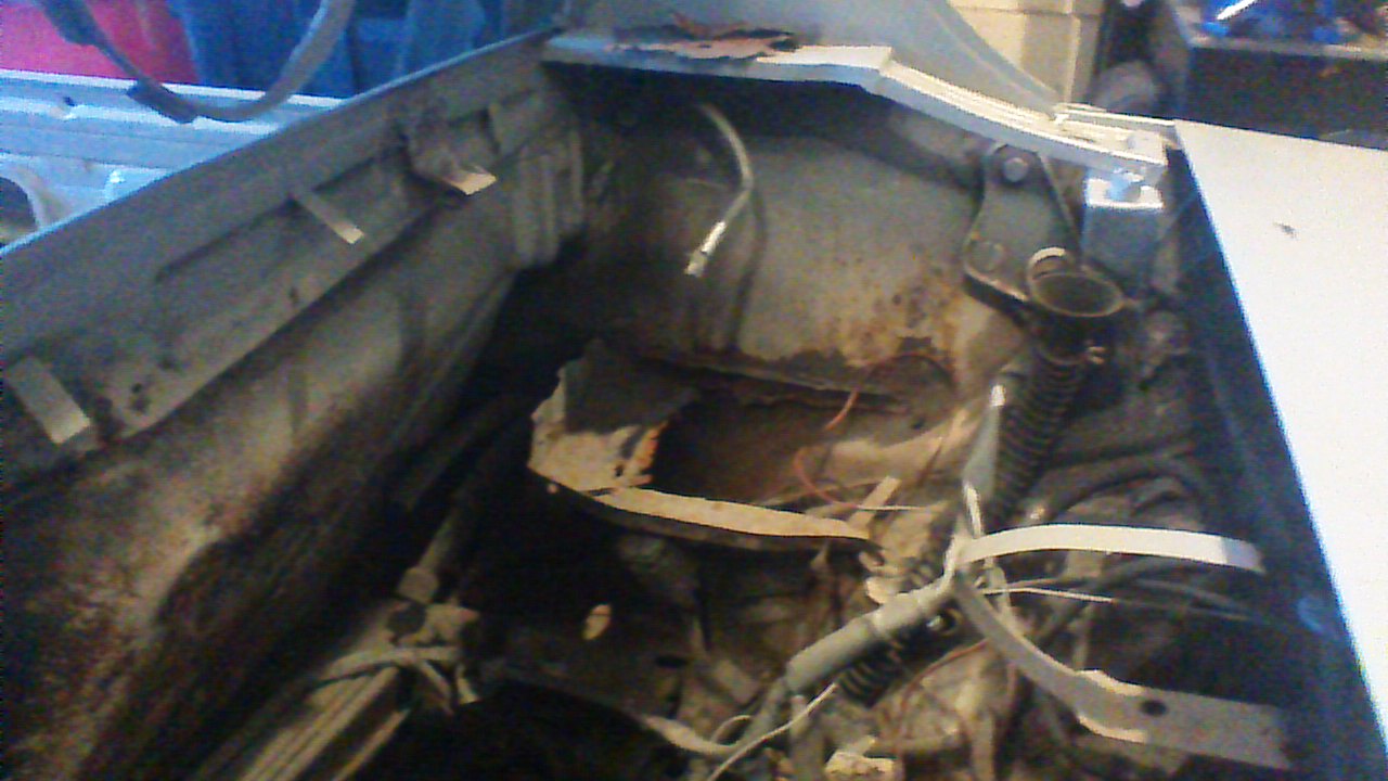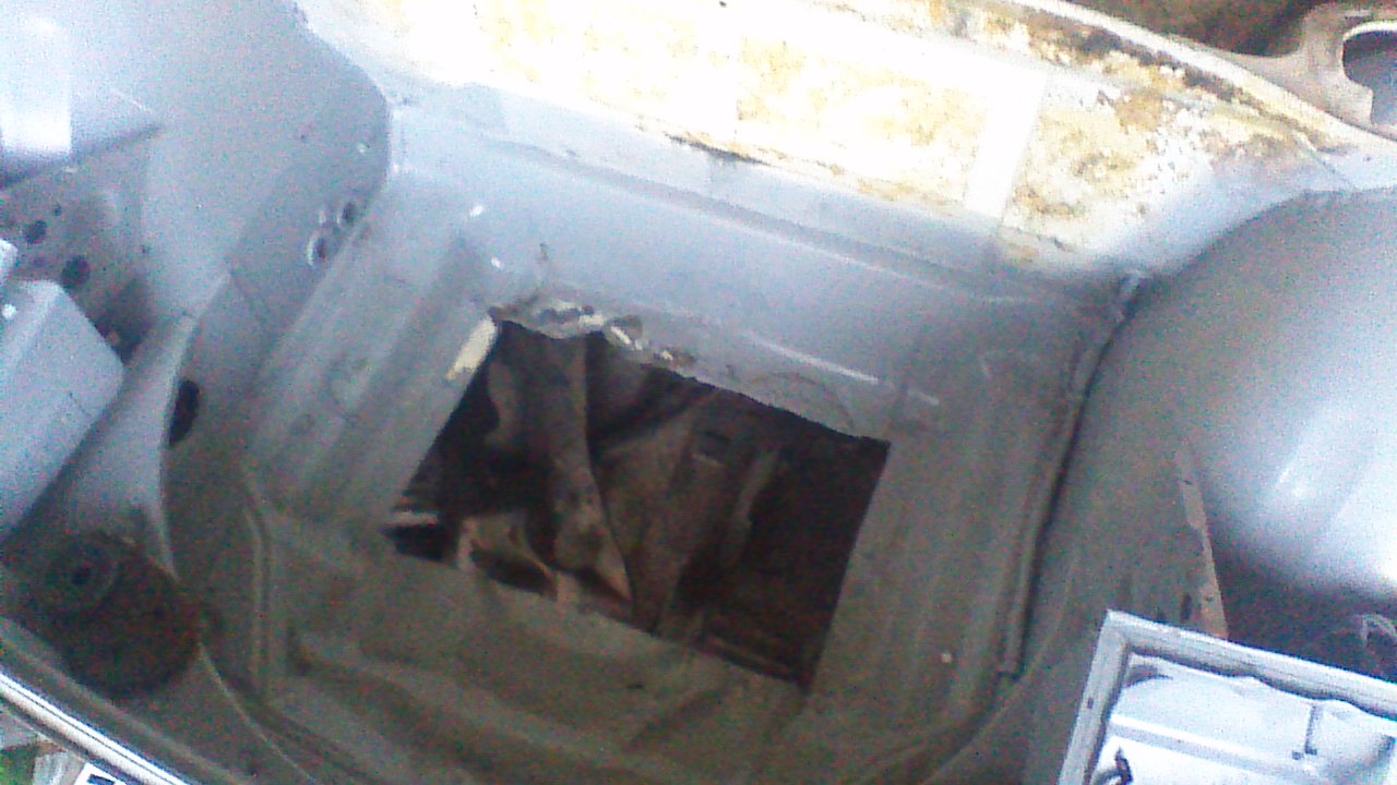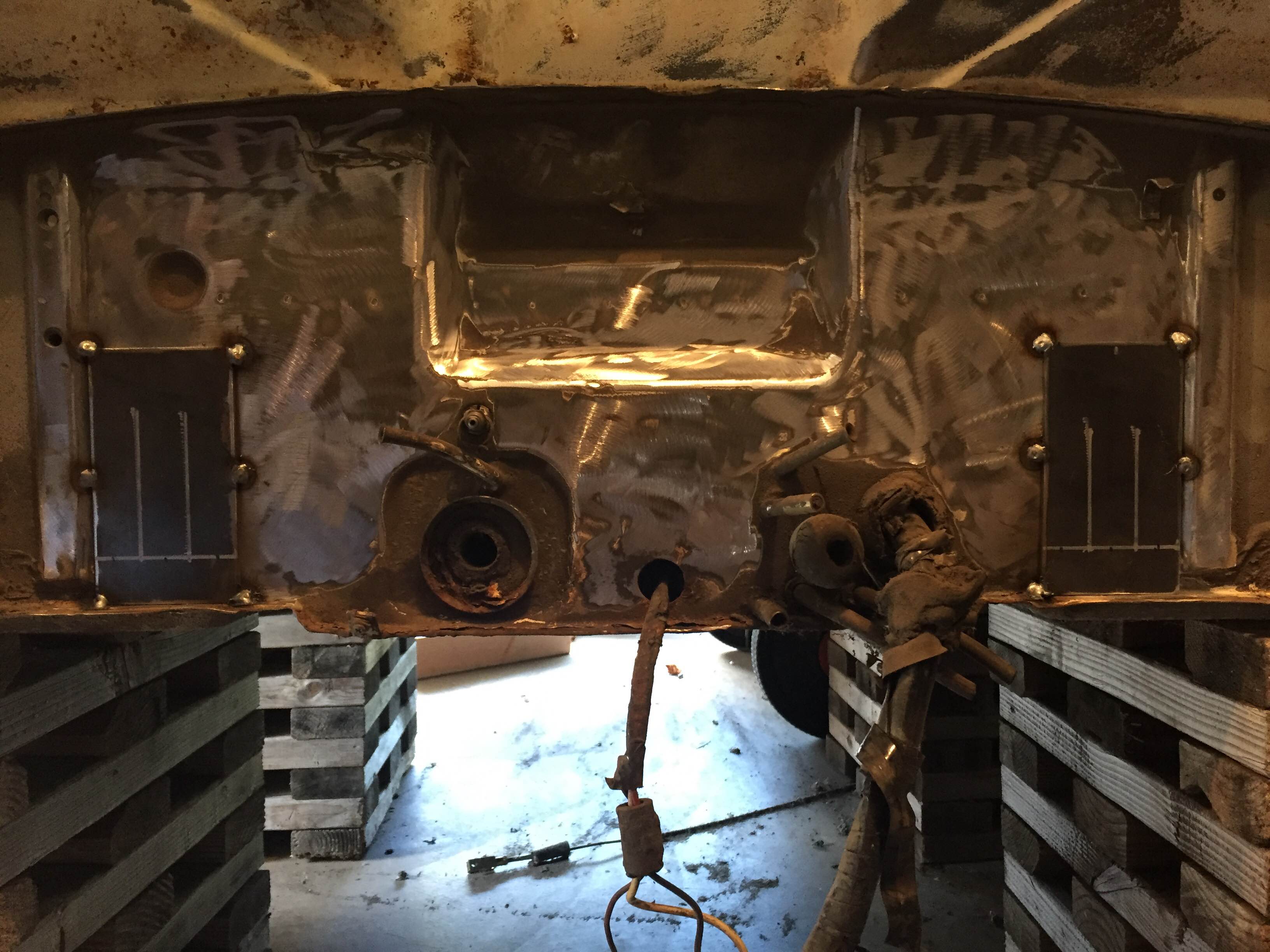 The car is a ’74 1.8L presently on jack stands with both front and rear suspensions removed. Motor and transaxle is removed with plans for a Subaru conversion. Driver side floor pan under the seat has rust which I plan on replacing and of course the battery tray is rusted pretty badly. This was an A/C car so the front trunk had been cutout which I have tacked in a replacement panel from Restoration and Design. The body itself has been blasted and a sealer coat of primer has been applied to protect the metal, by no means is ready for paint by my standards. The underside of the car is as it was from the factory 41 years ago. I have a little surface rust in the trunk area, which is remarkable considering it has spent most of its life in the Pacific Northwest.
