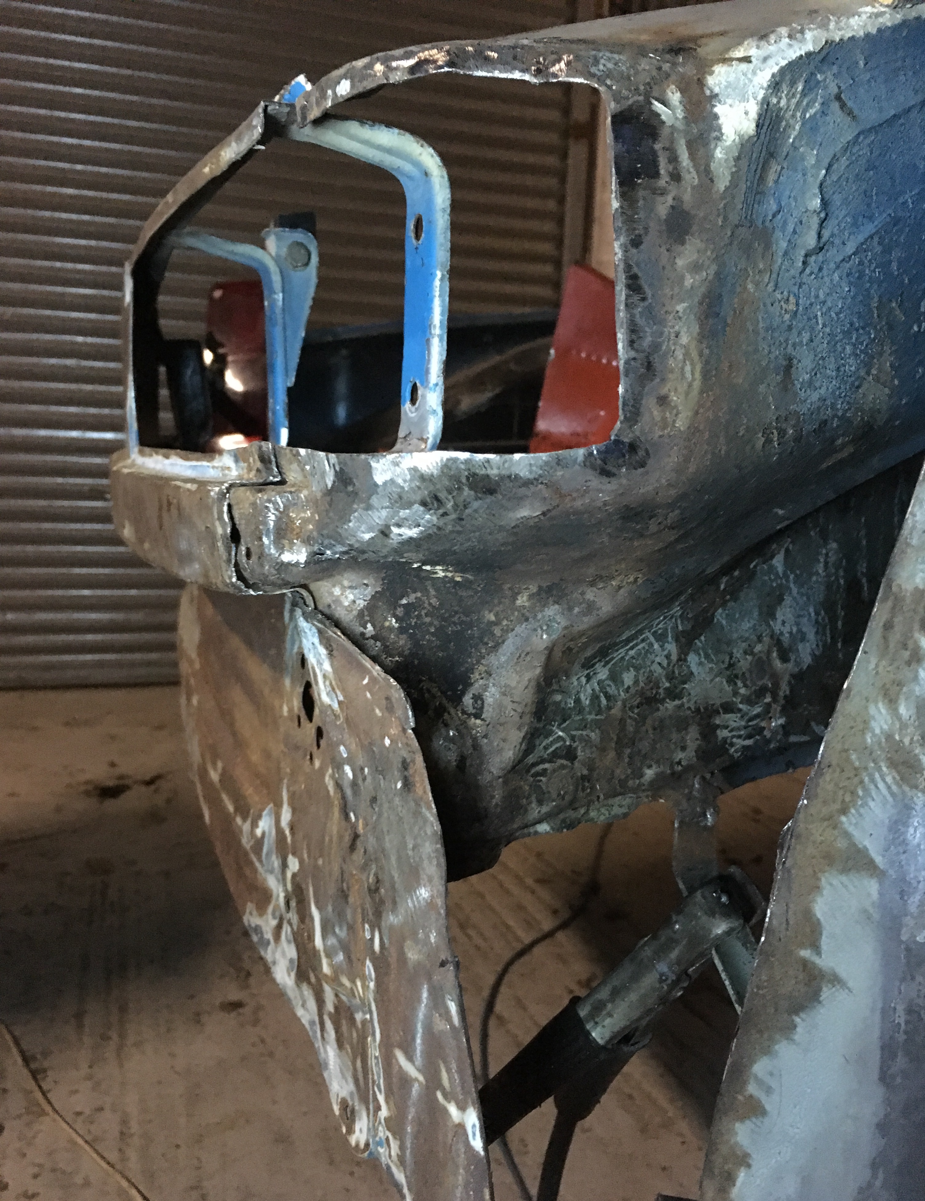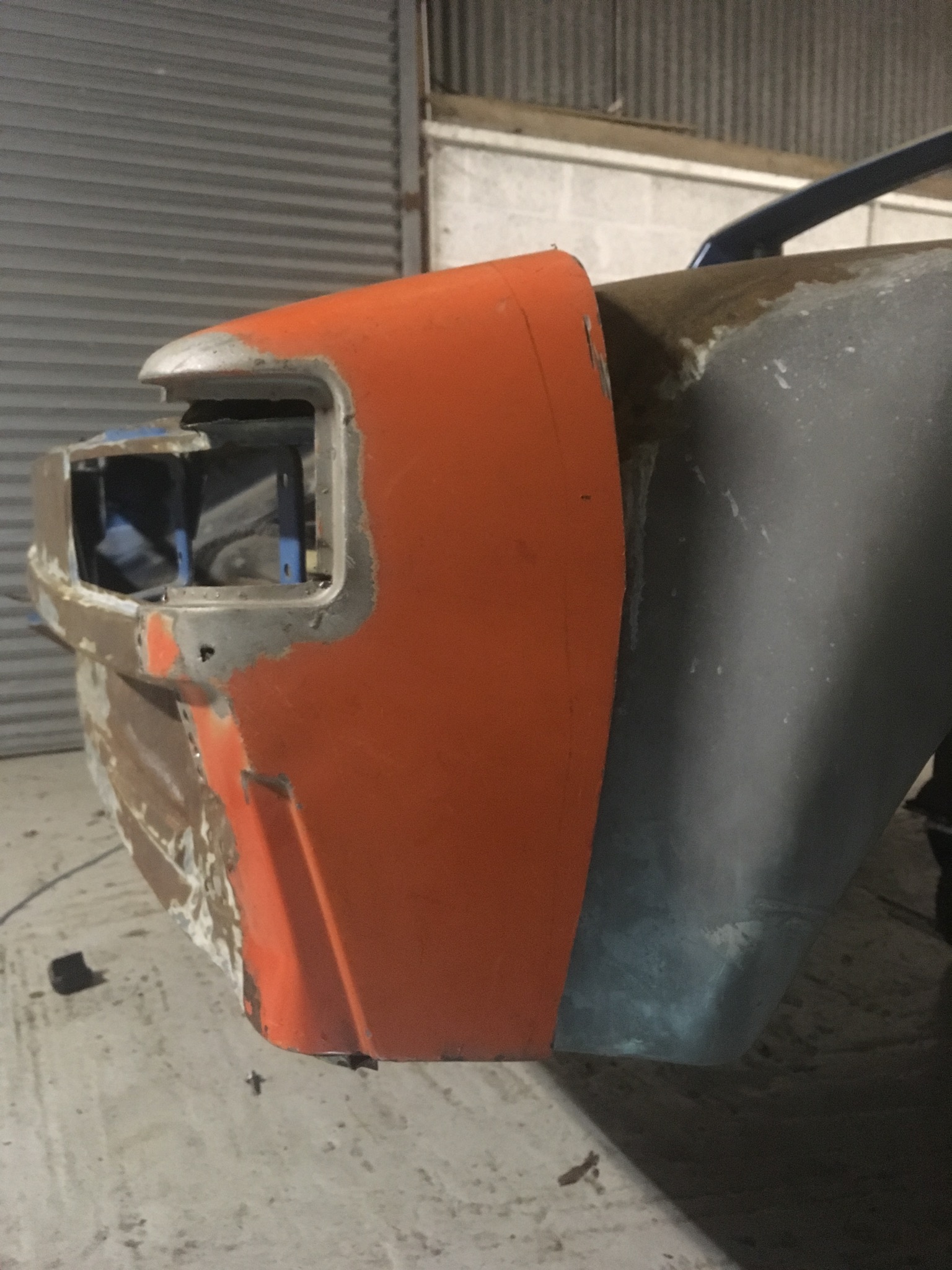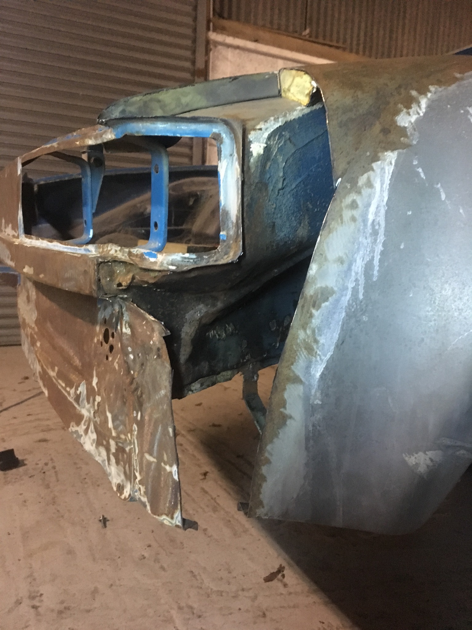 So i've finished up the front repair lastnight very pleased at the finish, so i'm moving to the steering column and the park brake next. i also re fitted the strenghtner within the trunk as well, i'll refit the two tops after media blasting ![]() |