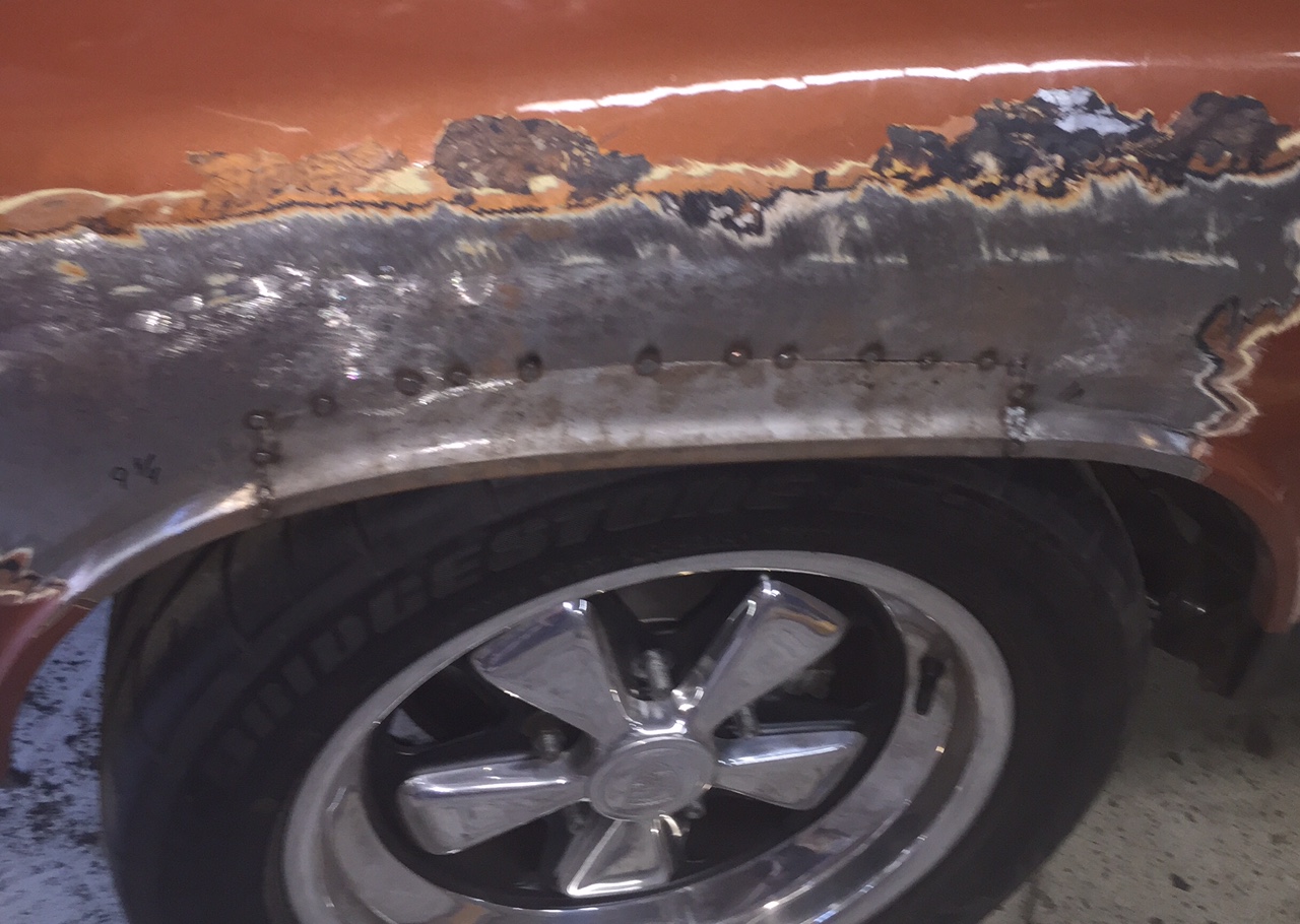 Good news to report! Here are some photos that Chris just sent- try had a lot of work to do in the rear fenders- the lips were bent badly and creases on the fender from a poor attempt to roll them- then they rubbed and caused paint blistering- the 7" Fuchs didn't fit, but they are staying in the car- so Chris's guys were able to carefully pull them out about 3/4", and replace the whole lip from a donor and in the end you can see the view from behind the profile looks perfect and I think once primed and repainted you will not be able to even see there was work done! - way better in my opinion than putting whole flares on the car- I wanted the stock look and lip, just enough room for the wheels and tires.