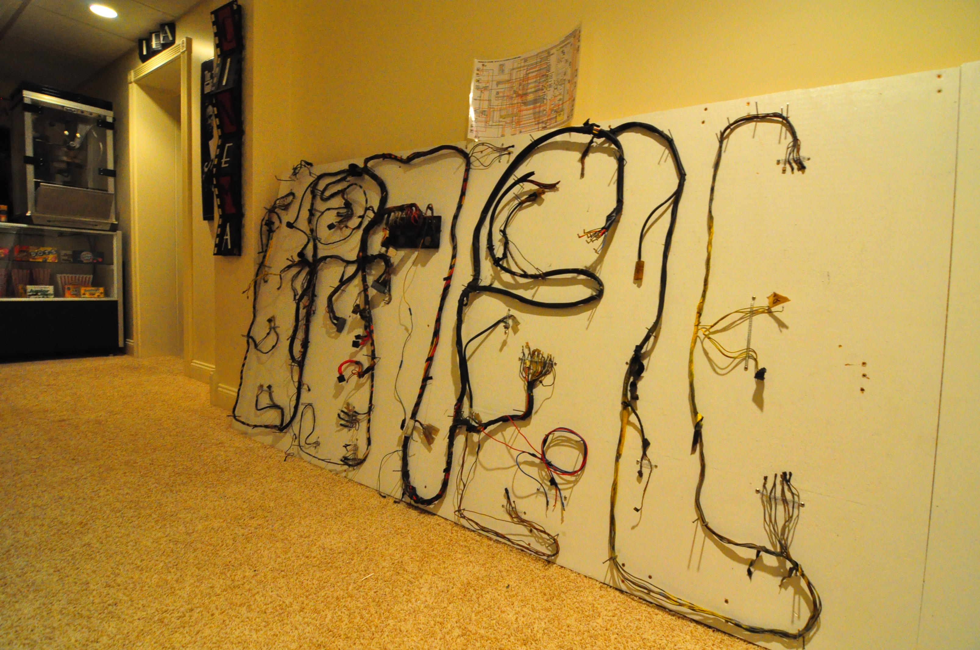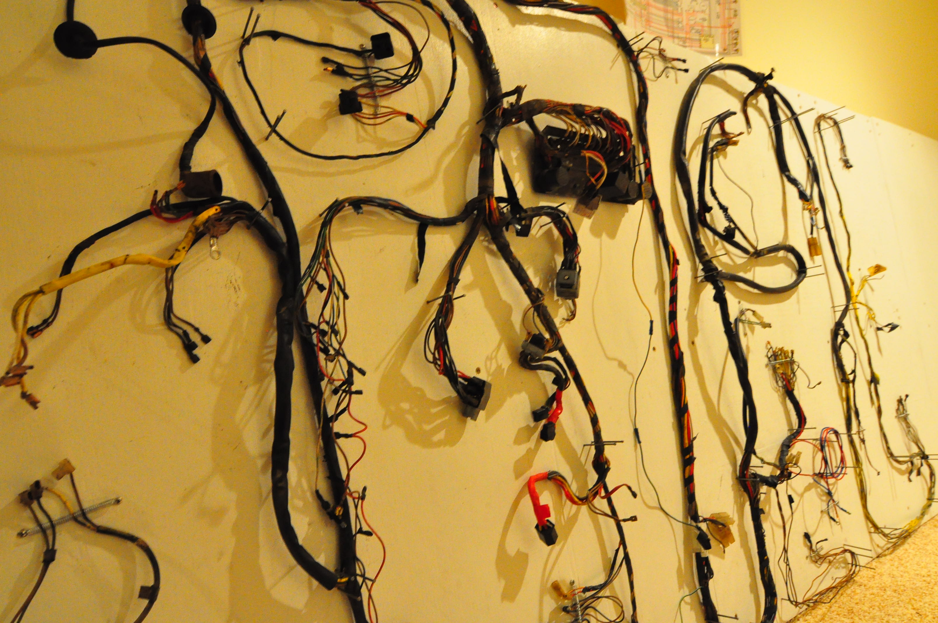 I decided to layout my wire harness on some plywood in my basement. I plan to check every wire and replace as needed, clean every connector and rewrap the harness as needed. If I get ambitious, I might label every wire so that it will be easier to install it when that time comes. As bad as the body is, the harness is not much better. Lots of wires that have multiple splices in them, wires that have damaged insulation and wires that appear to go nowhere. I don’t know how much I will work on this in the coming months since it is a low priority task, but the goal will to have the harness done by the time the car is ready to paint. Just catching-up on some threads. Great idea with the wiring harness!!! |