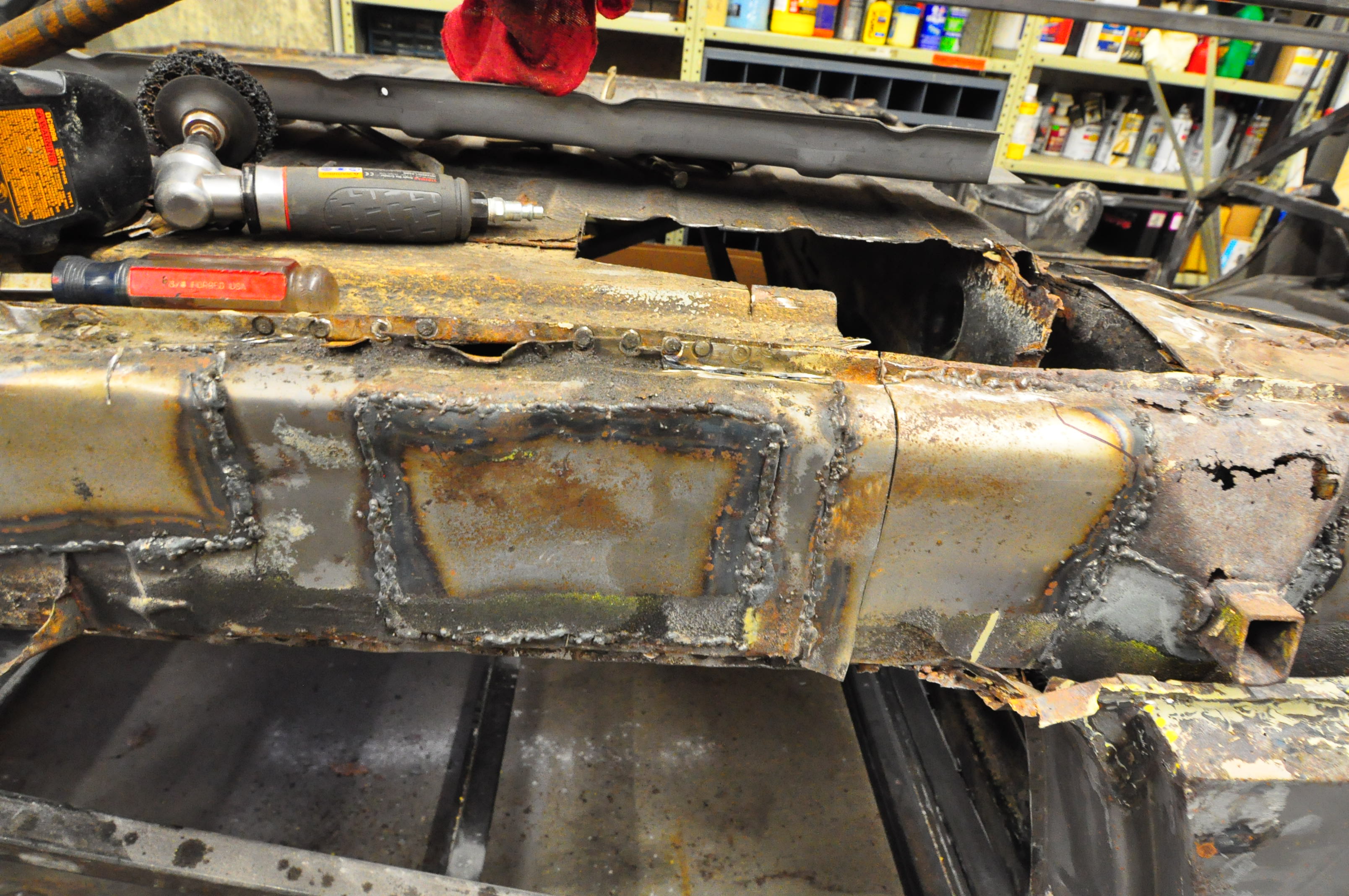 Replace your cut off wheels before they get down that far, Dont put much pressure on the wheel, let the RPM do the action. Are those welds on the longs yours or the PO? I always wear welding gloves when I use cut off wheel. They offer the most protection. Those are NOT MY WELDS! I would not make welds like that and if I did I wouldn't show them to anyone! Look at the rest of my thread to see examples of the poor welds done by the previous PO's. Sadly those welds are some of the better ones that were done on this car. I didn't put any pressure on the wheel. The grinder was moved around a lot and I assume the wheel got a chip in it. I know better now, but the pneumatic grinder is so much easier to use I don't think I'll have any other problems. |