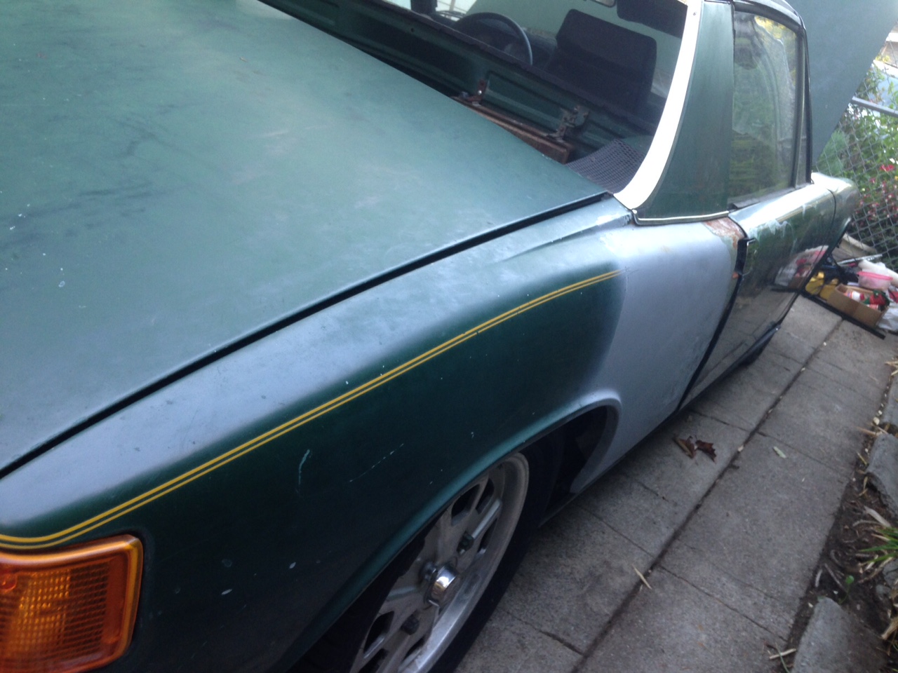I really like the color. What is it? Is it the night shots playing tricks. It looks darker than the green I'm used to seeing on 914s Seems we made about the same progress and you have a much better excuse. Steve Hi Steve! The car mostly has original L60E Irish Green paint on it. So, it's faded over the years. The front of the car and the passenger side were re-painted at some point after that collision damage on the passenger side door and rear quarter panel. I have no idea how long ago this happened but it was many years/decades perhaps before I bought this car. Irish green is darker than Zambezi(mispelled?)green. I believe Irish Green is the darkest green that came as a stock color from the factory. Progress is slow as far as actual work goes so far but I've been hobbled by my surgeon. I'm almost there and believe my doctor will officially say I've healed on my upcoming doctor's appointment this coming Monday. I can't wait to be able to wear a matching pair of normal shoes again. Something I've not been able to do since the beginning of July. It's been a long but miraculous rehabilitation. I almost lost my foot after getting bitten by a Brown Recluse spider. Nasty little devils! On another note, I also have incurred many thousands of dollars in medical bills even after insurance so that will slow down my progress for painting and buying new heads for my engine. I'll get it done by hook or crook but it definitely will cramp my style for the next year or two till I get it all paid off. It sucks but I'm very grateful to still have my foot. Had I lost it then my Porsche days would have been finished. |
