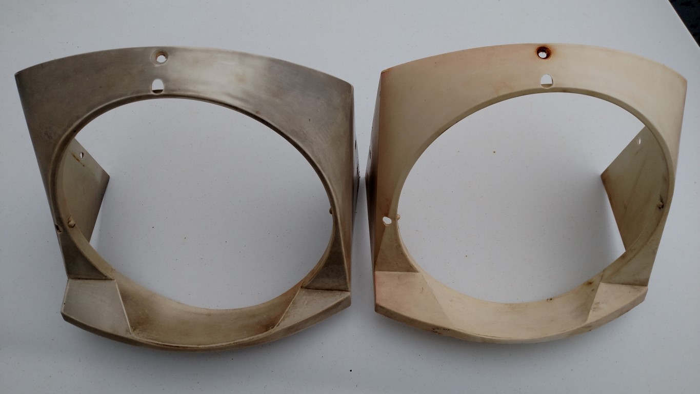 One of these was black paint directly on the plastic, the other was red oxide primer over spray. I have a couple more that had grey primer, grey primer + black paint etc. I'll try one of the grey primer ones next. Hopefully the staining won't be as bad as the black and red. You'll see in one pic where I sanded a spot on each and how much of the discoloring that removed, hence my attempt to soda blast next. FWIw the sanding did not fuzz up the plastic, or leave overly harsh scratches. I think if I can find a way to sand off the staining, the housing can be progressively wet sanded back to a smooth OE finish Attached thumbnail(s) |