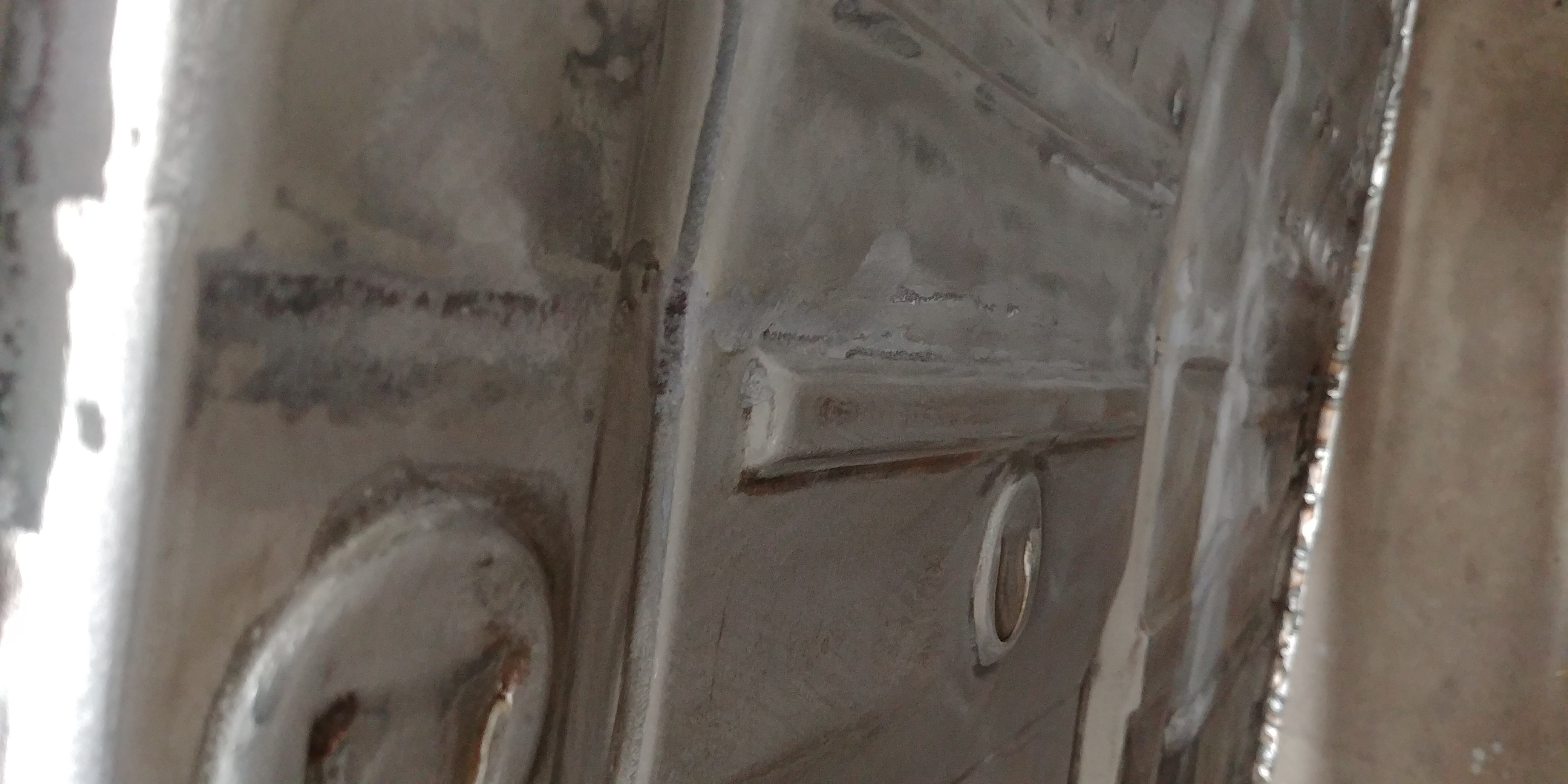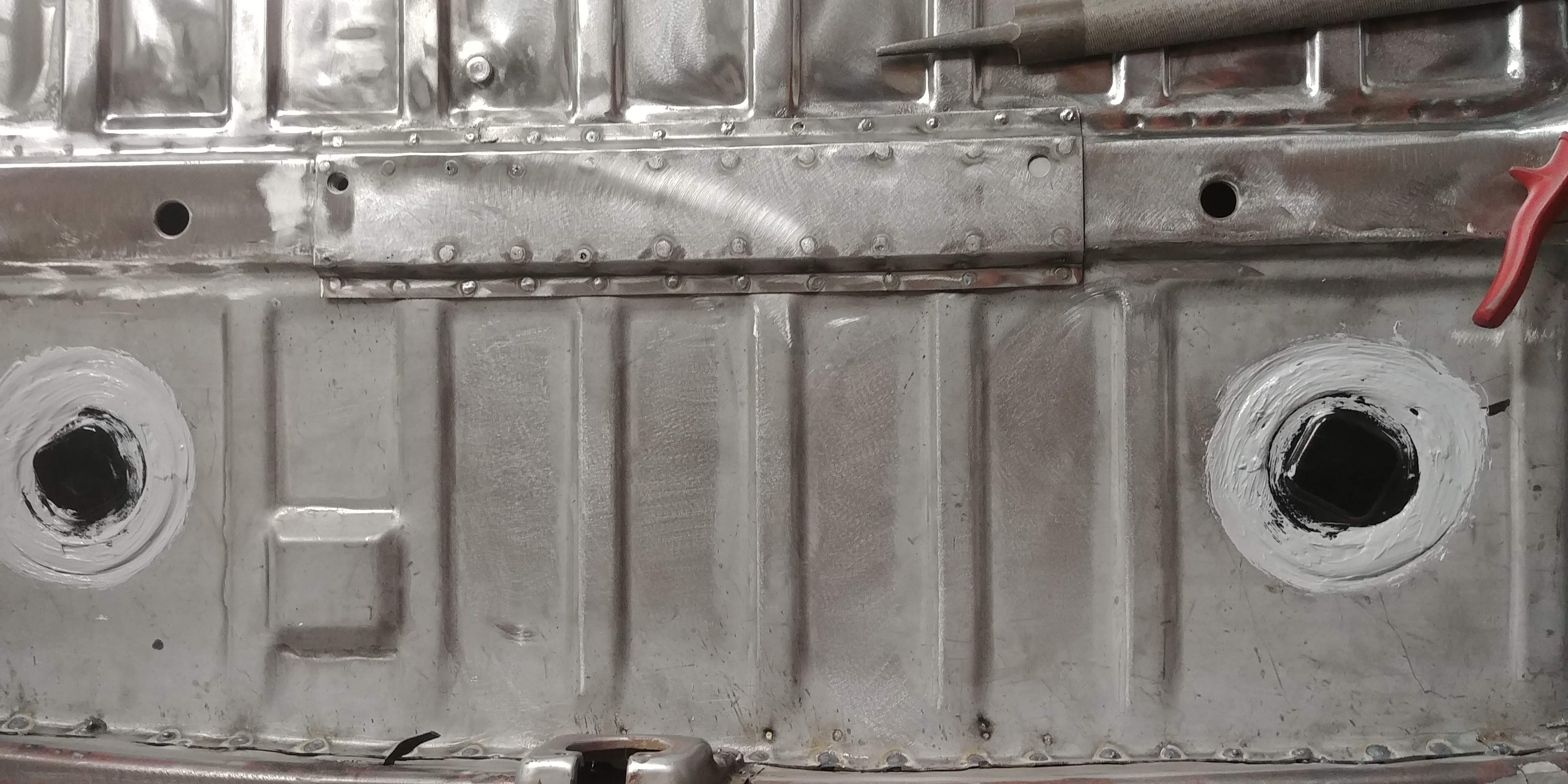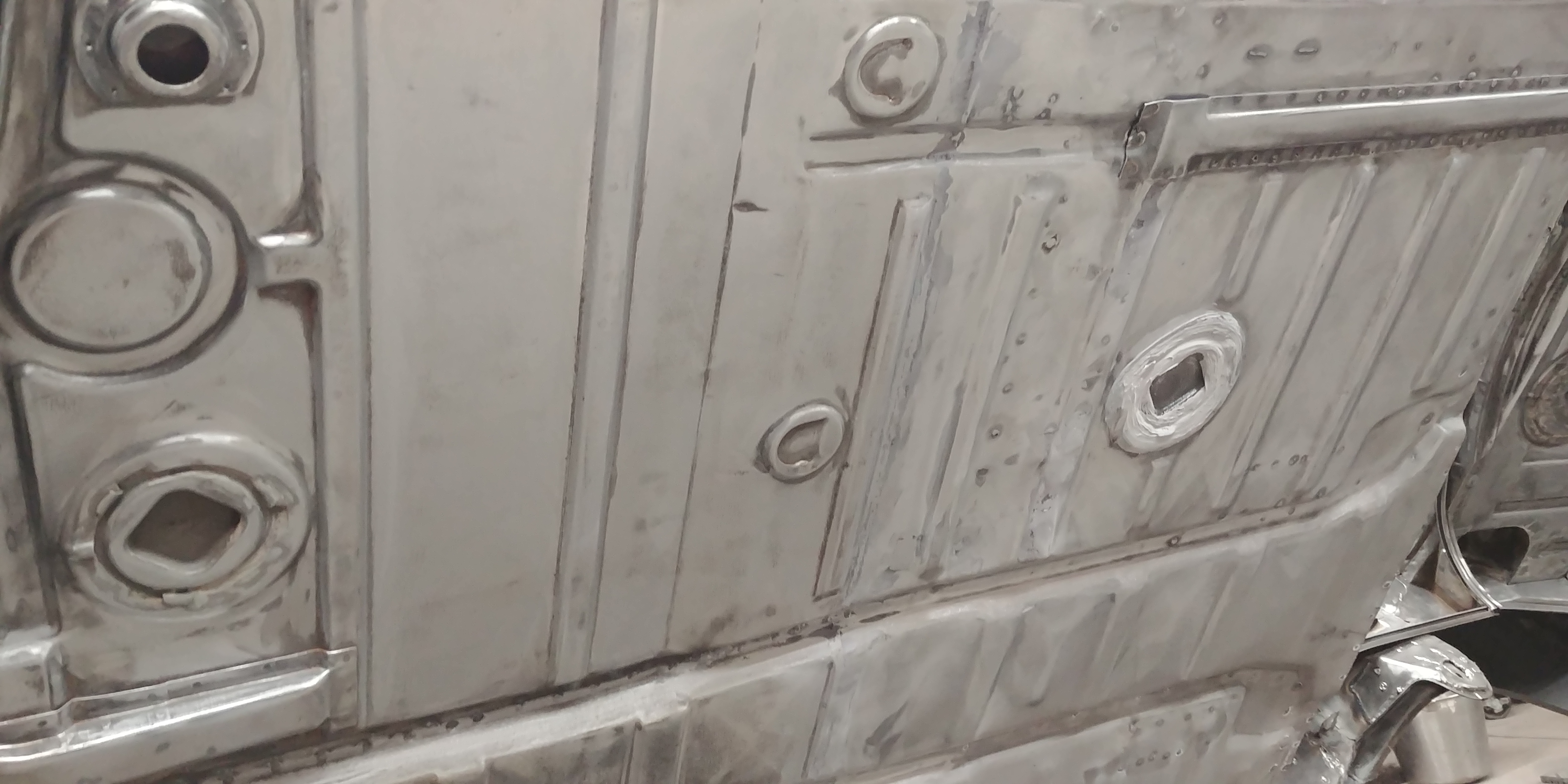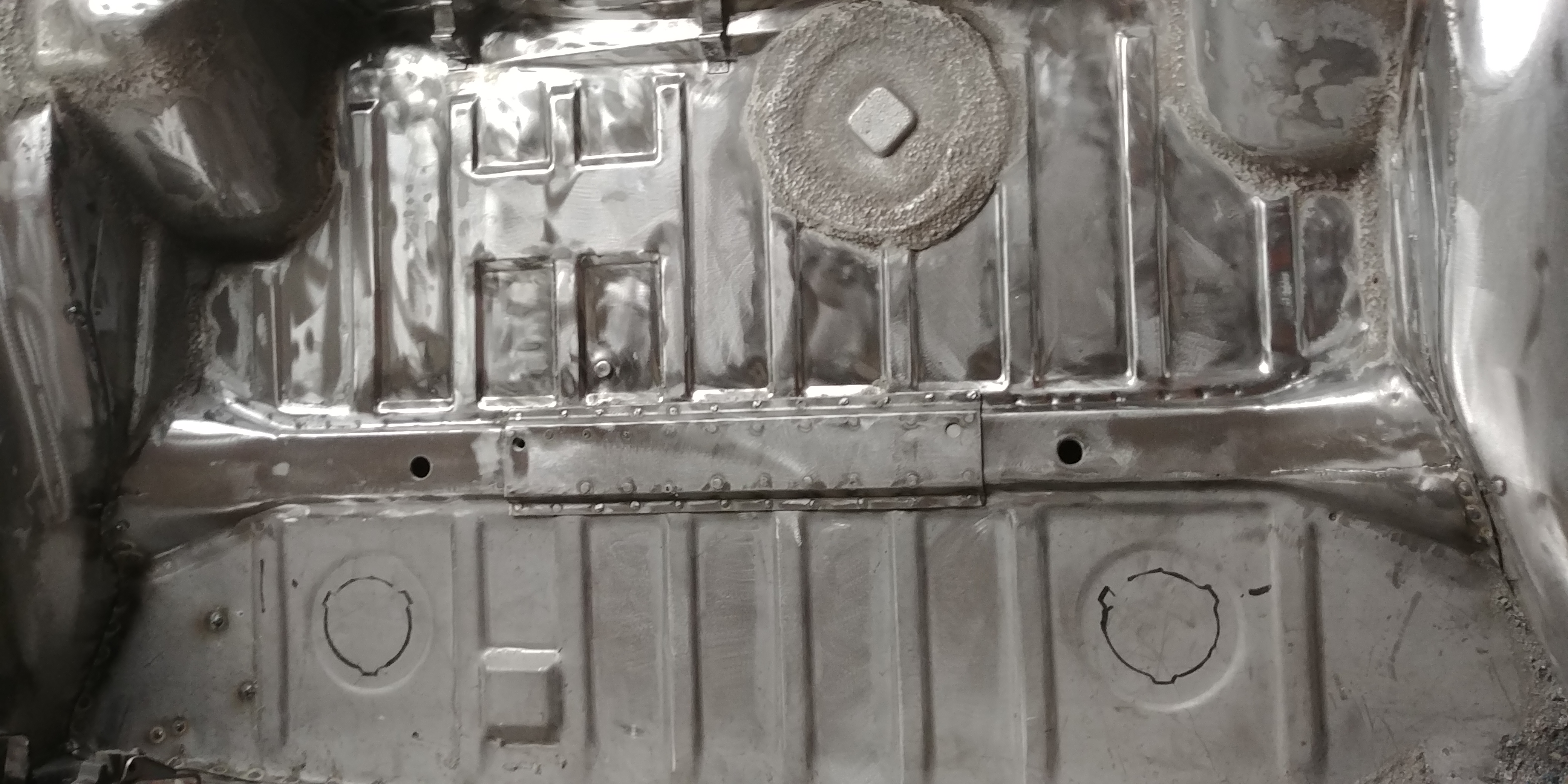 Spent 2 hours last night grinding and blending and removing old paint from wheel wells , and above where the rack is located. Installed 3 more of the plugs into the floor pans. I am missing 1 and need to find that one some where in my stash.