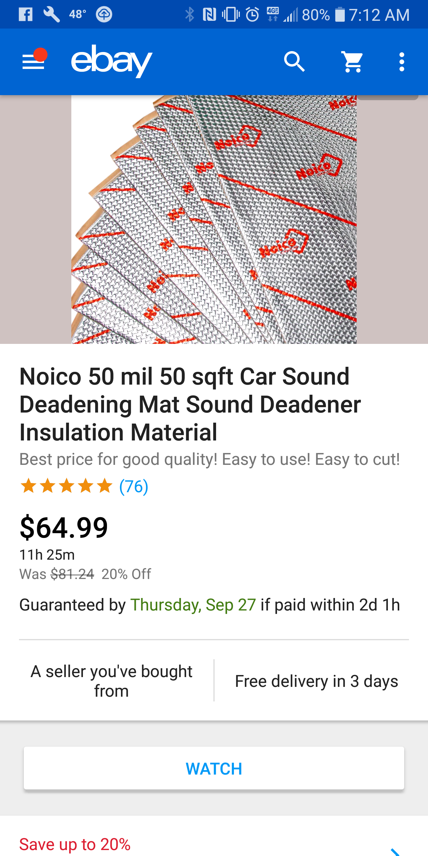 @Dion the noico was on ebay 50 sf for 60 dollars. I am nearing completion of installing it and there is more then enough to do the whole interior plus inside the doors..