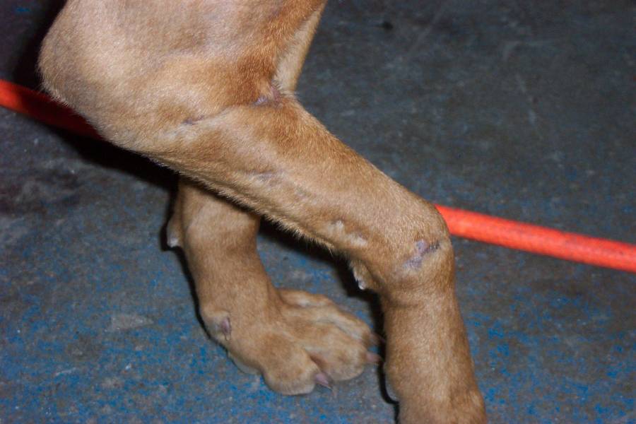 Could be a Rhodesian Ridgeback. This breed is known for fragile suspension especially the rear leg joints but sometime the front too. My brother has one and had to replace one rear joint that cost similar to a Jake Raby motor. Just guessing but perhaps this explains some of the markings. (IMG:http://www.914world.com/bbs2/html/emoticons/huh.gif)