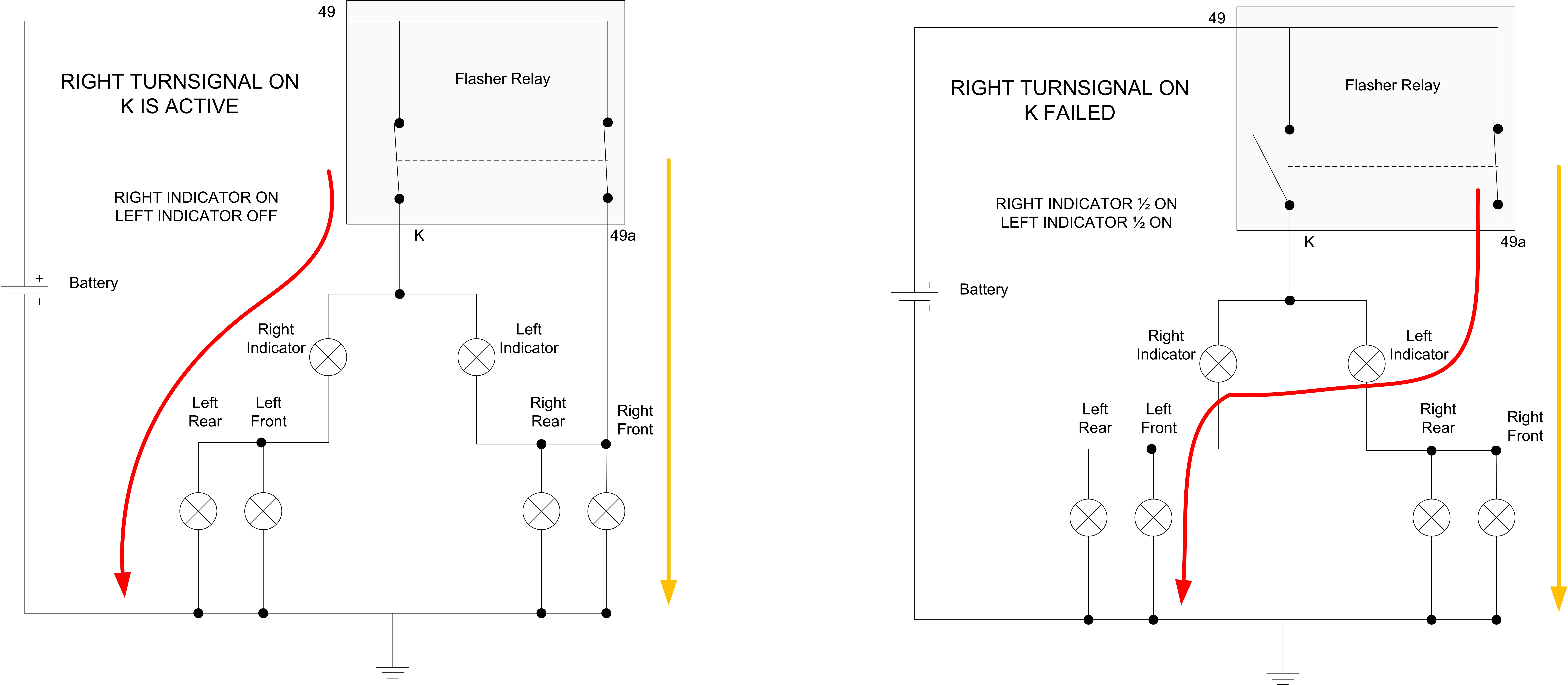 The diagrams show the flasher when the right turnsignal is selected and the lights are flashing ON. The K lead relay contact is closed when the high turnsignal current with standard bulbs flow through the main contact. In the left diagram, the secondary relay contact on the K lead is closed and current flows through the RIGHT turnsignal indicator and through the LEFT turnsignal bulbs. In this case the right indicator bulb is much lower wattage and higher resistance than the exterior high power standard bulbs and thus drops almost all the battery voltage and lights up. The small indicator current does not light up the left side exterior bulbs. I'm not sure why it's connected like this but there it is. In the right diagram, the secondary relay coil for the K relay has weakened over time and lost its efficiency. Now the K relay may close for the first flash or two then totally gives up and remains open like shown. What happens then is the current flows from the 49a turnsignal pin through both left and right indicators and through the left exterior turnsignal bulbs. Both left and right indicators light at a diminished intensity. The only solutions to this are replacing the flasher with an OEM or EP26 flasher, or disconnecting the center connection to the K lead and grounding the common connection as detailed above. EP26 needs modified internally to short the K/C2 lead to ground. I do this to EP26 flashers that I sell. |