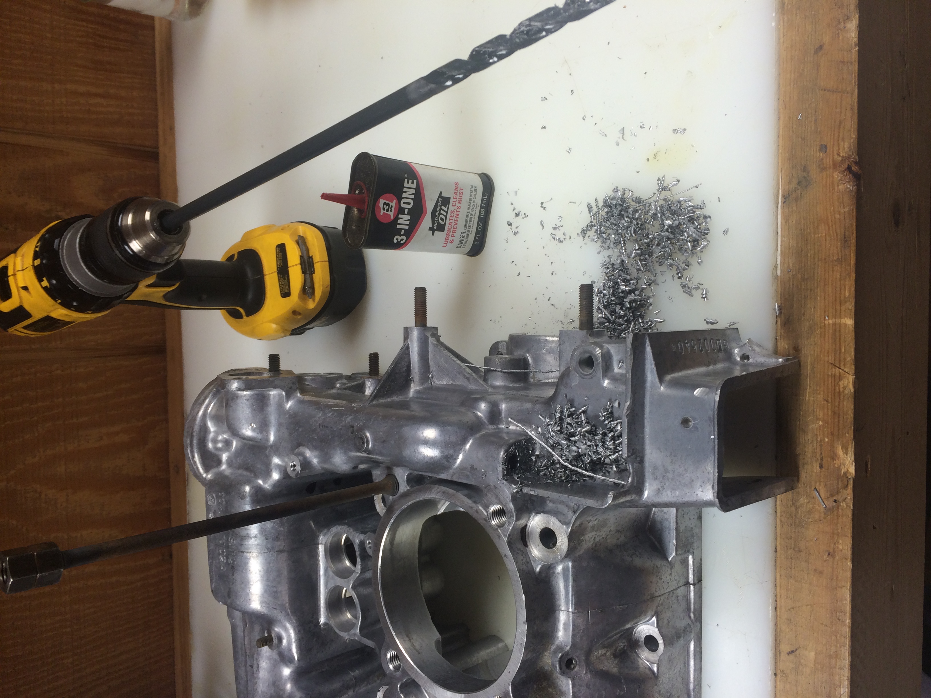 Oil Dipstick Tube fitment. Bus engine cases need to be drilled. I am using 5/16" hydraulic brake line press fit into a 5/16" hole in the case. Will secure with some JB Weld (or other) when complete.