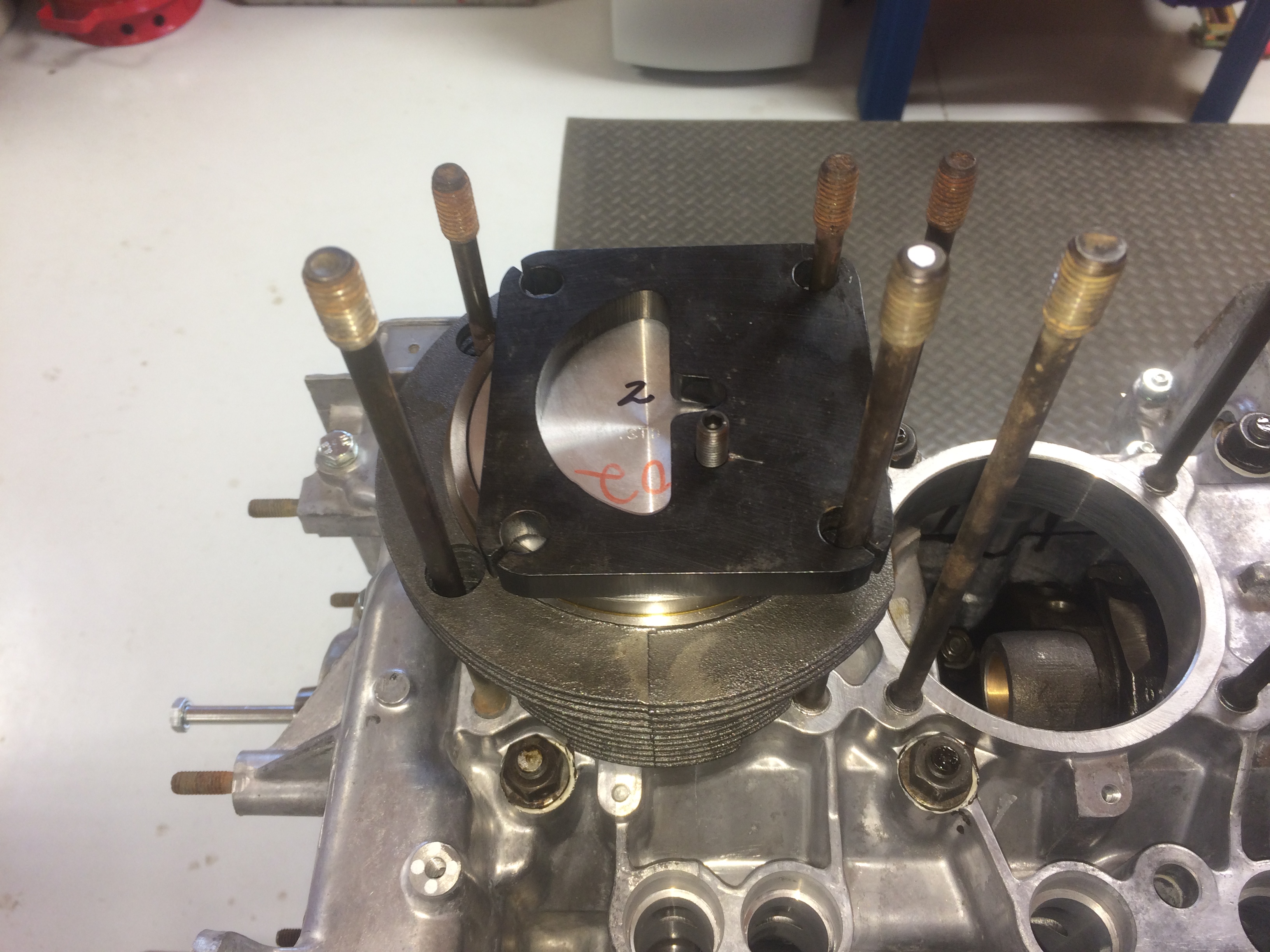 The screw in center(ish) of this plate is calibrated such that 1 full turn = 1mm. So with this tool I can use the calibrated screw to take a number, I can use feeler gauges to take a number, and I can also use a dial indicator (once I weld on the additional plate) to take a number. I just hope (pray actually) that all the numbers are the same (or very very close). That calibrated screw is not directly over the wrist-pin I know, but I am comfortable with this approach. No shim/gasket between jug and case, and a single piston ring installed. |