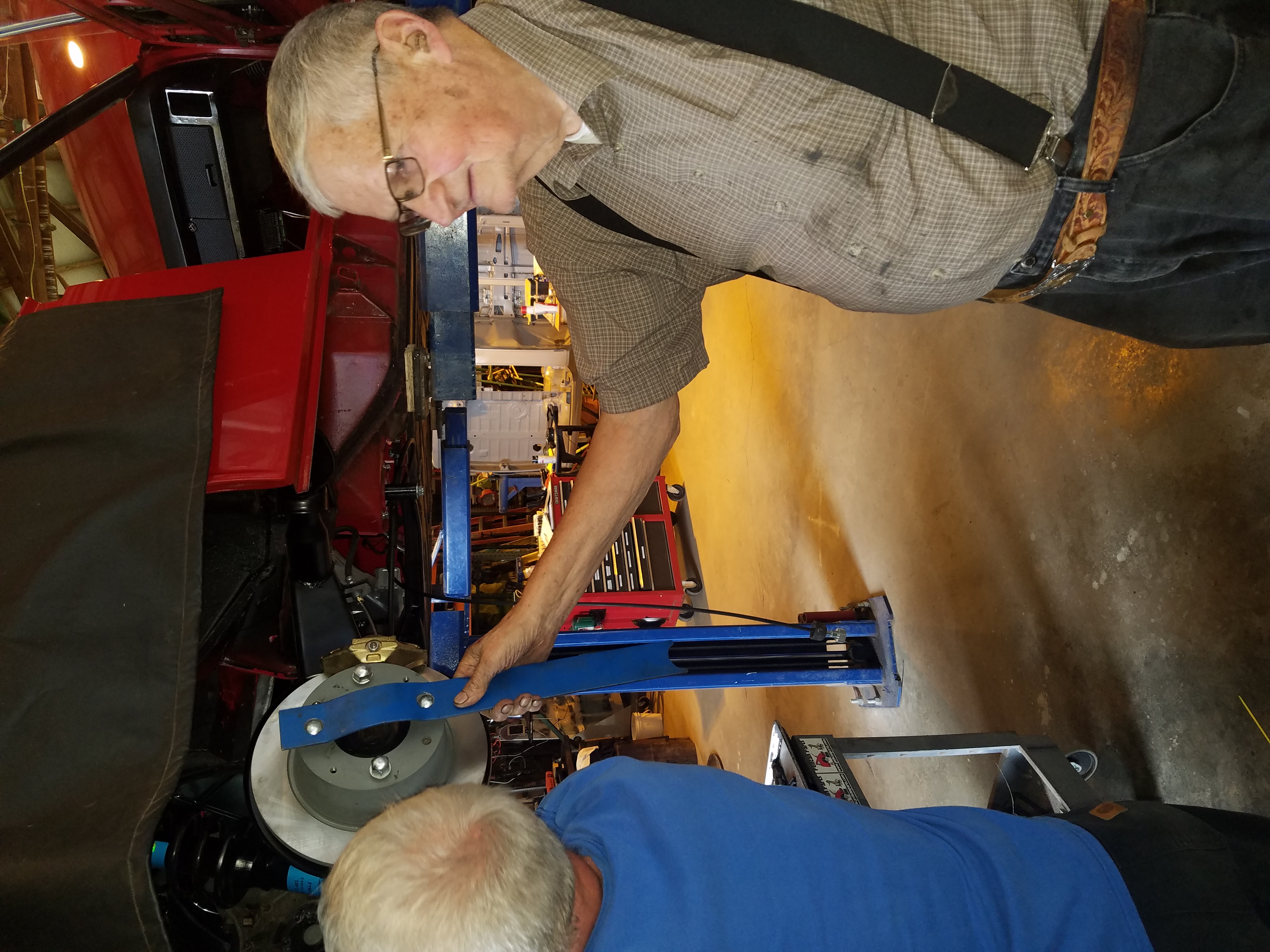 I'll try to post as much as I can but I keep nodding off. As usual Jack was incredible help today. Here is Fab tap a tool to hold the wheel in place while you're trying to tighten up half shafts. On a non pretty car the bar tucks under the suspension mount to let you torque the axles. Last night Jack just held it. |
