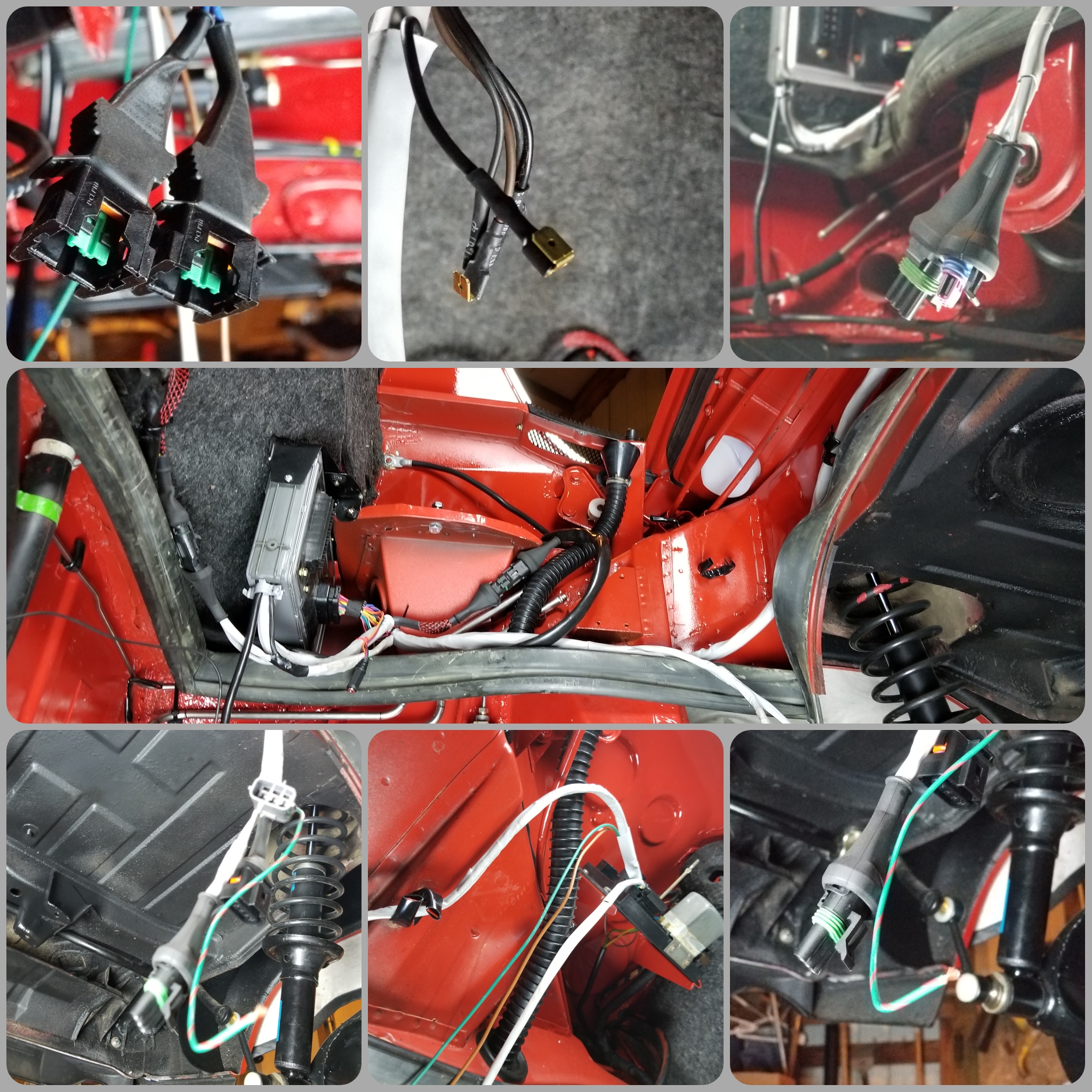 * Fuel supply. Plumb in the tank, pump and filter up front. * Matt finishes up the cockpit * Fuel supply engine end. Get the removal connections in a nice functional location. * Finish up the final WeatherPack connections in the harness. * Then the easy part, install the engine, half shafts and muffler. * Oh yeah. figure out where to route the O2 wire so engine drops are simple. Added cable wrap straps to trunk firewall to keep the harness up and out of the way. Makes it easy to drop the engine. They'll be trimmed to fit after final harness fitting ... ![]() ![]() Mocking up ECU mounting and cable dress out .............. ![]() The exposed wires at the connector will get wrapped in cloth tape as a final step. Porsche style. |