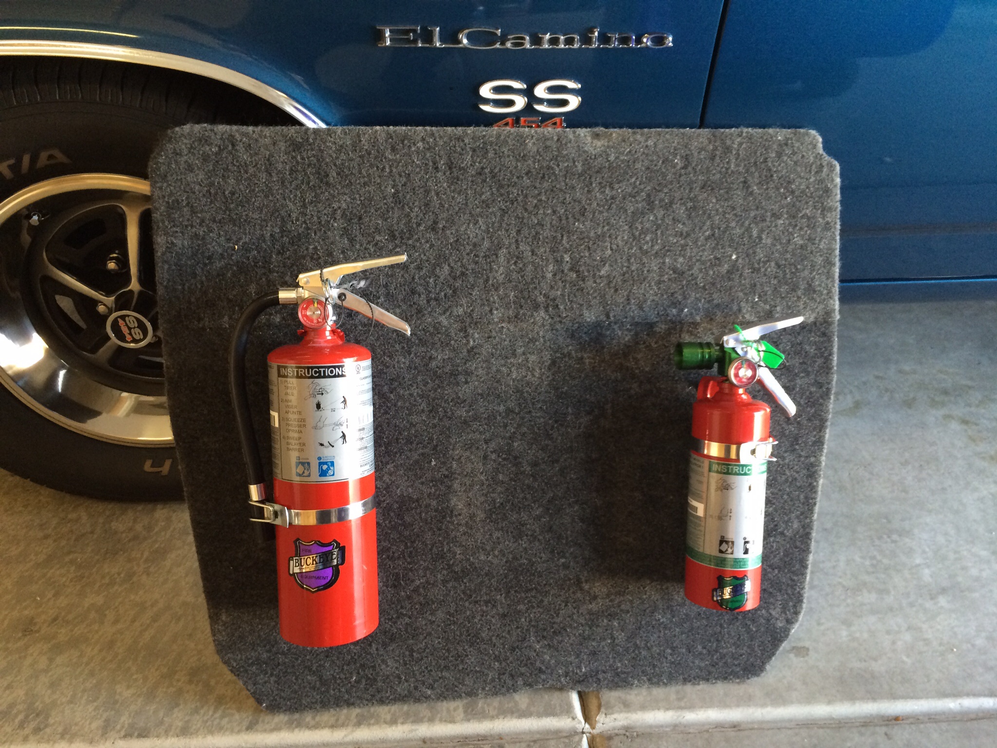 The larger Ext. is a purple K. This type does not have the corrisive residue that you would find in the A-B-C type extinguishers. Yes it is still a powder Ext. but washs off easier. This is a superior Ext. for fuel related fires. Tha smaller Ext. is a halotron which is best for electrical fires but not so good for fuel fires as it does not leave sufficient residue that would lay on top of the fuel and suppress the vapors. Bottom line: electrical fires in the interior grab the Halotron, fuel fires in the engine bay grab the Purple K. As far as my placement, I am sorry but those little extinguishers I have seen mounted in the interior would be like pissing in the wind on a fuel fire. Plus the fact is if the back of my 914 is on fire I want to get the Fuch out of there and not unhook a Ext. while doing so. Easy to unlatch the HOODS, get some distance away from the rear of the car and grab the appropriate Ext. Now if the front of my 914 is on fire then I am truly FUCHED. One last tip for any car you own if you are able to pull the hood release please do so. Trust me we have cause more damage trying to get a hood opened because the heat melted the hood release then the fire had caused. |